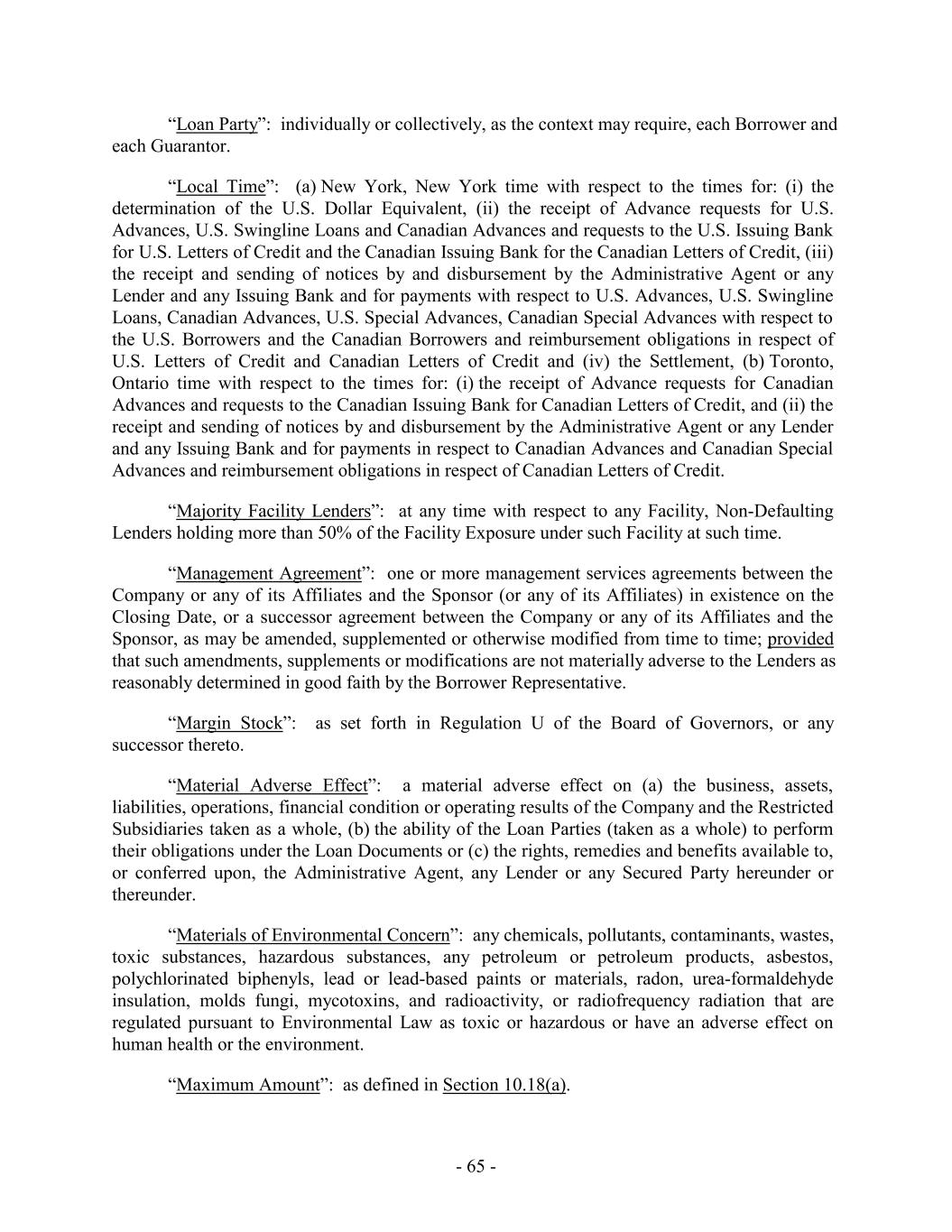 “Loan Party”: individually or collectively, as the context may require, each Borrower and each Guarantor. “Local Time”: (a) New York, New York time with respect to the times for: (i) the determination of the U.S. Dollar Equivalent, (ii) the receipt of Advance requests for U.S. Advances, U.S. Swingline Loans and Canadian Advances and requests to the U.S. Issuing Bank for U.S. Letters of Credit and the Canadian Issuing Bank for the Canadian Letters of Credit, (iii) the receipt and sending of notices by and disbursement by the Administrative Agent or any Lender and any Issuing Bank and for payments with respect to U.S. Advances, U.S. Swingline Loans, Canadian Advances, U.S. Special Advances, Canadian Special Advances with respect to the U.S. Borrowers and the Canadian Borrowers and reimbursement obligations in respect of U.S. Letters of Credit and Canadian Letters of Credit and (iv) the Settlement, (b) Toronto, Ontario time with respect to the times for: (i) the receipt of Advance requests for Canadian Advances and requests to the Canadian Issuing Bank for Canadian Letters of Credit, and (ii) the receipt and sending of notices by and disbursement by the Administrative Agent or any Lender and any Issuing Bank and for payments in respect to Canadian Advances and Canadian Special Advances and reimbursement obligations in respect of Canadian Letters of Credit. “Majority Facility Lenders”: at any time with respect to any Facility, Non-Defaulting Lenders holding more than 50% of the Facility Exposure under such Facility at such time. “Management Agreement”: one or more management services agreements between the Company or any of its Affiliates and the Sponsor (or any of its Affiliates) in existence on the Closing Date, or a successor agreement between the Company or any of its Affiliates and the Sponsor, as may be amended, supplemented or otherwise modified from time to time; provided that such amendments, supplements or modifications are not materially adverse to the Lenders as reasonably determined in good faith by the Borrower Representative. “Margin Stock”: as set forth in Regulation U of the Board of Governors, or any successor thereto. “Material Adverse Effect”: a material adverse effect on (a) the business, assets, liabilities, operations, financial condition or operating results of the Company and the Restricted Subsidiaries taken as a whole, (b) the ability of the Loan Parties (taken as a whole) to perform their obligations under the Loan Documents or (c) the rights, remedies and benefits available to, or conferred upon, the Administrative Agent, any Lender or any Secured Party hereunder or thereunder. “Materials of Environmental Concern”: any chemicals, pollutants, contaminants, wastes, toxic substances, hazardous substances, any petroleum or petroleum products, asbestos, polychlorinated biphenyls, lead or lead-based paints or materials, radon, urea-formaldehyde insulation, molds fungi, mycotoxins, and radioactivity, or radiofrequency radiation that are regulated pursuant to Environmental Law as toxic or hazardous or have an adverse effect on human health or the environment. “Maximum Amount”: as defined in Section 10.18(a). - 65 -