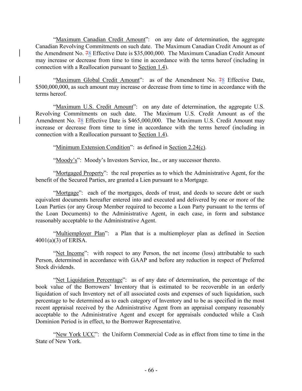 “Maximum Canadian Credit Amount”: on any date of determination, the aggregate Canadian Revolving Commitments on such date. The Maximum Canadian Credit Amount as of the Amendment No. 78 Effective Date is $35,000,000. The Maximum Canadian Credit Amount may increase or decrease from time to time in accordance with the terms hereof (including in connection with a Reallocation pursuant to Section 1.4). “Maximum Global Credit Amount”: as of the Amendment No. 78 Effective Date, $500,000,000, as such amount may increase or decrease from time to time in accordance with the terms hereof. “Maximum U.S. Credit Amount”: on any date of determination, the aggregate U.S. Revolving Commitments on such date. The Maximum U.S. Credit Amount as of the Amendment No. 78 Effective Date is $465,000,000. The Maximum U.S. Credit Amount may increase or decrease from time to time in accordance with the terms hereof (including in connection with a Reallocation pursuant to Section 1.4). “Minimum Extension Condition”: as defined in Section 2.24(c). “Moody’s”: Moody’s Investors Service, Inc., or any successor thereto. “Mortgaged Property”: the real properties as to which the Administrative Agent, for the benefit of the Secured Parties, are granted a Lien pursuant to a Mortgage. “Mortgage”: each of the mortgages, deeds of trust, and deeds to secure debt or such equivalent documents hereafter entered into and executed and delivered by one or more of the Loan Parties (or any Group Member required to become a Loan Party pursuant to the terms of the Loan Documents) to the Administrative Agent, in each case, in form and substance reasonably acceptable to the Administrative Agent. “Multiemployer Plan”: a Plan that is a multiemployer plan as defined in Section 4001(a)(3) of ERISA. “Net Income”: with respect to any Person, the net income (loss) attributable to such Person, determined in accordance with GAAP and before any reduction in respect of Preferred Stock dividends. “Net Liquidation Percentage”: as of any date of determination, the percentage of the book value of the Borrowers’ Inventory that is estimated to be recoverable in an orderly liquidation of such Inventory net of all associated costs and expenses of such liquidation, such percentage to be determined as to each category of Inventory and to be as specified in the most recent appraisal received by the Administrative Agent from an appraisal company reasonably acceptable to the Administrative Agent and except for appraisals conducted while a Cash Dominion Period is in effect, to the Borrower Representative. “New York UCC”: the Uniform Commercial Code as in effect from time to time in the State of New York. - 66 -