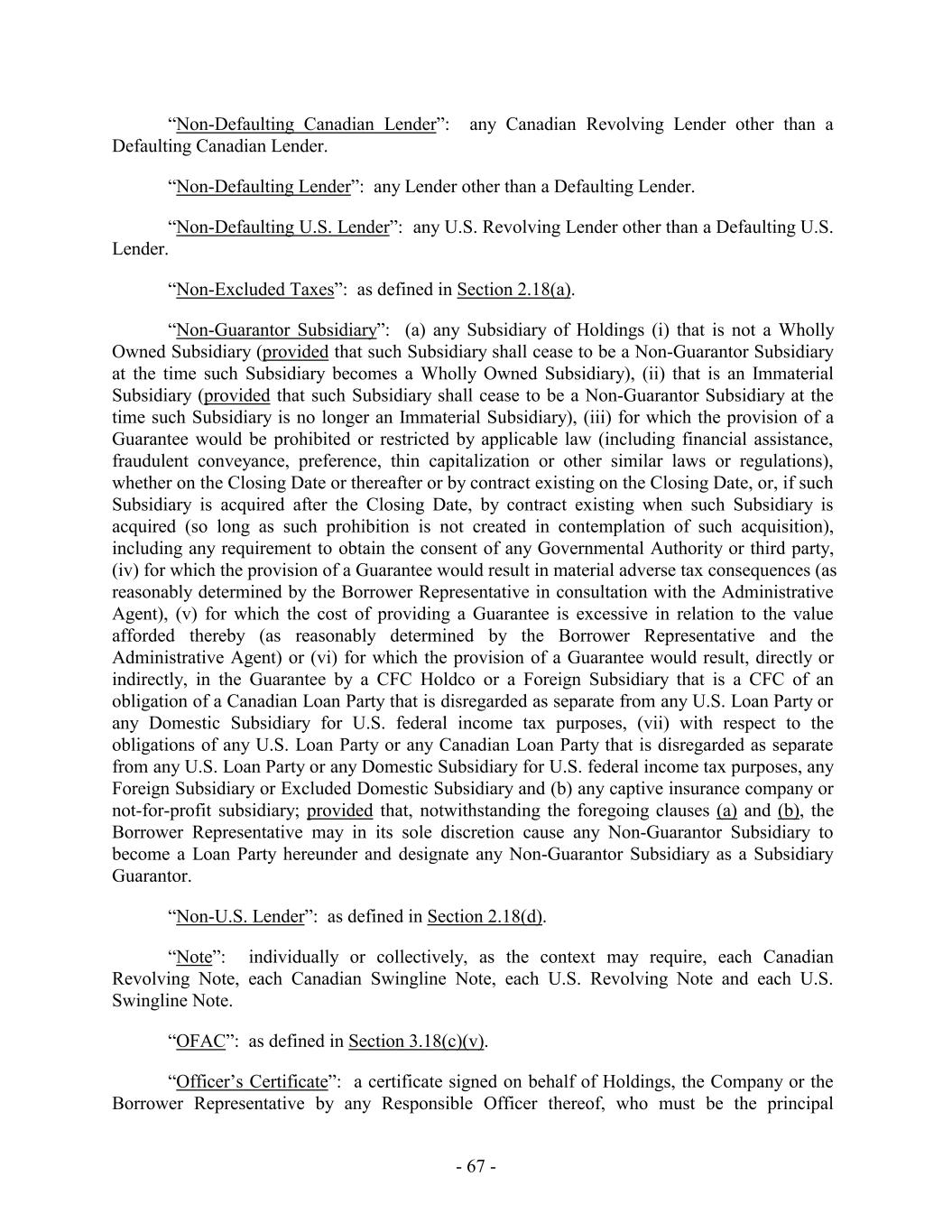 “Non-Defaulting Canadian Lender”: any Canadian Revolving Lender other than a Defaulting Canadian Lender. “Non-Defaulting Lender”: any Lender other than a Defaulting Lender. “Non-Defaulting U.S. Lender”: any U.S. Revolving Lender other than a Defaulting U.S. Lender. “Non-Excluded Taxes”: as defined in Section 2.18(a). “Non-Guarantor Subsidiary”: (a) any Subsidiary of Holdings (i) that is not a Wholly Owned Subsidiary (provided that such Subsidiary shall cease to be a Non-Guarantor Subsidiary at the time such Subsidiary becomes a Wholly Owned Subsidiary), (ii) that is an Immaterial Subsidiary (provided that such Subsidiary shall cease to be a Non-Guarantor Subsidiary at the time such Subsidiary is no longer an Immaterial Subsidiary), (iii) for which the provision of a Guarantee would be prohibited or restricted by applicable law (including financial assistance, fraudulent conveyance, preference, thin capitalization or other similar laws or regulations), whether on the Closing Date or thereafter or by contract existing on the Closing Date, or, if such Subsidiary is acquired after the Closing Date, by contract existing when such Subsidiary is acquired (so long as such prohibition is not created in contemplation of such acquisition), including any requirement to obtain the consent of any Governmental Authority or third party, (iv) for which the provision of a Guarantee would result in material adverse tax consequences (as reasonably determined by the Borrower Representative in consultation with the Administrative Agent), (v) for which the cost of providing a Guarantee is excessive in relation to the value afforded thereby (as reasonably determined by the Borrower Representative and the Administrative Agent) or (vi) for which the provision of a Guarantee would result, directly or indirectly, in the Guarantee by a CFC Holdco or a Foreign Subsidiary that is a CFC of an obligation of a Canadian Loan Party that is disregarded as separate from any U.S. Loan Party or any Domestic Subsidiary for U.S. federal income tax purposes, (vii) with respect to the obligations of any U.S. Loan Party or any Canadian Loan Party that is disregarded as separate from any U.S. Loan Party or any Domestic Subsidiary for U.S. federal income tax purposes, any Foreign Subsidiary or Excluded Domestic Subsidiary and (b) any captive insurance company or not-for-profit subsidiary; provided that, notwithstanding the foregoing clauses (a) and (b), the Borrower Representative may in its sole discretion cause any Non-Guarantor Subsidiary to become a Loan Party hereunder and designate any Non-Guarantor Subsidiary as a Subsidiary Guarantor. “Non-U.S. Lender”: as defined in Section 2.18(d). “Note”: individually or collectively, as the context may require, each Canadian Revolving Note, each Canadian Swingline Note, each U.S. Revolving Note and each U.S. Swingline Note. “OFAC”: as defined in Section 3.18(c)(v). “Officer’s Certificate”: a certificate signed on behalf of Holdings, the Company or the Borrower Representative by any Responsible Officer thereof, who must be the principal - 67 -