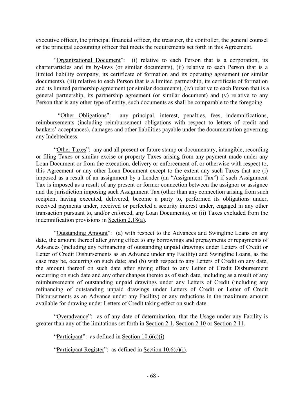executive officer, the principal financial officer, the treasurer, the controller, the general counsel or the principal accounting officer that meets the requirements set forth in this Agreement. “Organizational Document”: (i) relative to each Person that is a corporation, its charter/articles and its by-laws (or similar documents), (ii) relative to each Person that is a limited liability company, its certificate of formation and its operating agreement (or similar documents), (iii) relative to each Person that is a limited partnership, its certificate of formation and its limited partnership agreement (or similar documents), (iv) relative to each Person that is a general partnership, its partnership agreement (or similar document) and (v) relative to any Person that is any other type of entity, such documents as shall be comparable to the foregoing. “Other Obligations”: any principal, interest, penalties, fees, indemnifications, reimbursements (including reimbursement obligations with respect to letters of credit and bankers’ acceptances), damages and other liabilities payable under the documentation governing any Indebtedness. “Other Taxes”: any and all present or future stamp or documentary, intangible, recording or filing Taxes or similar excise or property Taxes arising from any payment made under any Loan Document or from the execution, delivery or enforcement of, or otherwise with respect to, this Agreement or any other Loan Document except to the extent any such Taxes that are (i) imposed as a result of an assignment by a Lender (an “Assignment Tax”) if such Assignment Tax is imposed as a result of any present or former connection between the assignor or assignee and the jurisdiction imposing such Assignment Tax (other than any connection arising from such recipient having executed, delivered, become a party to, performed its obligations under, received payments under, received or perfected a security interest under, engaged in any other transaction pursuant to, and/or enforced, any Loan Documents), or (ii) Taxes excluded from the indemnification provisions in Section 2.18(a). “Outstanding Amount”: (a) with respect to the Advances and Swingline Loans on any date, the amount thereof after giving effect to any borrowings and prepayments or repayments of Advances (including any refinancing of outstanding unpaid drawings under Letters of Credit or Letter of Credit Disbursements as an Advance under any Facility) and Swingline Loans, as the case may be, occurring on such date; and (b) with respect to any Letters of Credit on any date, the amount thereof on such date after giving effect to any Letter of Credit Disbursement occurring on such date and any other changes thereto as of such date, including as a result of any reimbursements of outstanding unpaid drawings under any Letters of Credit (including any refinancing of outstanding unpaid drawings under Letters of Credit or Letter of Credit Disbursements as an Advance under any Facility) or any reductions in the maximum amount available for drawing under Letters of Credit taking effect on such date. “Overadvance”: as of any date of determination, that the Usage under any Facility is greater than any of the limitations set forth in Section 2.1, Section 2.10 or Section 2.11. “Participant”: as defined in Section 10.6(c)(i). “Participant Register”: as defined in Section 10.6(c)(i). - 68 -