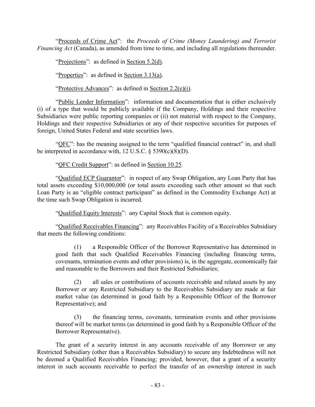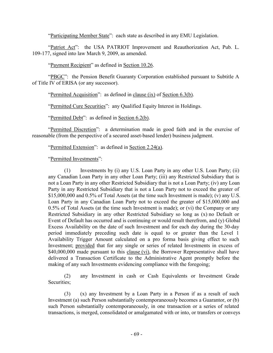 “Participating Member State”: each state as described in any EMU Legislation. “Patriot Act”: the USA PATRIOT Improvement and Reauthorization Act, Pub. L. 109-177, signed into law March 9, 2009, as amended. “Payment Recipient” as defined in Section 10.26. “PBGC”: the Pension Benefit Guaranty Corporation established pursuant to Subtitle A of Title IV of ERISA (or any successor). “Permitted Acquisition”: as defined in clause (ix) of Section 6.3(b). “Permitted Cure Securities”: any Qualified Equity Interest in Holdings. “Permitted Debt”: as defined in Section 6.2(b). “Permitted Discretion”: a determination made in good faith and in the exercise of reasonable (from the perspective of a secured asset-based lender) business judgment. “Permitted Extension”: as defined in Section 2.24(a). “Permitted Investments”: (1) Investments by (i) any U.S. Loan Party in any other U.S. Loan Party; (ii) any Canadian Loan Party in any other Loan Party; (iii) any Restricted Subsidiary that is not a Loan Party in any other Restricted Subsidiary that is not a Loan Party; (iv) any Loan Party in any Restricted Subsidiary that is not a Loan Party not to exceed the greater of $15,000,000 and 0.5% of Total Assets (at the time such Investment is made); (v) any U.S. Loan Party in any Canadian Loan Party not to exceed the greater of $15,000,000 and 0.5% of Total Assets (at the time such Investment is made); or (vi) the Company or any Restricted Subsidiary in any other Restricted Subsidiary so long as (x) no Default or Event of Default has occurred and is continuing or would result therefrom, and (y) Global Excess Availability on the date of such Investment and for each day during the 30-day period immediately preceding such date is equal to or greater than the Level 1 Availability Trigger Amount calculated on a pro forma basis giving effect to such Investment; provided that for any single or series of related Investments in excess of $40,000,000 made pursuant to this clause (vi), the Borrower Representative shall have delivered a Transaction Certificate to the Administrative Agent promptly before the making of any such Investments evidencing compliance with the foregoing; (2) any Investment in cash or Cash Equivalents or Investment Grade Securities; (3) (x) any Investment by a Loan Party in a Person if as a result of such Investment (a) such Person substantially contemporaneously becomes a Guarantor, or (b) such Person substantially contemporaneously, in one transaction or a series of related transactions, is merged, consolidated or amalgamated with or into, or transfers or conveys - 69 -