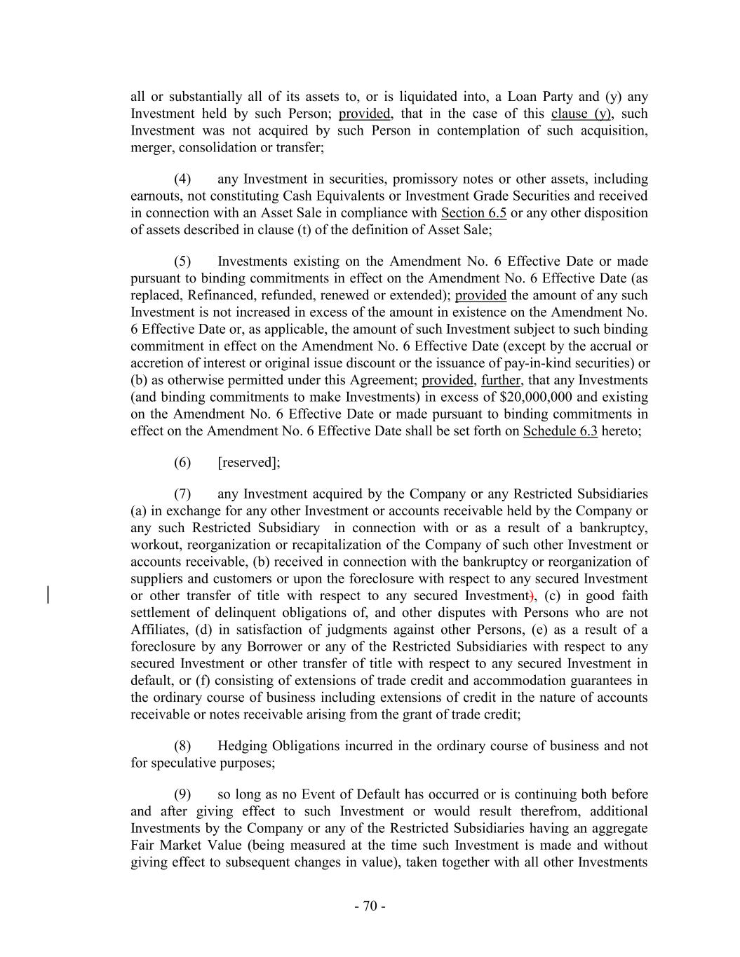 all or substantially all of its assets to, or is liquidated into, a Loan Party and (y) any Investment held by such Person; provided, that in the case of this clause (y), such Investment was not acquired by such Person in contemplation of such acquisition, merger, consolidation or transfer; (4) any Investment in securities, promissory notes or other assets, including earnouts, not constituting Cash Equivalents or Investment Grade Securities and received in connection with an Asset Sale in compliance with Section 6.5 or any other disposition of assets described in clause (t) of the definition of Asset Sale; (5) Investments existing on the Amendment No. 6 Effective Date or made pursuant to binding commitments in effect on the Amendment No. 6 Effective Date (as replaced, Refinanced, refunded, renewed or extended); provided the amount of any such Investment is not increased in excess of the amount in existence on the Amendment No. 6 Effective Date or, as applicable, the amount of such Investment subject to such binding commitment in effect on the Amendment No. 6 Effective Date (except by the accrual or accretion of interest or original issue discount or the issuance of pay-in-kind securities) or (b) as otherwise permitted under this Agreement; provided, further, that any Investments (and binding commitments to make Investments) in excess of $20,000,000 and existing on the Amendment No. 6 Effective Date or made pursuant to binding commitments in effect on the Amendment No. 6 Effective Date shall be set forth on Schedule 6.3 hereto; (6) [reserved]; (7) any Investment acquired by the Company or any Restricted Subsidiaries (a) in exchange for any other Investment or accounts receivable held by the Company or any such Restricted Subsidiary in connection with or as a result of a bankruptcy, workout, reorganization or recapitalization of the Company of such other Investment or accounts receivable, (b) received in connection with the bankruptcy or reorganization of suppliers and customers or upon the foreclosure with respect to any secured Investment or other transfer of title with respect to any secured Investment), (c) in good faith settlement of delinquent obligations of, and other disputes with Persons who are not Affiliates, (d) in satisfaction of judgments against other Persons, (e) as a result of a foreclosure by any Borrower or any of the Restricted Subsidiaries with respect to any secured Investment or other transfer of title with respect to any secured Investment in default, or (f) consisting of extensions of trade credit and accommodation guarantees in the ordinary course of business including extensions of credit in the nature of accounts receivable or notes receivable arising from the grant of trade credit; (8) Hedging Obligations incurred in the ordinary course of business and not for speculative purposes; (9) so long as no Event of Default has occurred or is continuing both before and after giving effect to such Investment or would result therefrom, additional Investments by the Company or any of the Restricted Subsidiaries having an aggregate Fair Market Value (being measured at the time such Investment is made and without giving effect to subsequent changes in value), taken together with all other Investments - 70 -