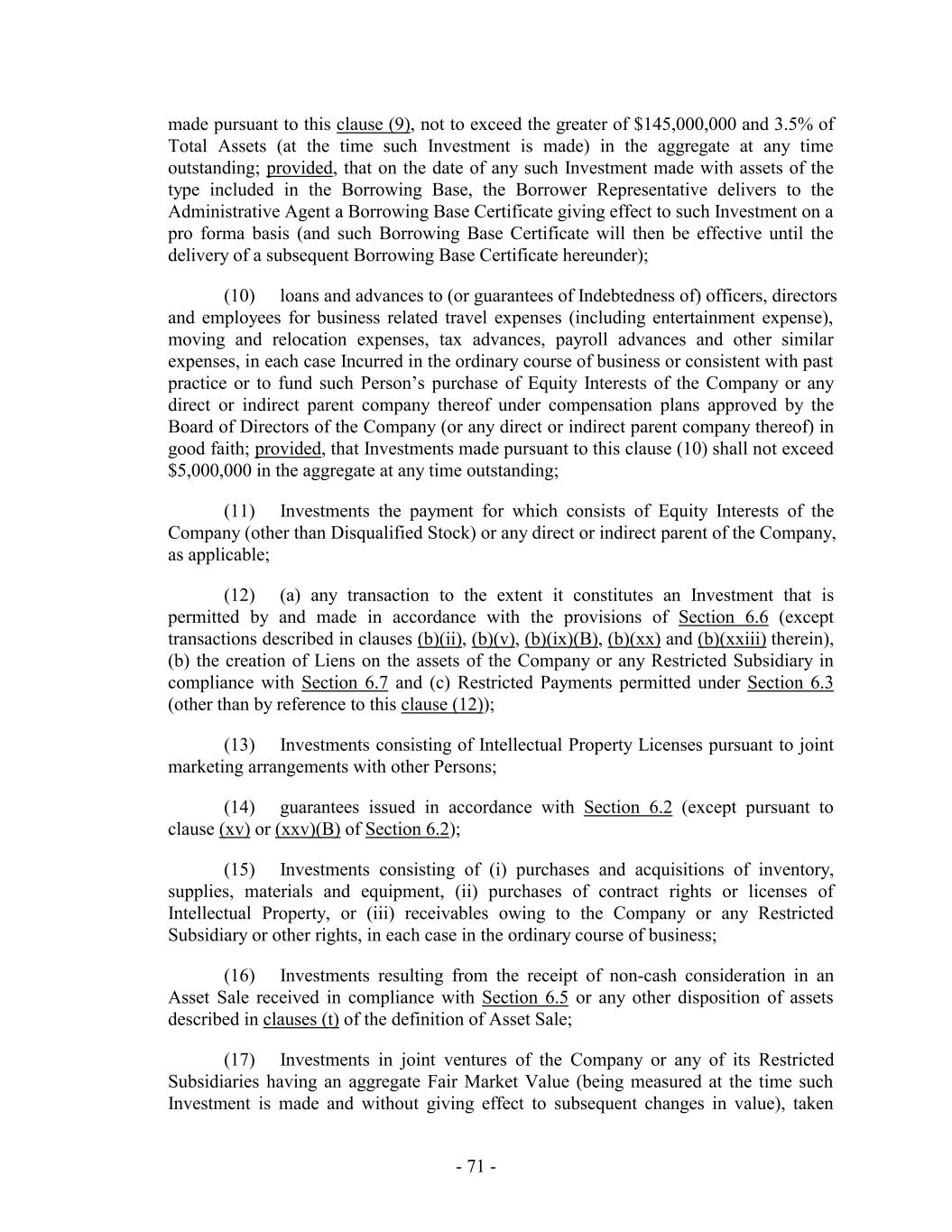 made pursuant to this clause (9), not to exceed the greater of $145,000,000 and 3.5% of Total Assets (at the time such Investment is made) in the aggregate at any time outstanding; provided, that on the date of any such Investment made with assets of the type included in the Borrowing Base, the Borrower Representative delivers to the Administrative Agent a Borrowing Base Certificate giving effect to such Investment on a pro forma basis (and such Borrowing Base Certificate will then be effective until the delivery of a subsequent Borrowing Base Certificate hereunder); (10) loans and advances to (or guarantees of Indebtedness of) officers, directors and employees for business related travel expenses (including entertainment expense), moving and relocation expenses, tax advances, payroll advances and other similar expenses, in each case Incurred in the ordinary course of business or consistent with past practice or to fund such Person’s purchase of Equity Interests of the Company or any direct or indirect parent company thereof under compensation plans approved by the Board of Directors of the Company (or any direct or indirect parent company thereof) in good faith; provided, that Investments made pursuant to this clause (10) shall not exceed $5,000,000 in the aggregate at any time outstanding; (11) Investments the payment for which consists of Equity Interests of the Company (other than Disqualified Stock) or any direct or indirect parent of the Company, as applicable; (12) (a) any transaction to the extent it constitutes an Investment that is permitted by and made in accordance with the provisions of Section 6.6 (except transactions described in clauses (b)(ii), (b)(v), (b)(ix)(B), (b)(xx) and (b)(xxiii) therein), (b) the creation of Liens on the assets of the Company or any Restricted Subsidiary in compliance with Section 6.7 and (c) Restricted Payments permitted under Section 6.3 (other than by reference to this clause (12)); (13) Investments consisting of Intellectual Property Licenses pursuant to joint marketing arrangements with other Persons; (14) guarantees issued in accordance with Section 6.2 (except pursuant to clause (xv) or (xxv)(B) of Section 6.2); (15) Investments consisting of (i) purchases and acquisitions of inventory, supplies, materials and equipment, (ii) purchases of contract rights or licenses of Intellectual Property, or (iii) receivables owing to the Company or any Restricted Subsidiary or other rights, in each case in the ordinary course of business; (16) Investments resulting from the receipt of non-cash consideration in an Asset Sale received in compliance with Section 6.5 or any other disposition of assets described in clauses (t) of the definition of Asset Sale; (17) Investments in joint ventures of the Company or any of its Restricted Subsidiaries having an aggregate Fair Market Value (being measured at the time such Investment is made and without giving effect to subsequent changes in value), taken - 71 -