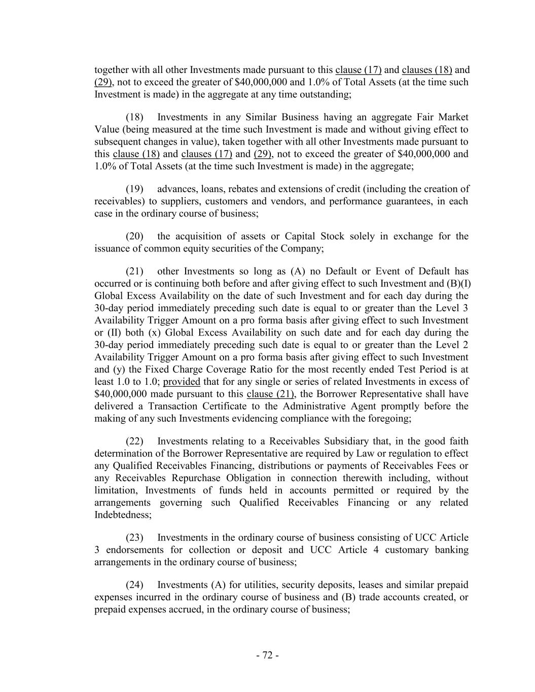 together with all other Investments made pursuant to this clause (17) and clauses (18) and (29), not to exceed the greater of $40,000,000 and 1.0% of Total Assets (at the time such Investment is made) in the aggregate at any time outstanding; (18) Investments in any Similar Business having an aggregate Fair Market Value (being measured at the time such Investment is made and without giving effect to subsequent changes in value), taken together with all other Investments made pursuant to this clause (18) and clauses (17) and (29), not to exceed the greater of $40,000,000 and 1.0% of Total Assets (at the time such Investment is made) in the aggregate; (19) advances, loans, rebates and extensions of credit (including the creation of receivables) to suppliers, customers and vendors, and performance guarantees, in each case in the ordinary course of business; (20) the acquisition of assets or Capital Stock solely in exchange for the issuance of common equity securities of the Company; (21) other Investments so long as (A) no Default or Event of Default has occurred or is continuing both before and after giving effect to such Investment and (B)(I) Global Excess Availability on the date of such Investment and for each day during the 30-day period immediately preceding such date is equal to or greater than the Level 3 Availability Trigger Amount on a pro forma basis after giving effect to such Investment or (II) both (x) Global Excess Availability on such date and for each day during the 30-day period immediately preceding such date is equal to or greater than the Level 2 Availability Trigger Amount on a pro forma basis after giving effect to such Investment and (y) the Fixed Charge Coverage Ratio for the most recently ended Test Period is at least 1.0 to 1.0; provided that for any single or series of related Investments in excess of $40,000,000 made pursuant to this clause (21), the Borrower Representative shall have delivered a Transaction Certificate to the Administrative Agent promptly before the making of any such Investments evidencing compliance with the foregoing; (22) Investments relating to a Receivables Subsidiary that, in the good faith determination of the Borrower Representative are required by Law or regulation to effect any Qualified Receivables Financing, distributions or payments of Receivables Fees or any Receivables Repurchase Obligation in connection therewith including, without limitation, Investments of funds held in accounts permitted or required by the arrangements governing such Qualified Receivables Financing or any related Indebtedness; (23) Investments in the ordinary course of business consisting of UCC Article 3 endorsements for collection or deposit and UCC Article 4 customary banking arrangements in the ordinary course of business; (24) Investments (A) for utilities, security deposits, leases and similar prepaid expenses incurred in the ordinary course of business and (B) trade accounts created, or prepaid expenses accrued, in the ordinary course of business; - 72 -