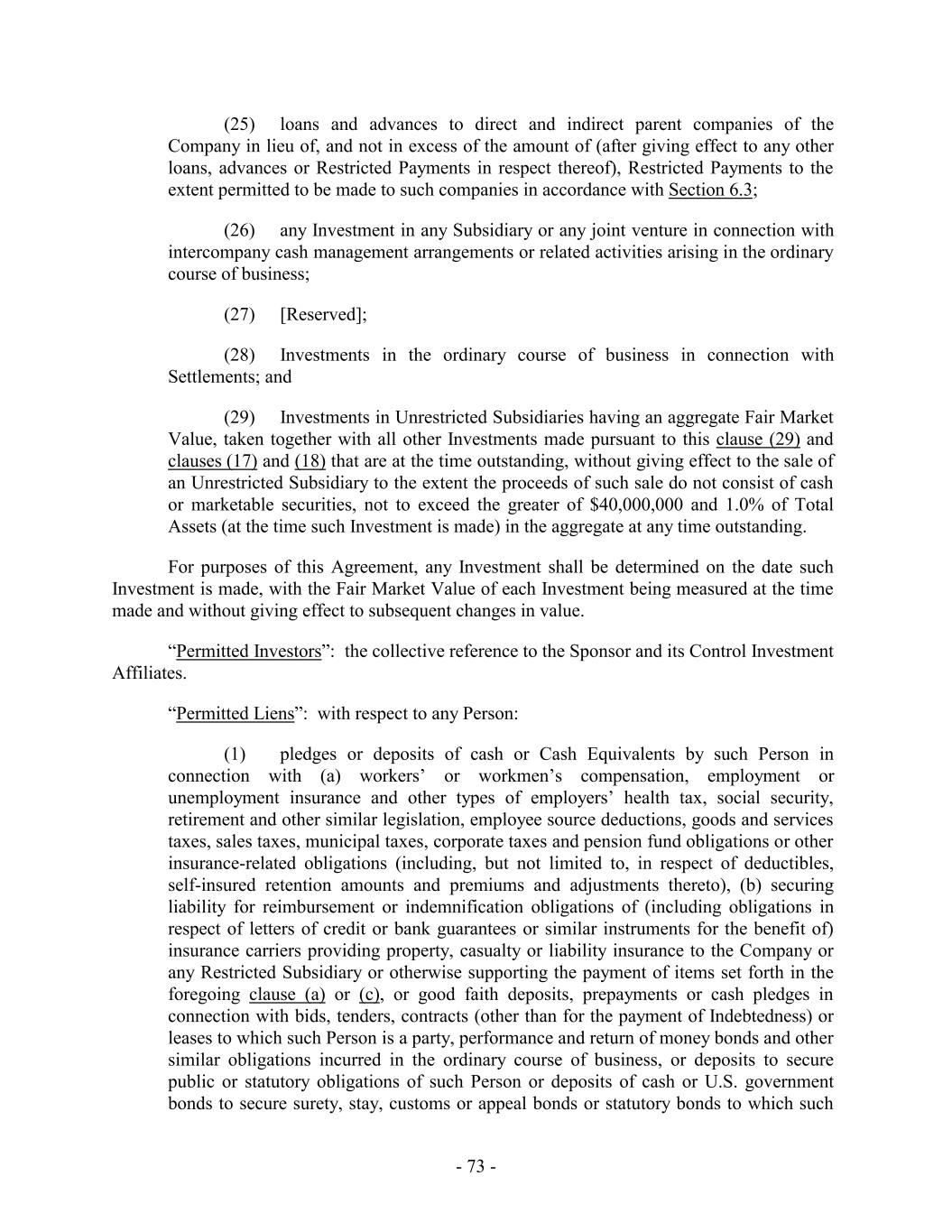 (25) loans and advances to direct and indirect parent companies of the Company in lieu of, and not in excess of the amount of (after giving effect to any other loans, advances or Restricted Payments in respect thereof), Restricted Payments to the extent permitted to be made to such companies in accordance with Section 6.3; (26) any Investment in any Subsidiary or any joint venture in connection with intercompany cash management arrangements or related activities arising in the ordinary course of business; (27) [Reserved]; (28) Investments in the ordinary course of business in connection with Settlements; and (29) Investments in Unrestricted Subsidiaries having an aggregate Fair Market Value, taken together with all other Investments made pursuant to this clause (29) and clauses (17) and (18) that are at the time outstanding, without giving effect to the sale of an Unrestricted Subsidiary to the extent the proceeds of such sale do not consist of cash or marketable securities, not to exceed the greater of $40,000,000 and 1.0% of Total Assets (at the time such Investment is made) in the aggregate at any time outstanding. For purposes of this Agreement, any Investment shall be determined on the date such Investment is made, with the Fair Market Value of each Investment being measured at the time made and without giving effect to subsequent changes in value. “Permitted Investors”: the collective reference to the Sponsor and its Control Investment Affiliates. “Permitted Liens”: with respect to any Person: (1) pledges or deposits of cash or Cash Equivalents by such Person in connection with (a) workers’ or workmen’s compensation, employment or unemployment insurance and other types of employers’ health tax, social security, retirement and other similar legislation, employee source deductions, goods and services taxes, sales taxes, municipal taxes, corporate taxes and pension fund obligations or other insurance-related obligations (including, but not limited to, in respect of deductibles, self-insured retention amounts and premiums and adjustments thereto), (b) securing liability for reimbursement or indemnification obligations of (including obligations in respect of letters of credit or bank guarantees or similar instruments for the benefit of) insurance carriers providing property, casualty or liability insurance to the Company or any Restricted Subsidiary or otherwise supporting the payment of items set forth in the foregoing clause (a) or (c), or good faith deposits, prepayments or cash pledges in connection with bids, tenders, contracts (other than for the payment of Indebtedness) or leases to which such Person is a party, performance and return of money bonds and other similar obligations incurred in the ordinary course of business, or deposits to secure public or statutory obligations of such Person or deposits of cash or U.S. government bonds to secure surety, stay, customs or appeal bonds or statutory bonds to which such - 73 -