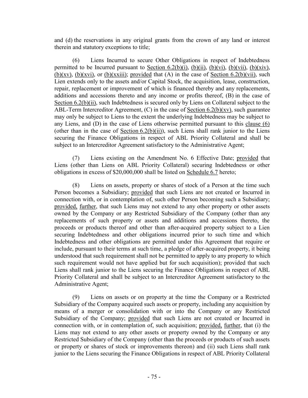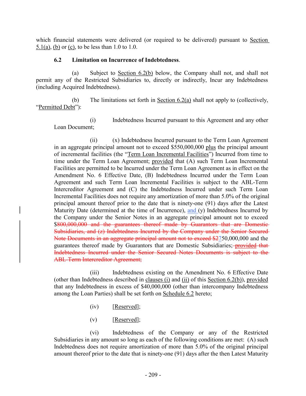 which financial statements were delivered (or required to be delivered) pursuant to Section 5.1(a), (b) or (c), to be less than 1.0 to 1.0. 6.2 Limitation on Incurrence of Indebtedness. (a) Subject to Section 6.2(b) below, the Company shall not, and shall not permit any of the Restricted Subsidiaries to, directly or indirectly, Incur any Indebtedness (including Acquired Indebtedness). (b) The limitations set forth in Section 6.2(a) shall not apply to (collectively, “Permitted Debt”): (i) Indebtedness Incurred pursuant to this Agreement and any other Loan Document; (ii) (x) Indebtedness Incurred pursuant to the Term Loan Agreement in an aggregate principal amount not to exceed $550,000,000 plus the principal amount of incremental facilities (the “Term Loan Incremental Facilities”) Incurred from time to time under the Term Loan Agreement; provided that (A) such Term Loan Incremental Facilities are permitted to be Incurred under the Term Loan Agreement as in effect on the Amendment No. 6 Effective Date, (B) Indebtedness Incurred under the Term Loan Agreement and such Term Loan Incremental Facilities is subject to the ABL-Term Intercreditor Agreement and (C) the Indebtedness Incurred under such Term Loan Incremental Facilities does not require any amortization of more than 5.0% of the original principal amount thereof prior to the date that is ninety-one (91) days after the Latest Maturity Date (determined at the time of Incurrence), and (y) Indebtedness Incurred by the Company under the Senior Notes in an aggregate principal amount not to exceed $800,000,000 and the guarantees thereof made by Guarantors that are Domestic Subsidiaries, and (z) Indebtedness Incurred by the Company under the Senior Secured Note Documents in an aggregate principal amount not to exceed $2750,000,000 and the guarantees thereof made by Guarantors that are Domestic Subsidiaries; provided that Indebtedness Incurred under the Senior Secured Notes Documents is subject to the ABL-Term Intercreditor Agreement; (iii) Indebtedness existing on the Amendment No. 6 Effective Date (other than Indebtedness described in clauses (i) and (ii) of this Section 6.2(b)), provided that any Indebtedness in excess of $40,000,000 (other than intercompany Indebtedness among the Loan Parties) shall be set forth on Schedule 6.2 hereto; (iv) [Reserved]; (v) [Reserved]; (vi) Indebtedness of the Company or any of the Restricted Subsidiaries in any amount so long as each of the following conditions are met: (A) such Indebtedness does not require amortization of more than 5.0% of the original principal amount thereof prior to the date that is ninety-one (91) days after the then Latest Maturity - 209 -