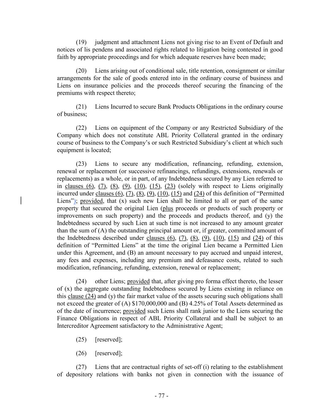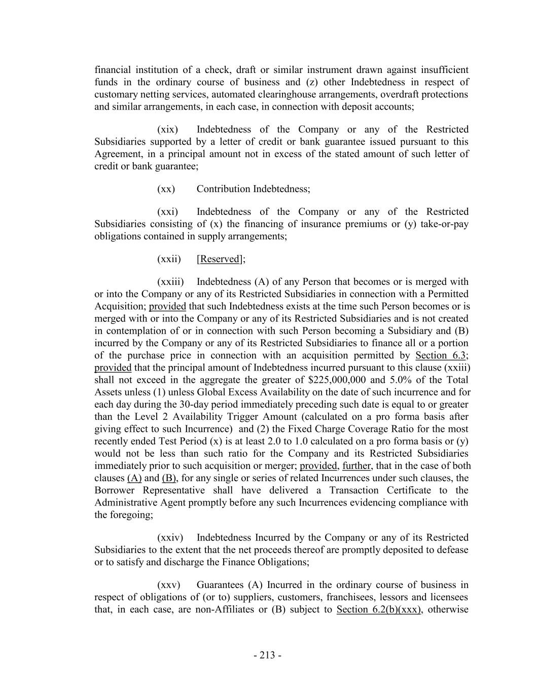financial institution of a check, draft or similar instrument drawn against insufficient funds in the ordinary course of business and (z) other Indebtedness in respect of customary netting services, automated clearinghouse arrangements, overdraft protections and similar arrangements, in each case, in connection with deposit accounts; (xix) Indebtedness of the Company or any of the Restricted Subsidiaries supported by a letter of credit or bank guarantee issued pursuant to this Agreement, in a principal amount not in excess of the stated amount of such letter of credit or bank guarantee; (xx) Contribution Indebtedness; (xxi) Indebtedness of the Company or any of the Restricted Subsidiaries consisting of (x) the financing of insurance premiums or (y) take-or-pay obligations contained in supply arrangements; (xxii) [Reserved]; (xxiii) Indebtedness (A) of any Person that becomes or is merged with or into the Company or any of its Restricted Subsidiaries in connection with a Permitted Acquisition; provided that such Indebtedness exists at the time such Person becomes or is merged with or into the Company or any of its Restricted Subsidiaries and is not created in contemplation of or in connection with such Person becoming a Subsidiary and (B) incurred by the Company or any of its Restricted Subsidiaries to finance all or a portion of the purchase price in connection with an acquisition permitted by Section 6.3; provided that the principal amount of Indebtedness incurred pursuant to this clause (xxiii) shall not exceed in the aggregate the greater of $225,000,000 and 5.0% of the Total Assets unless (1) unless Global Excess Availability on the date of such incurrence and for each day during the 30-day period immediately preceding such date is equal to or greater than the Level 2 Availability Trigger Amount (calculated on a pro forma basis after giving effect to such Incurrence) and (2) the Fixed Charge Coverage Ratio for the most recently ended Test Period (x) is at least 2.0 to 1.0 calculated on a pro forma basis or (y) would not be less than such ratio for the Company and its Restricted Subsidiaries immediately prior to such acquisition or merger; provided, further, that in the case of both clauses (A) and (B), for any single or series of related Incurrences under such clauses, the Borrower Representative shall have delivered a Transaction Certificate to the Administrative Agent promptly before any such Incurrences evidencing compliance with the foregoing; (xxiv) Indebtedness Incurred by the Company or any of its Restricted Subsidiaries to the extent that the net proceeds thereof are promptly deposited to defease or to satisfy and discharge the Finance Obligations; (xxv) Guarantees (A) Incurred in the ordinary course of business in respect of obligations of (or to) suppliers, customers, franchisees, lessors and licensees that, in each case, are non-Affiliates or (B) subject to Section 6.2(b)(xxx), otherwise - 213 -