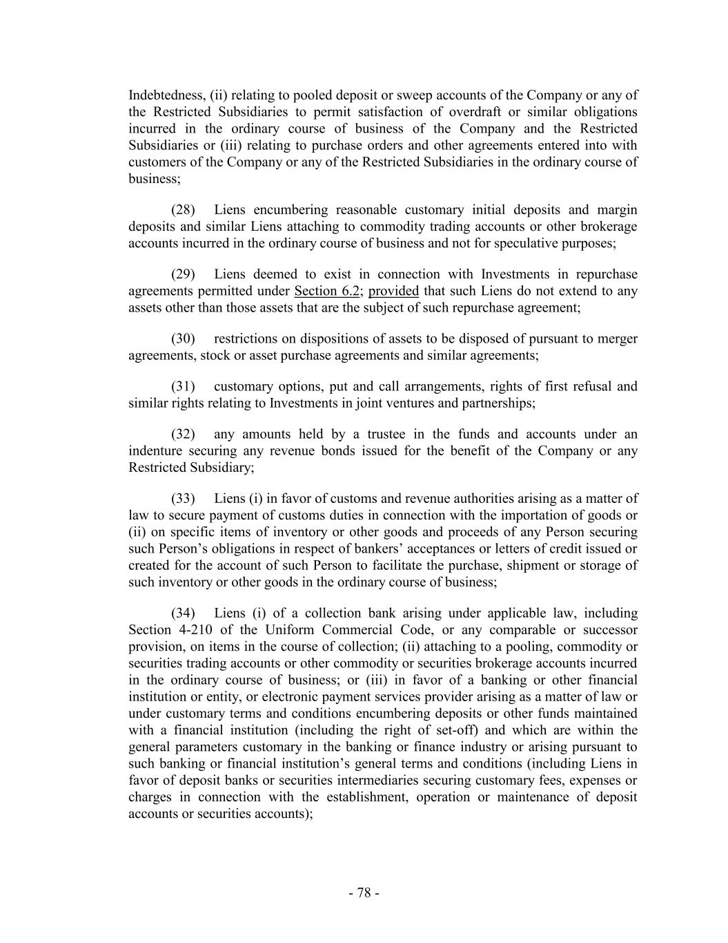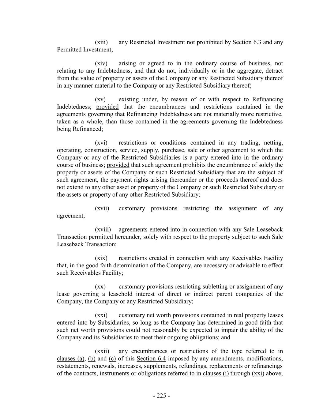 (xiii) any Restricted Investment not prohibited by Section 6.3 and any Permitted Investment; (xiv) arising or agreed to in the ordinary course of business, not relating to any Indebtedness, and that do not, individually or in the aggregate, detract from the value of property or assets of the Company or any Restricted Subsidiary thereof in any manner material to the Company or any Restricted Subsidiary thereof; (xv) existing under, by reason of or with respect to Refinancing Indebtedness; provided that the encumbrances and restrictions contained in the agreements governing that Refinancing Indebtedness are not materially more restrictive, taken as a whole, than those contained in the agreements governing the Indebtedness being Refinanced; (xvi) restrictions or conditions contained in any trading, netting, operating, construction, service, supply, purchase, sale or other agreement to which the Company or any of the Restricted Subsidiaries is a party entered into in the ordinary course of business; provided that such agreement prohibits the encumbrance of solely the property or assets of the Company or such Restricted Subsidiary that are the subject of such agreement, the payment rights arising thereunder or the proceeds thereof and does not extend to any other asset or property of the Company or such Restricted Subsidiary or the assets or property of any other Restricted Subsidiary; (xvii) customary provisions restricting the assignment of any agreement; (xviii) agreements entered into in connection with any Sale Leaseback Transaction permitted hereunder, solely with respect to the property subject to such Sale Leaseback Transaction; (xix) restrictions created in connection with any Receivables Facility that, in the good faith determination of the Company, are necessary or advisable to effect such Receivables Facility; (xx) customary provisions restricting subletting or assignment of any lease governing a leasehold interest of direct or indirect parent companies of the Company, the Company or any Restricted Subsidiary; (xxi) customary net worth provisions contained in real property leases entered into by Subsidiaries, so long as the Company has determined in good faith that such net worth provisions could not reasonably be expected to impair the ability of the Company and its Subsidiaries to meet their ongoing obligations; and (xxii) any encumbrances or restrictions of the type referred to in clauses (a), (b) and (c) of this Section 6.4 imposed by any amendments, modifications, restatements, renewals, increases, supplements, refundings, replacements or refinancings of the contracts, instruments or obligations referred to in clauses (i) through (xxi) above; - 225 -