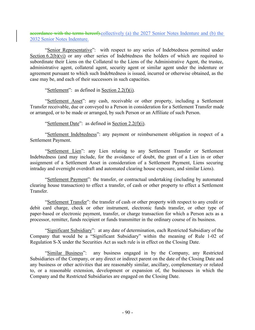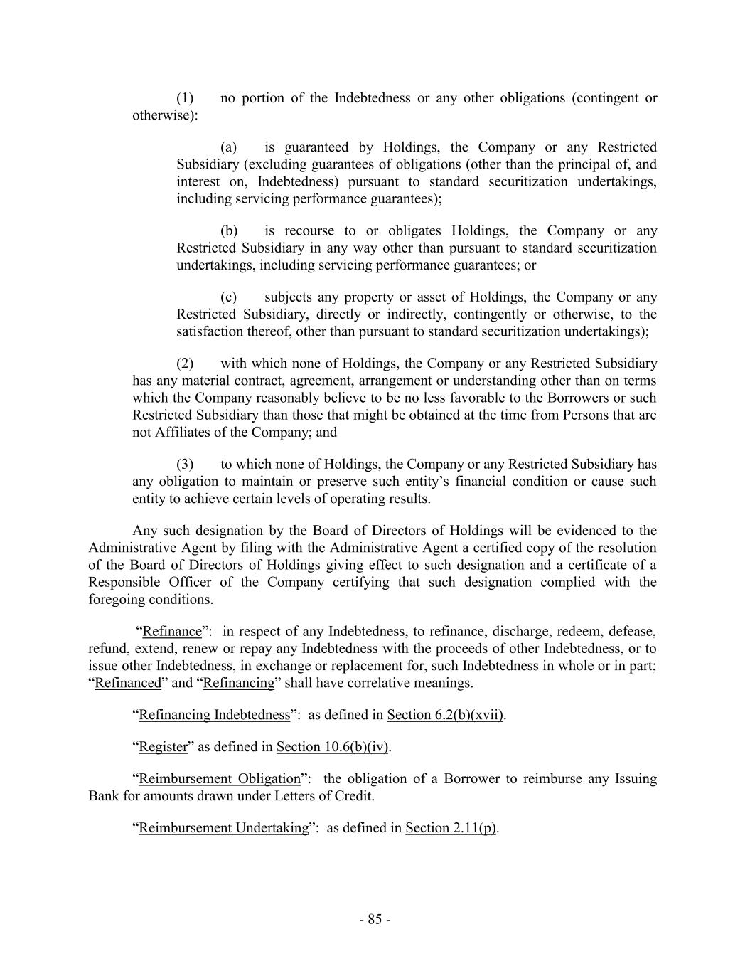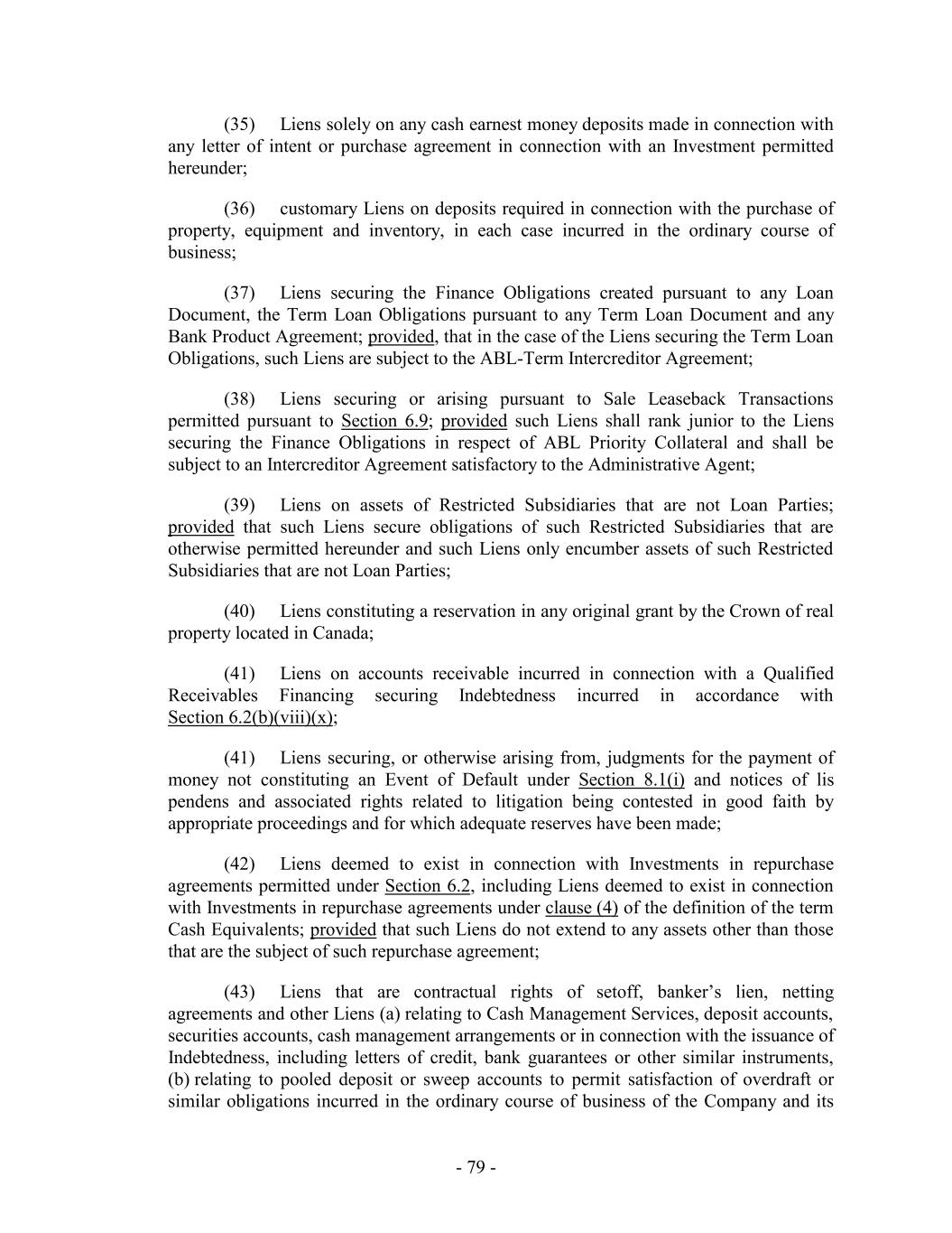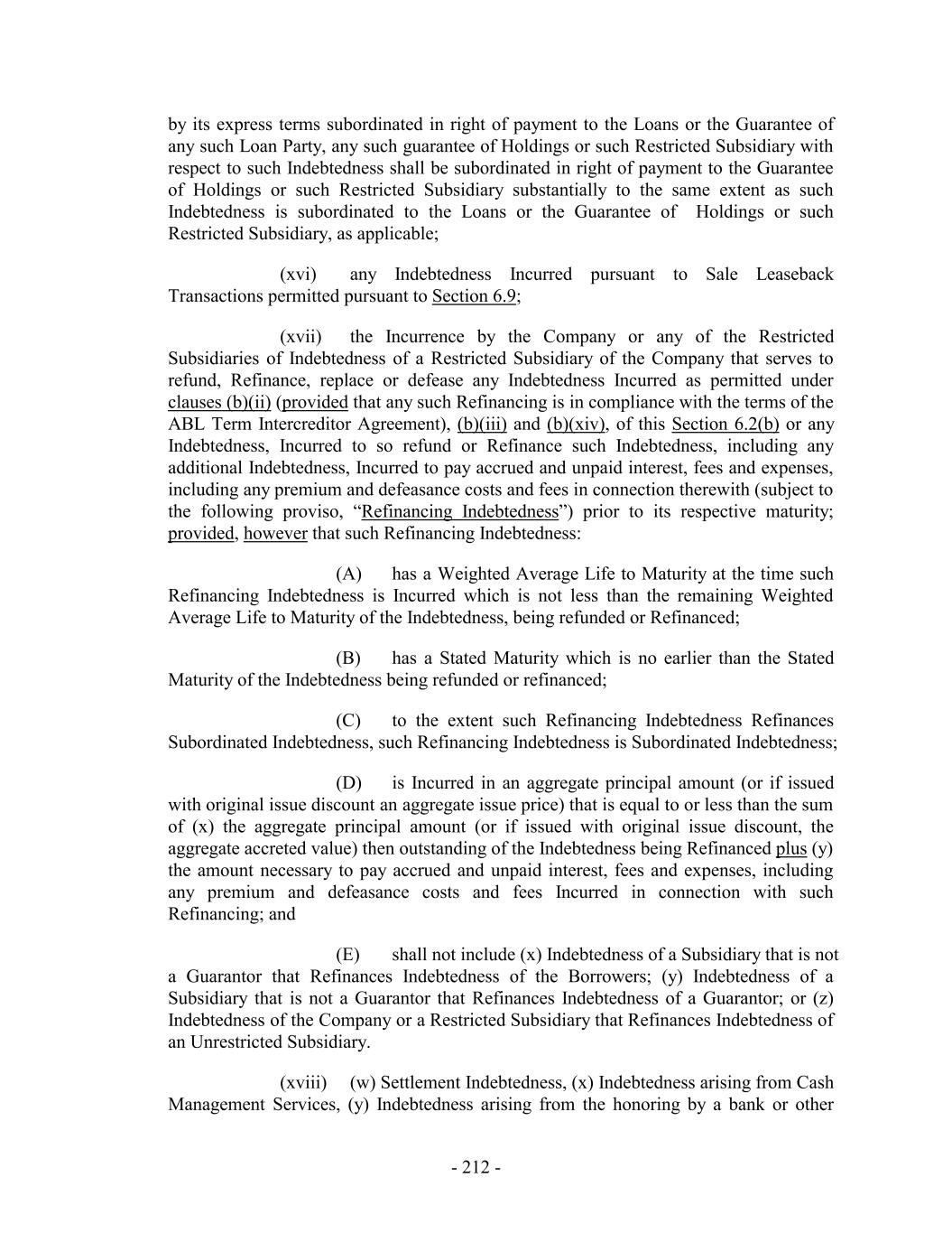 by its express terms subordinated in right of payment to the Loans or the Guarantee of any such Loan Party, any such guarantee of Holdings or such Restricted Subsidiary with respect to such Indebtedness shall be subordinated in right of payment to the Guarantee of Holdings or such Restricted Subsidiary substantially to the same extent as such Indebtedness is subordinated to the Loans or the Guarantee of Holdings or such Restricted Subsidiary, as applicable; (xvi) any Indebtedness Incurred pursuant to Sale Leaseback Transactions permitted pursuant to Section 6.9; (xvii) the Incurrence by the Company or any of the Restricted Subsidiaries of Indebtedness of a Restricted Subsidiary of the Company that serves to refund, Refinance, replace or defease any Indebtedness Incurred as permitted under clauses (b)(ii) (provided that any such Refinancing is in compliance with the terms of the ABL Term Intercreditor Agreement), (b)(iii) and (b)(xiv), of this Section 6.2(b) or any Indebtedness, Incurred to so refund or Refinance such Indebtedness, including any additional Indebtedness, Incurred to pay accrued and unpaid interest, fees and expenses, including any premium and defeasance costs and fees in connection therewith (subject to the following proviso, “Refinancing Indebtedness”) prior to its respective maturity; provided, however that such Refinancing Indebtedness: (A) has a Weighted Average Life to Maturity at the time such Refinancing Indebtedness is Incurred which is not less than the remaining Weighted Average Life to Maturity of the Indebtedness, being refunded or Refinanced; (B) has a Stated Maturity which is no earlier than the Stated Maturity of the Indebtedness being refunded or refinanced; (C) to the extent such Refinancing Indebtedness Refinances Subordinated Indebtedness, such Refinancing Indebtedness is Subordinated Indebtedness; (D) is Incurred in an aggregate principal amount (or if issued with original issue discount an aggregate issue price) that is equal to or less than the sum of (x) the aggregate principal amount (or if issued with original issue discount, the aggregate accreted value) then outstanding of the Indebtedness being Refinanced plus (y) the amount necessary to pay accrued and unpaid interest, fees and expenses, including any premium and defeasance costs and fees Incurred in connection with such Refinancing; and (E) shall not include (x) Indebtedness of a Subsidiary that is not a Guarantor that Refinances Indebtedness of the Borrowers; (y) Indebtedness of a Subsidiary that is not a Guarantor that Refinances Indebtedness of a Guarantor; or (z) Indebtedness of the Company or a Restricted Subsidiary that Refinances Indebtedness of an Unrestricted Subsidiary. (xviii) (w) Settlement Indebtedness, (x) Indebtedness arising from Cash Management Services, (y) Indebtedness arising from the honoring by a bank or other - 212 -