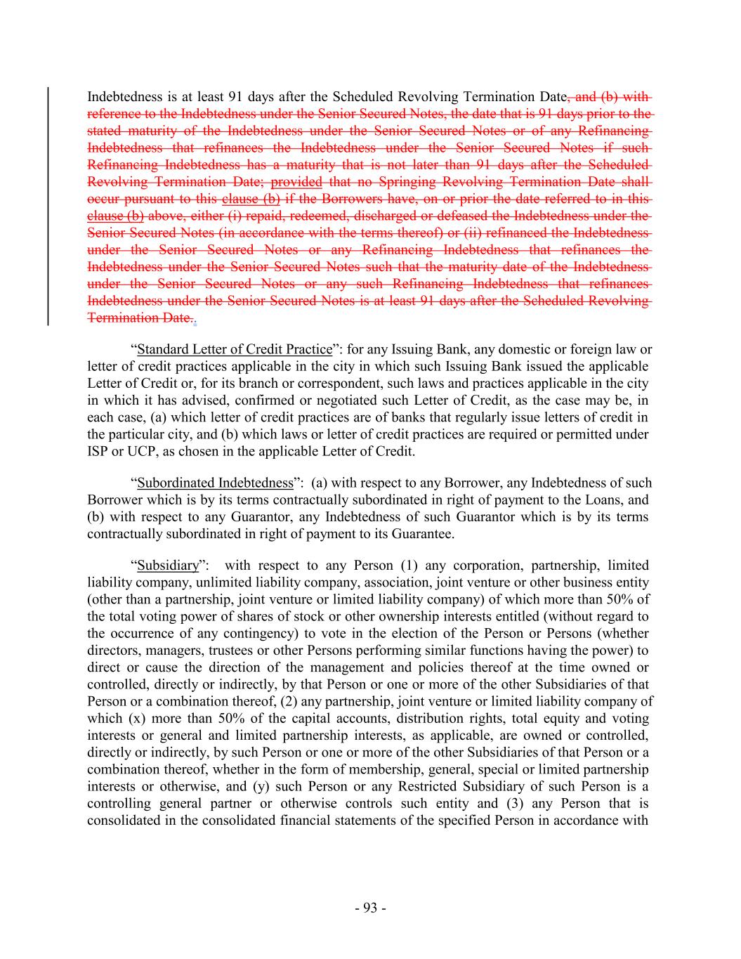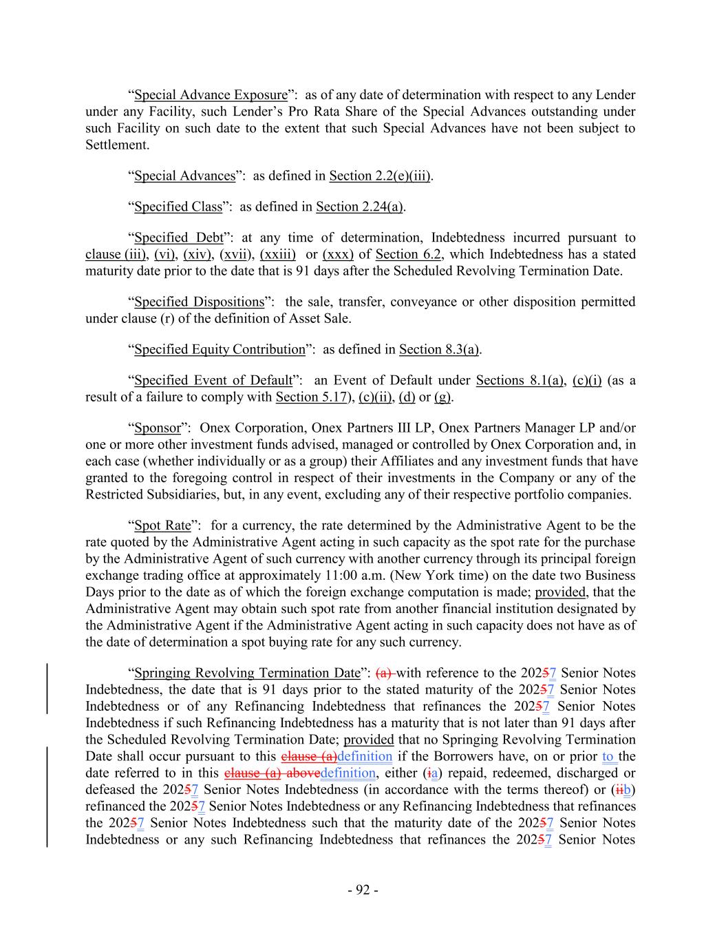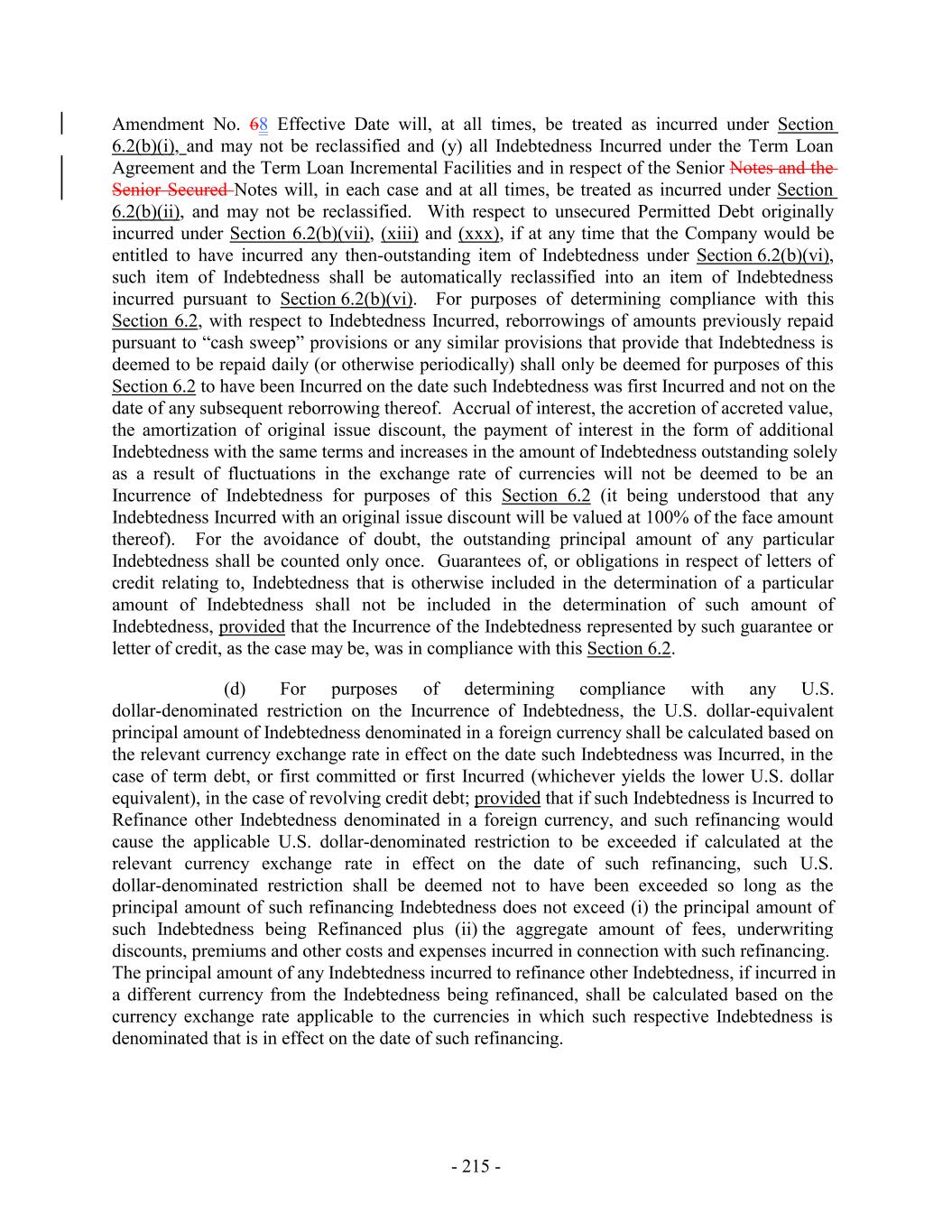 Amendment No. 68 Effective Date will, at all times, be treated as incurred under Section 6.2(b)(i), and may not be reclassified and (y) all Indebtedness Incurred under the Term Loan Agreement and the Term Loan Incremental Facilities and in respect of the Senior Notes and the Senior Secured Notes will, in each case and at all times, be treated as incurred under Section 6.2(b)(ii), and may not be reclassified. With respect to unsecured Permitted Debt originally incurred under Section 6.2(b)(vii), (xiii) and (xxx), if at any time that the Company would be entitled to have incurred any then-outstanding item of Indebtedness under Section 6.2(b)(vi), such item of Indebtedness shall be automatically reclassified into an item of Indebtedness incurred pursuant to Section 6.2(b)(vi). For purposes of determining compliance with this Section 6.2, with respect to Indebtedness Incurred, reborrowings of amounts previously repaid pursuant to “cash sweep” provisions or any similar provisions that provide that Indebtedness is deemed to be repaid daily (or otherwise periodically) shall only be deemed for purposes of this Section 6.2 to have been Incurred on the date such Indebtedness was first Incurred and not on the date of any subsequent reborrowing thereof. Accrual of interest, the accretion of accreted value, the amortization of original issue discount, the payment of interest in the form of additional Indebtedness with the same terms and increases in the amount of Indebtedness outstanding solely as a result of fluctuations in the exchange rate of currencies will not be deemed to be an Incurrence of Indebtedness for purposes of this Section 6.2 (it being understood that any Indebtedness Incurred with an original issue discount will be valued at 100% of the face amount thereof). For the avoidance of doubt, the outstanding principal amount of any particular Indebtedness shall be counted only once. Guarantees of, or obligations in respect of letters of credit relating to, Indebtedness that is otherwise included in the determination of a particular amount of Indebtedness shall not be included in the determination of such amount of Indebtedness, provided that the Incurrence of the Indebtedness represented by such guarantee or letter of credit, as the case may be, was in compliance with this Section 6.2. (d) For purposes of determining compliance with any U.S. dollar-denominated restriction on the Incurrence of Indebtedness, the U.S. dollar-equivalent principal amount of Indebtedness denominated in a foreign currency shall be calculated based on the relevant currency exchange rate in effect on the date such Indebtedness was Incurred, in the case of term debt, or first committed or first Incurred (whichever yields the lower U.S. dollar equivalent), in the case of revolving credit debt; provided that if such Indebtedness is Incurred to Refinance other Indebtedness denominated in a foreign currency, and such refinancing would cause the applicable U.S. dollar-denominated restriction to be exceeded if calculated at the relevant currency exchange rate in effect on the date of such refinancing, such U.S. dollar-denominated restriction shall be deemed not to have been exceeded so long as the principal amount of such refinancing Indebtedness does not exceed (i) the principal amount of such Indebtedness being Refinanced plus (ii) the aggregate amount of fees, underwriting discounts, premiums and other costs and expenses incurred in connection with such refinancing. The principal amount of any Indebtedness incurred to refinance other Indebtedness, if incurred in a different currency from the Indebtedness being refinanced, shall be calculated based on the currency exchange rate applicable to the currencies in which such respective Indebtedness is denominated that is in effect on the date of such refinancing. - 215 -
