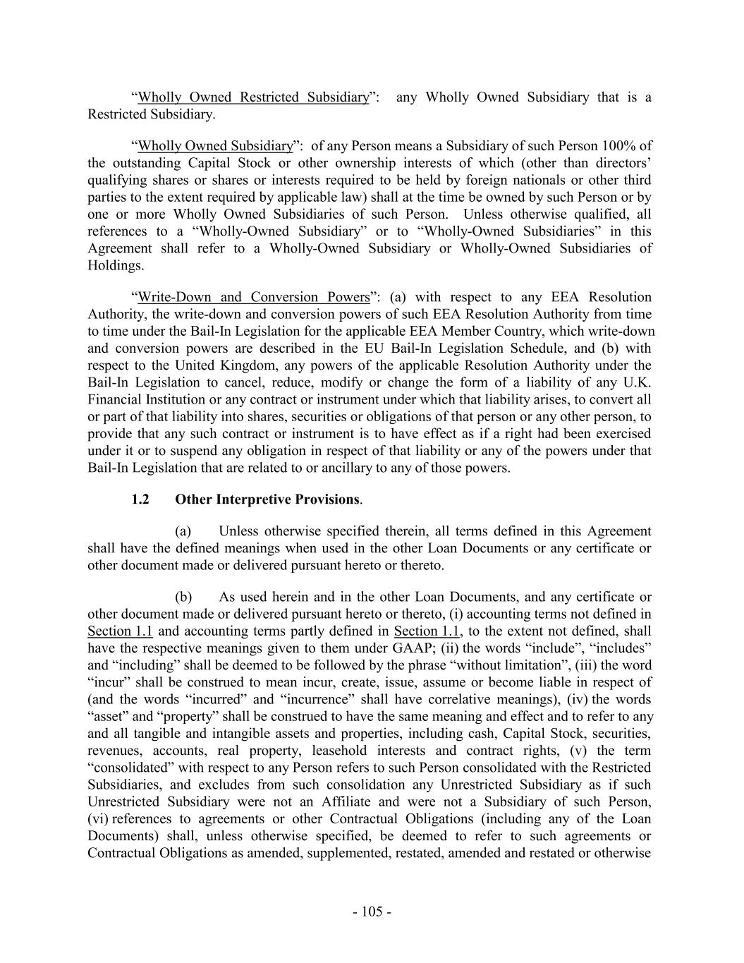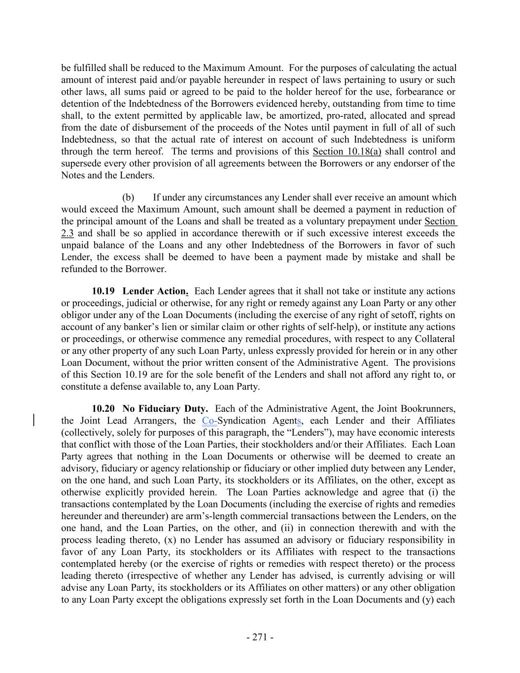 be fulfilled shall be reduced to the Maximum Amount. For the purposes of calculating the actual amount of interest paid and/or payable hereunder in respect of laws pertaining to usury or such other laws, all sums paid or agreed to be paid to the holder hereof for the use, forbearance or detention of the Indebtedness of the Borrowers evidenced hereby, outstanding from time to time shall, to the extent permitted by applicable law, be amortized, pro-rated, allocated and spread from the date of disbursement of the proceeds of the Notes until payment in full of all of such Indebtedness, so that the actual rate of interest on account of such Indebtedness is uniform through the term hereof. The terms and provisions of this Section 10.18(a) shall control and supersede every other provision of all agreements between the Borrowers or any endorser of the Notes and the Lenders. (b) If under any circumstances any Lender shall ever receive an amount which would exceed the Maximum Amount, such amount shall be deemed a payment in reduction of the principal amount of the Loans and shall be treated as a voluntary prepayment under Section 2.3 and shall be so applied in accordance therewith or if such excessive interest exceeds the unpaid balance of the Loans and any other Indebtedness of the Borrowers in favor of such Lender, the excess shall be deemed to have been a payment made by mistake and shall be refunded to the Borrower. 10.19 Lender Action. Each Lender agrees that it shall not take or institute any actions or proceedings, judicial or otherwise, for any right or remedy against any Loan Party or any other obligor under any of the Loan Documents (including the exercise of any right of setoff, rights on account of any banker’s lien or similar claim or other rights of self-help), or institute any actions or proceedings, or otherwise commence any remedial procedures, with respect to any Collateral or any other property of any such Loan Party, unless expressly provided for herein or in any other Loan Document, without the prior written consent of the Administrative Agent. The provisions of this Section 10.19 are for the sole benefit of the Lenders and shall not afford any right to, or constitute a defense available to, any Loan Party. 10.20 No Fiduciary Duty. Each of the Administrative Agent, the Joint Bookrunners, the Joint Lead Arrangers, the Co-Syndication Agents, each Lender and their Affiliates (collectively, solely for purposes of this paragraph, the “Lenders”), may have economic interests that conflict with those of the Loan Parties, their stockholders and/or their Affiliates. Each Loan Party agrees that nothing in the Loan Documents or otherwise will be deemed to create an advisory, fiduciary or agency relationship or fiduciary or other implied duty between any Lender, on the one hand, and such Loan Party, its stockholders or its Affiliates, on the other, except as otherwise explicitly provided herein. The Loan Parties acknowledge and agree that (i) the transactions contemplated by the Loan Documents (including the exercise of rights and remedies hereunder and thereunder) are arm’s-length commercial transactions between the Lenders, on the one hand, and the Loan Parties, on the other, and (ii) in connection therewith and with the process leading thereto, (x) no Lender has assumed an advisory or fiduciary responsibility in favor of any Loan Party, its stockholders or its Affiliates with respect to the transactions contemplated hereby (or the exercise of rights or remedies with respect thereto) or the process leading thereto (irrespective of whether any Lender has advised, is currently advising or will advise any Loan Party, its stockholders or its Affiliates on other matters) or any other obligation to any Loan Party except the obligations expressly set forth in the Loan Documents and (y) each - 271 -