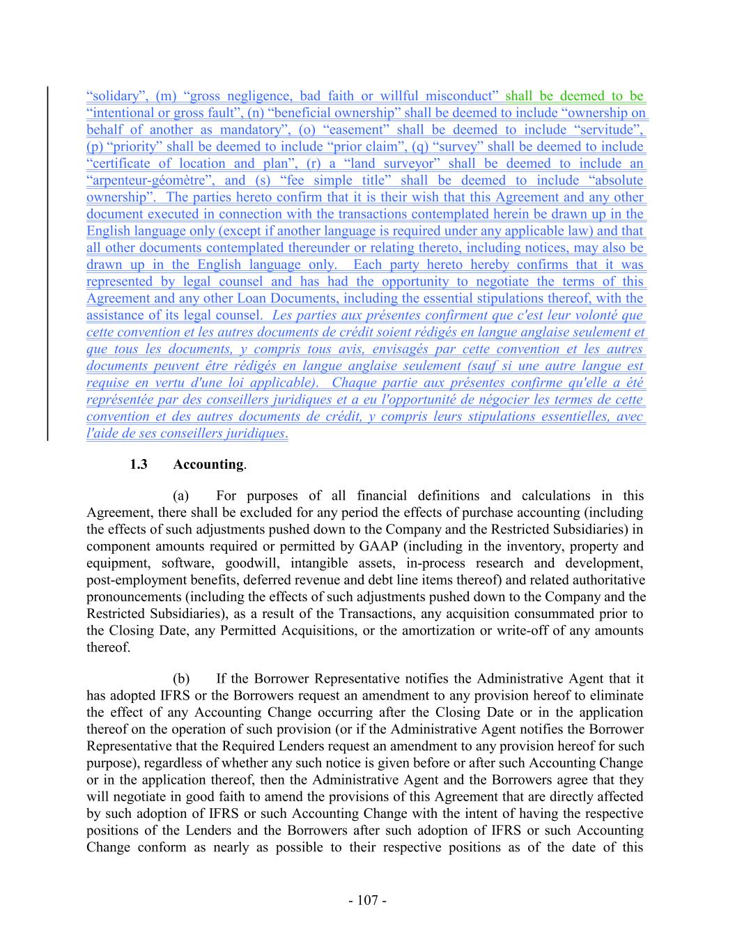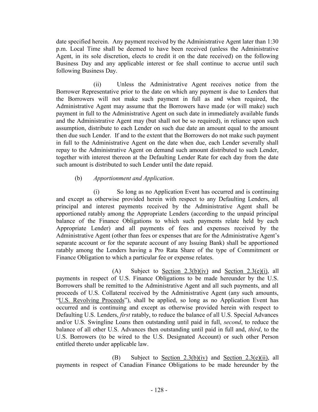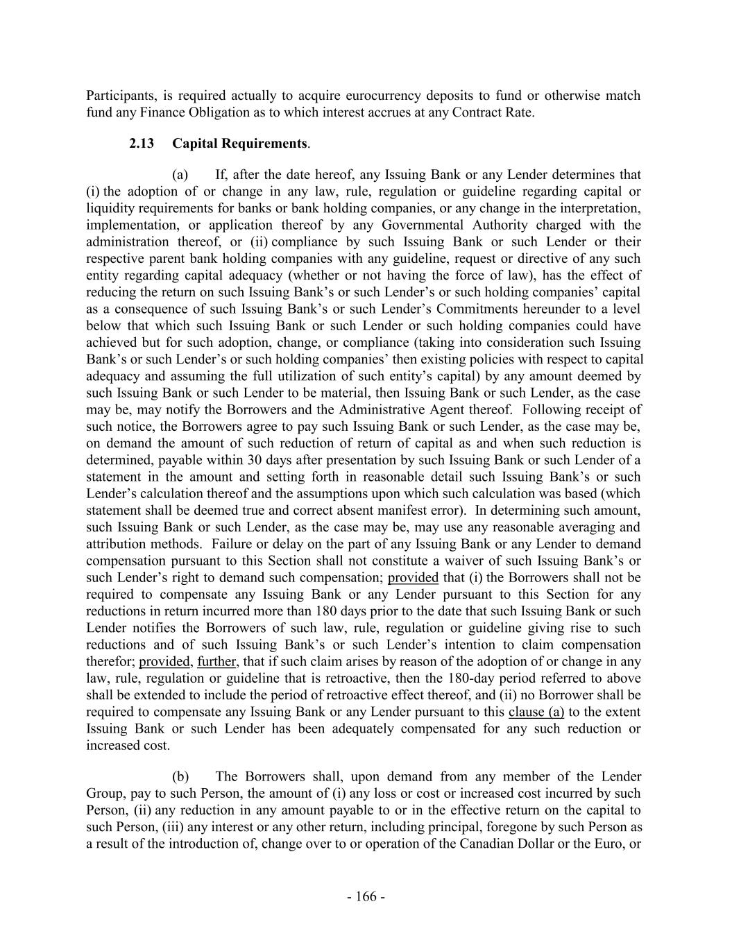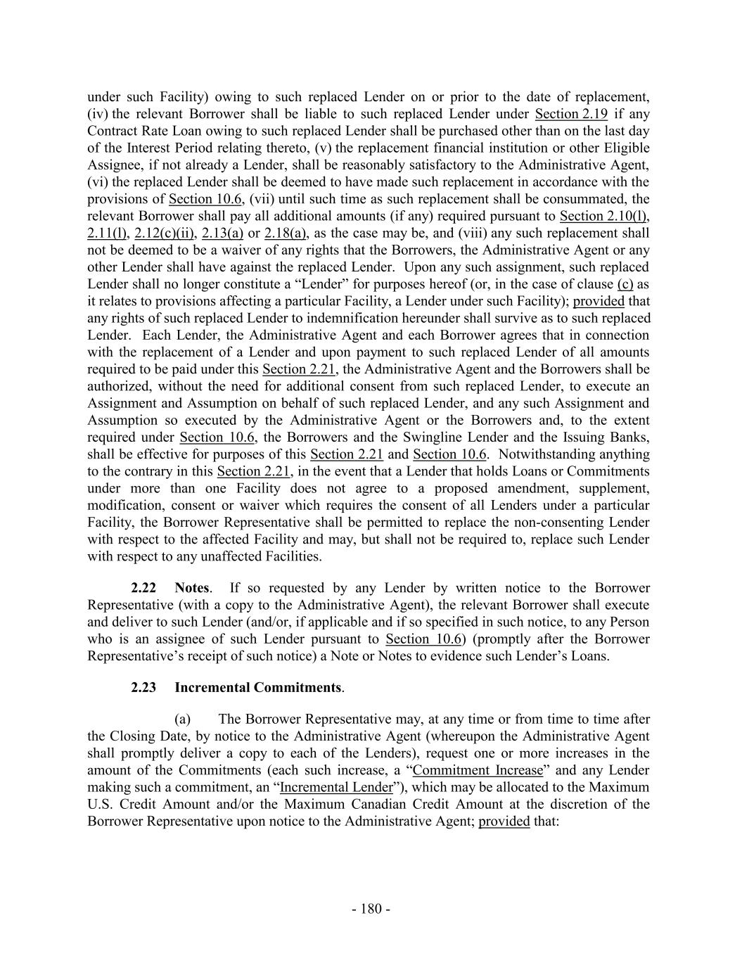 under such Facility) owing to such replaced Lender on or prior to the date of replacement, (iv) the relevant Borrower shall be liable to such replaced Lender under Section 2.19 if any Contract Rate Loan owing to such replaced Lender shall be purchased other than on the last day of the Interest Period relating thereto, (v) the replacement financial institution or other Eligible Assignee, if not already a Lender, shall be reasonably satisfactory to the Administrative Agent, (vi) the replaced Lender shall be deemed to have made such replacement in accordance with the provisions of Section 10.6, (vii) until such time as such replacement shall be consummated, the relevant Borrower shall pay all additional amounts (if any) required pursuant to Section 2.10(l), 2.11(l), 2.12(c)(ii), 2.13(a) or 2.18(a), as the case may be, and (viii) any such replacement shall not be deemed to be a waiver of any rights that the Borrowers, the Administrative Agent or any other Lender shall have against the replaced Lender. Upon any such assignment, such replaced Lender shall no longer constitute a “Lender” for purposes hereof (or, in the case of clause (c) as it relates to provisions affecting a particular Facility, a Lender under such Facility); provided that any rights of such replaced Lender to indemnification hereunder shall survive as to such replaced Lender. Each Lender, the Administrative Agent and each Borrower agrees that in connection with the replacement of a Lender and upon payment to such replaced Lender of all amounts required to be paid under this Section 2.21, the Administrative Agent and the Borrowers shall be authorized, without the need for additional consent from such replaced Lender, to execute an Assignment and Assumption on behalf of such replaced Lender, and any such Assignment and Assumption so executed by the Administrative Agent or the Borrowers and, to the extent required under Section 10.6, the Borrowers and the Swingline Lender and the Issuing Banks, shall be effective for purposes of this Section 2.21 and Section 10.6. Notwithstanding anything to the contrary in this Section 2.21, in the event that a Lender that holds Loans or Commitments under more than one Facility does not agree to a proposed amendment, supplement, modification, consent or waiver which requires the consent of all Lenders under a particular Facility, the Borrower Representative shall be permitted to replace the non-consenting Lender with respect to the affected Facility and may, but shall not be required to, replace such Lender with respect to any unaffected Facilities. 2.22 Notes. If so requested by any Lender by written notice to the Borrower Representative (with a copy to the Administrative Agent), the relevant Borrower shall execute and deliver to such Lender (and/or, if applicable and if so specified in such notice, to any Person who is an assignee of such Lender pursuant to Section 10.6) (promptly after the Borrower Representative’s receipt of such notice) a Note or Notes to evidence such Lender’s Loans. 2.23 Incremental Commitments. (a) The Borrower Representative may, at any time or from time to time after the Closing Date, by notice to the Administrative Agent (whereupon the Administrative Agent shall promptly deliver a copy to each of the Lenders), request one or more increases in the amount of the Commitments (each such increase, a “Commitment Increase” and any Lender making such a commitment, an “Incremental Lender”), which may be allocated to the Maximum U.S. Credit Amount and/or the Maximum Canadian Credit Amount at the discretion of the Borrower Representative upon notice to the Administrative Agent; provided that: - 180 -