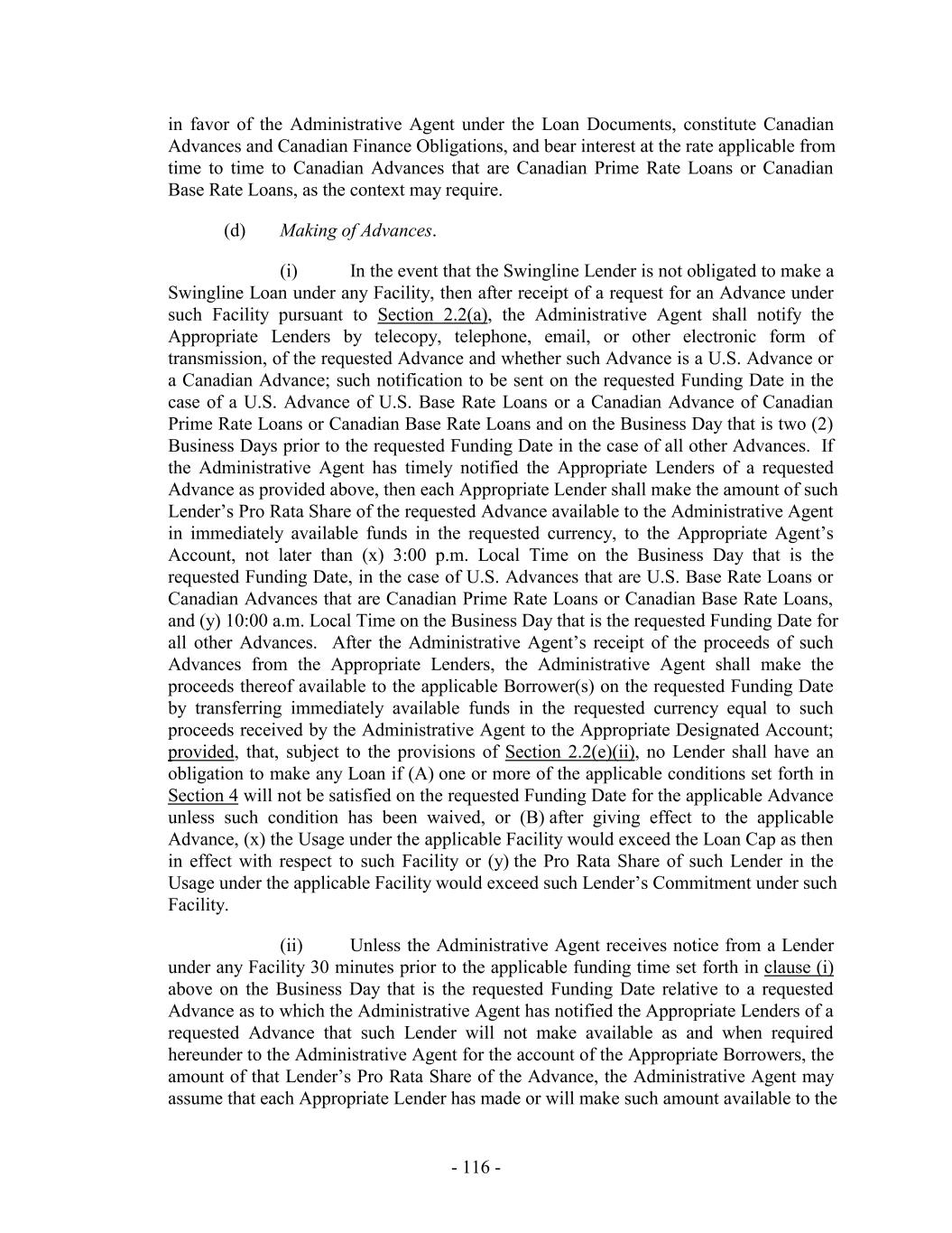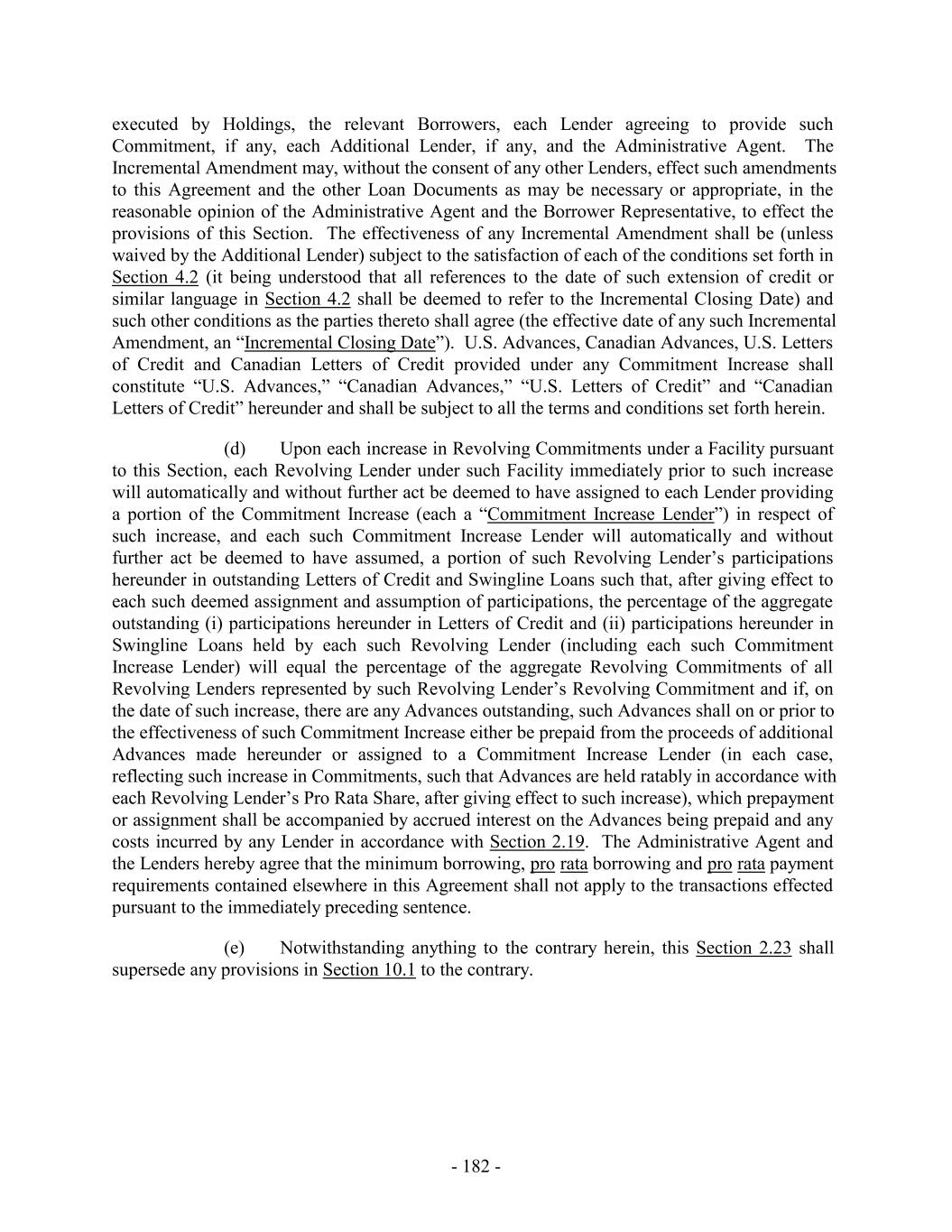 executed by Holdings, the relevant Borrowers, each Lender agreeing to provide such Commitment, if any, each Additional Lender, if any, and the Administrative Agent. The Incremental Amendment may, without the consent of any other Lenders, effect such amendments to this Agreement and the other Loan Documents as may be necessary or appropriate, in the reasonable opinion of the Administrative Agent and the Borrower Representative, to effect the provisions of this Section. The effectiveness of any Incremental Amendment shall be (unless waived by the Additional Lender) subject to the satisfaction of each of the conditions set forth in Section 4.2 (it being understood that all references to the date of such extension of credit or similar language in Section 4.2 shall be deemed to refer to the Incremental Closing Date) and such other conditions as the parties thereto shall agree (the effective date of any such Incremental Amendment, an “Incremental Closing Date”). U.S. Advances, Canadian Advances, U.S. Letters of Credit and Canadian Letters of Credit provided under any Commitment Increase shall constitute “U.S. Advances,” “Canadian Advances,” “U.S. Letters of Credit” and “Canadian Letters of Credit” hereunder and shall be subject to all the terms and conditions set forth herein. (d) Upon each increase in Revolving Commitments under a Facility pursuant to this Section, each Revolving Lender under such Facility immediately prior to such increase will automatically and without further act be deemed to have assigned to each Lender providing a portion of the Commitment Increase (each a “Commitment Increase Lender”) in respect of such increase, and each such Commitment Increase Lender will automatically and without further act be deemed to have assumed, a portion of such Revolving Lender’s participations hereunder in outstanding Letters of Credit and Swingline Loans such that, after giving effect to each such deemed assignment and assumption of participations, the percentage of the aggregate outstanding (i) participations hereunder in Letters of Credit and (ii) participations hereunder in Swingline Loans held by each such Revolving Lender (including each such Commitment Increase Lender) will equal the percentage of the aggregate Revolving Commitments of all Revolving Lenders represented by such Revolving Lender’s Revolving Commitment and if, on the date of such increase, there are any Advances outstanding, such Advances shall on or prior to the effectiveness of such Commitment Increase either be prepaid from the proceeds of additional Advances made hereunder or assigned to a Commitment Increase Lender (in each case, reflecting such increase in Commitments, such that Advances are held ratably in accordance with each Revolving Lender’s Pro Rata Share, after giving effect to such increase), which prepayment or assignment shall be accompanied by accrued interest on the Advances being prepaid and any costs incurred by any Lender in accordance with Section 2.19. The Administrative Agent and the Lenders hereby agree that the minimum borrowing, pro rata borrowing and pro rata payment requirements contained elsewhere in this Agreement shall not apply to the transactions effected pursuant to the immediately preceding sentence. (e) Notwithstanding anything to the contrary herein, this Section 2.23 shall supersede any provisions in Section 10.1 to the contrary. - 182 -
