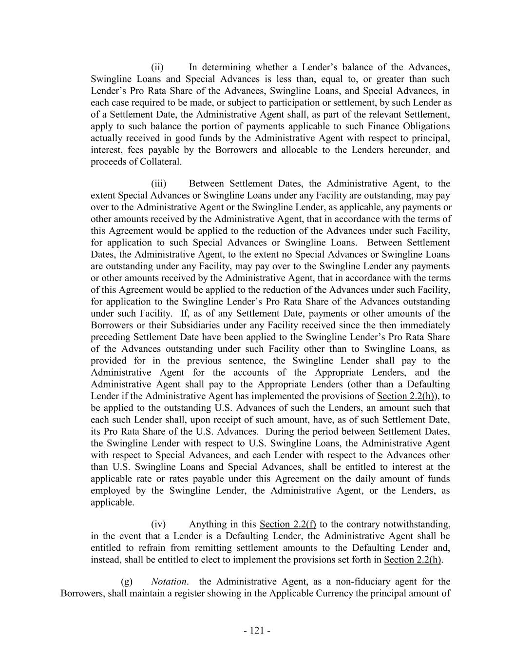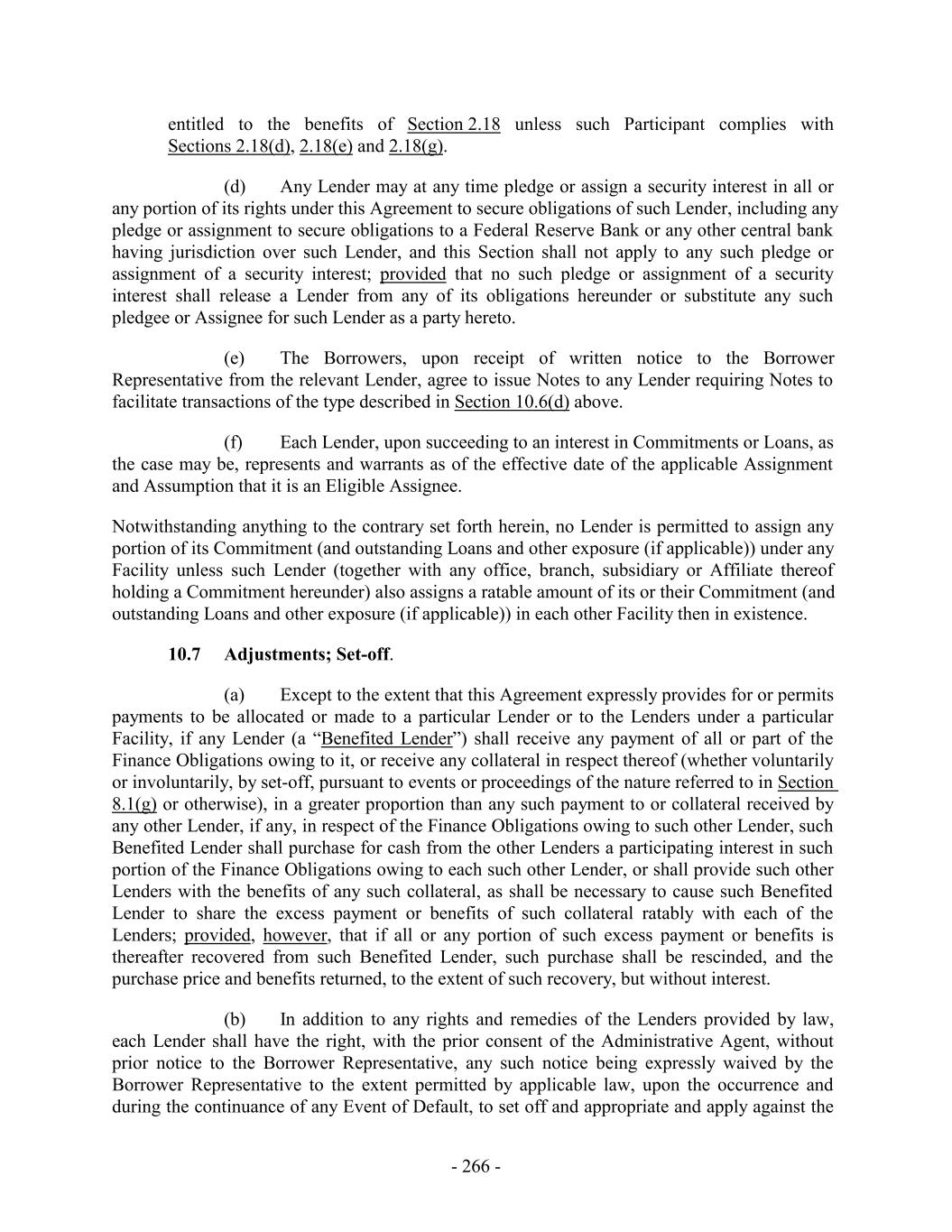 entitled to the benefits of Section 2.18 unless such Participant complies with Sections 2.18(d), 2.18(e) and 2.18(g). (d) Any Lender may at any time pledge or assign a security interest in all or any portion of its rights under this Agreement to secure obligations of such Lender, including any pledge or assignment to secure obligations to a Federal Reserve Bank or any other central bank having jurisdiction over such Lender, and this Section shall not apply to any such pledge or assignment of a security interest; provided that no such pledge or assignment of a security interest shall release a Lender from any of its obligations hereunder or substitute any such pledgee or Assignee for such Lender as a party hereto. (e) The Borrowers, upon receipt of written notice to the Borrower Representative from the relevant Lender, agree to issue Notes to any Lender requiring Notes to facilitate transactions of the type described in Section 10.6(d) above. (f) Each Lender, upon succeeding to an interest in Commitments or Loans, as the case may be, represents and warrants as of the effective date of the applicable Assignment and Assumption that it is an Eligible Assignee. Notwithstanding anything to the contrary set forth herein, no Lender is permitted to assign any portion of its Commitment (and outstanding Loans and other exposure (if applicable)) under any Facility unless such Lender (together with any office, branch, subsidiary or Affiliate thereof holding a Commitment hereunder) also assigns a ratable amount of its or their Commitment (and outstanding Loans and other exposure (if applicable)) in each other Facility then in existence. 10.7 Adjustments; Set-off. (a) Except to the extent that this Agreement expressly provides for or permits payments to be allocated or made to a particular Lender or to the Lenders under a particular Facility, if any Lender (a “Benefited Lender”) shall receive any payment of all or part of the Finance Obligations owing to it, or receive any collateral in respect thereof (whether voluntarily or involuntarily, by set-off, pursuant to events or proceedings of the nature referred to in Section 8.1(g) or otherwise), in a greater proportion than any such payment to or collateral received by any other Lender, if any, in respect of the Finance Obligations owing to such other Lender, such Benefited Lender shall purchase for cash from the other Lenders a participating interest in such portion of the Finance Obligations owing to each such other Lender, or shall provide such other Lenders with the benefits of any such collateral, as shall be necessary to cause such Benefited Lender to share the excess payment or benefits of such collateral ratably with each of the Lenders; provided, however, that if all or any portion of such excess payment or benefits is thereafter recovered from such Benefited Lender, such purchase shall be rescinded, and the purchase price and benefits returned, to the extent of such recovery, but without interest. (b) In addition to any rights and remedies of the Lenders provided by law, each Lender shall have the right, with the prior consent of the Administrative Agent, without prior notice to the Borrower Representative, any such notice being expressly waived by the Borrower Representative to the extent permitted by applicable law, upon the occurrence and during the continuance of any Event of Default, to set off and appropriate and apply against the - 266 -