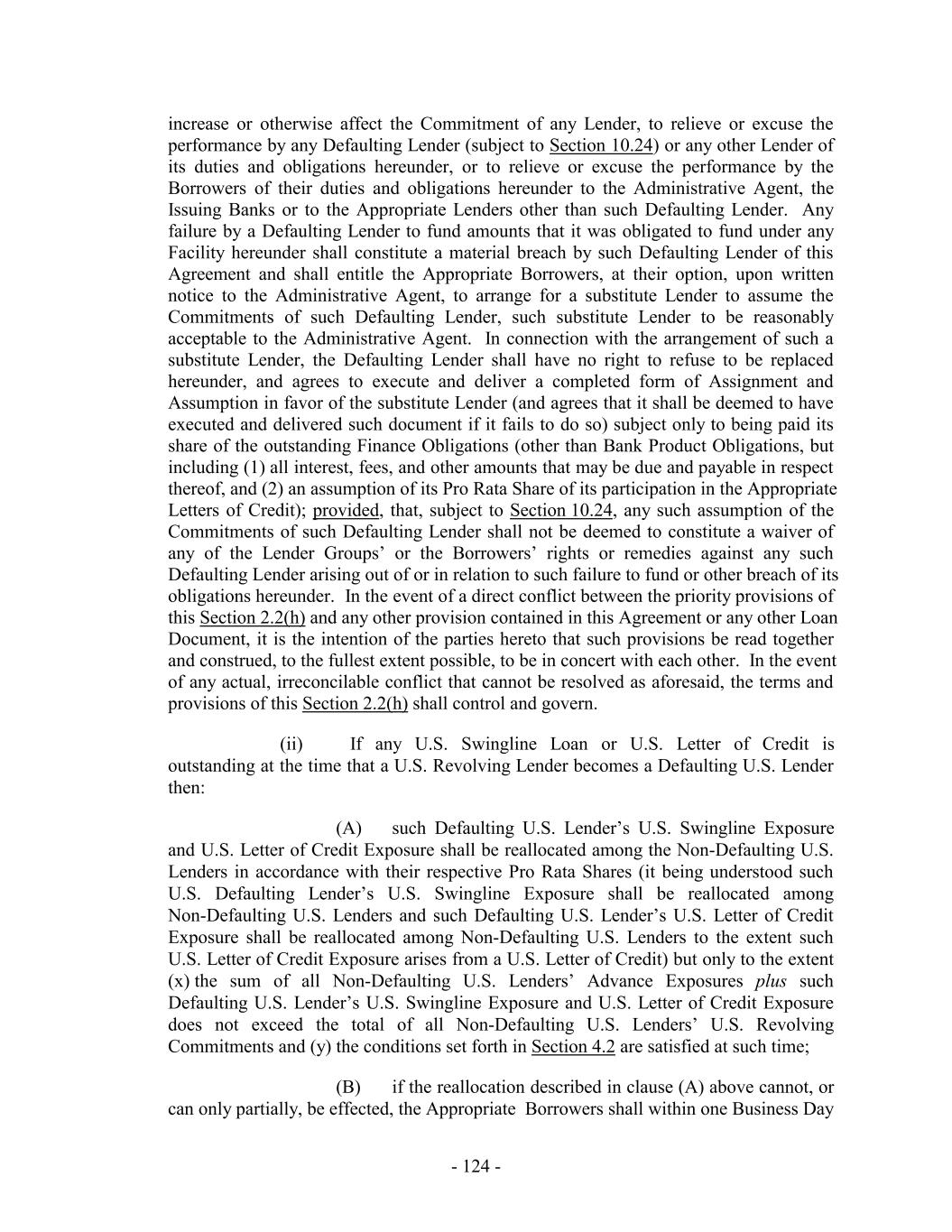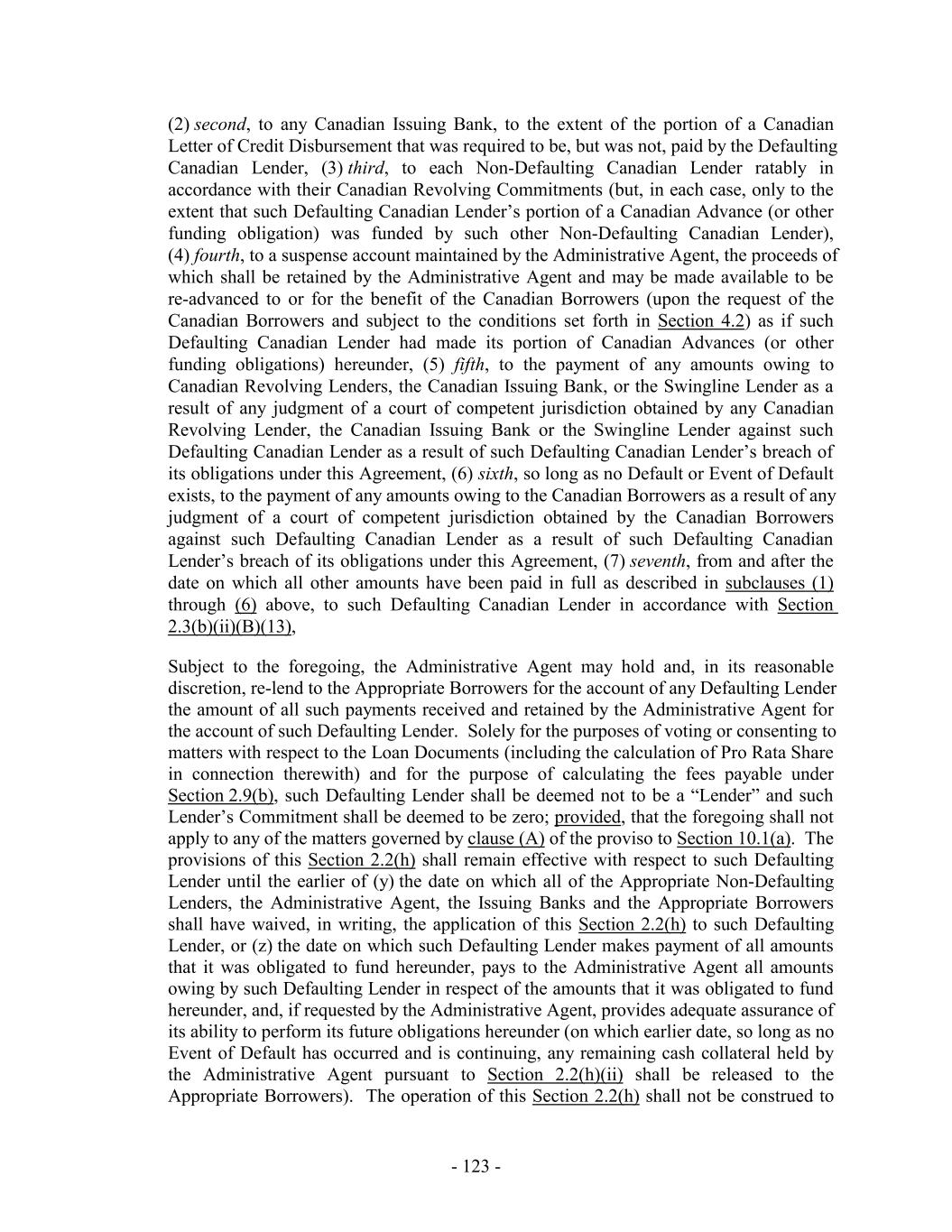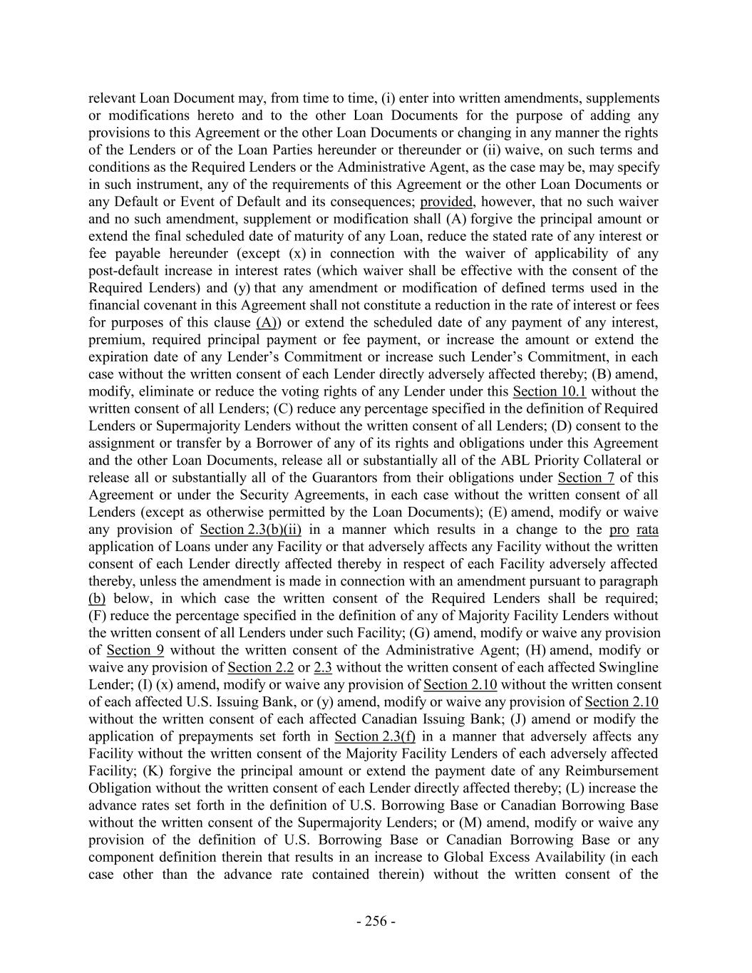 relevant Loan Document may, from time to time, (i) enter into written amendments, supplements or modifications hereto and to the other Loan Documents for the purpose of adding any provisions to this Agreement or the other Loan Documents or changing in any manner the rights of the Lenders or of the Loan Parties hereunder or thereunder or (ii) waive, on such terms and conditions as the Required Lenders or the Administrative Agent, as the case may be, may specify in such instrument, any of the requirements of this Agreement or the other Loan Documents or any Default or Event of Default and its consequences; provided, however, that no such waiver and no such amendment, supplement or modification shall (A) forgive the principal amount or extend the final scheduled date of maturity of any Loan, reduce the stated rate of any interest or fee payable hereunder (except (x) in connection with the waiver of applicability of any post-default increase in interest rates (which waiver shall be effective with the consent of the Required Lenders) and (y) that any amendment or modification of defined terms used in the financial covenant in this Agreement shall not constitute a reduction in the rate of interest or fees for purposes of this clause (A)) or extend the scheduled date of any payment of any interest, premium, required principal payment or fee payment, or increase the amount or extend the expiration date of any Lender’s Commitment or increase such Lender’s Commitment, in each case without the written consent of each Lender directly adversely affected thereby; (B) amend, modify, eliminate or reduce the voting rights of any Lender under this Section 10.1 without the written consent of all Lenders; (C) reduce any percentage specified in the definition of Required Lenders or Supermajority Lenders without the written consent of all Lenders; (D) consent to the assignment or transfer by a Borrower of any of its rights and obligations under this Agreement and the other Loan Documents, release all or substantially all of the ABL Priority Collateral or release all or substantially all of the Guarantors from their obligations under Section 7 of this Agreement or under the Security Agreements, in each case without the written consent of all Lenders (except as otherwise permitted by the Loan Documents); (E) amend, modify or waive any provision of Section 2.3(b)(ii) in a manner which results in a change to the pro rata application of Loans under any Facility or that adversely affects any Facility without the written consent of each Lender directly affected thereby in respect of each Facility adversely affected thereby, unless the amendment is made in connection with an amendment pursuant to paragraph (b) below, in which case the written consent of the Required Lenders shall be required; (F) reduce the percentage specified in the definition of any of Majority Facility Lenders without the written consent of all Lenders under such Facility; (G) amend, modify or waive any provision of Section 9 without the written consent of the Administrative Agent; (H) amend, modify or waive any provision of Section 2.2 or 2.3 without the written consent of each affected Swingline Lender; (I) (x) amend, modify or waive any provision of Section 2.10 without the written consent of each affected U.S. Issuing Bank, or (y) amend, modify or waive any provision of Section 2.10 without the written consent of each affected Canadian Issuing Bank; (J) amend or modify the application of prepayments set forth in Section 2.3(f) in a manner that adversely affects any Facility without the written consent of the Majority Facility Lenders of each adversely affected Facility; (K) forgive the principal amount or extend the payment date of any Reimbursement Obligation without the written consent of each Lender directly affected thereby; (L) increase the advance rates set forth in the definition of U.S. Borrowing Base or Canadian Borrowing Base without the written consent of the Supermajority Lenders; or (M) amend, modify or waive any provision of the definition of U.S. Borrowing Base or Canadian Borrowing Base or any component definition therein that results in an increase to Global Excess Availability (in each case other than the advance rate contained therein) without the written consent of the - 256 -