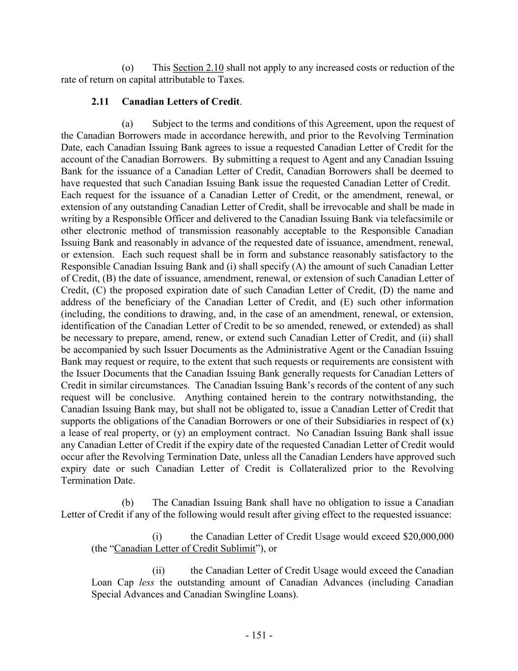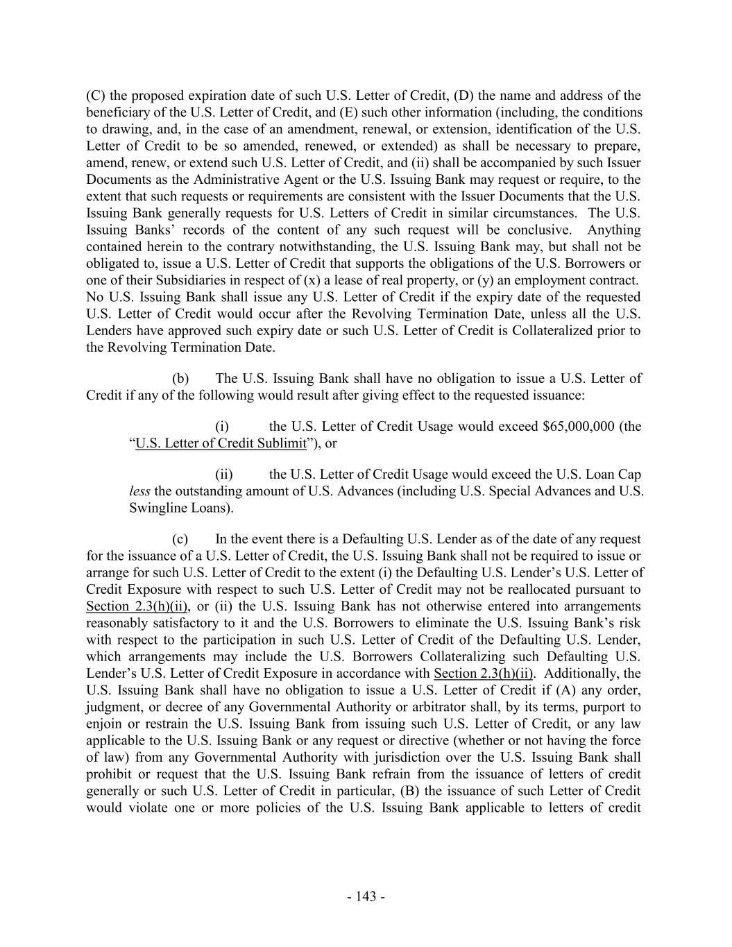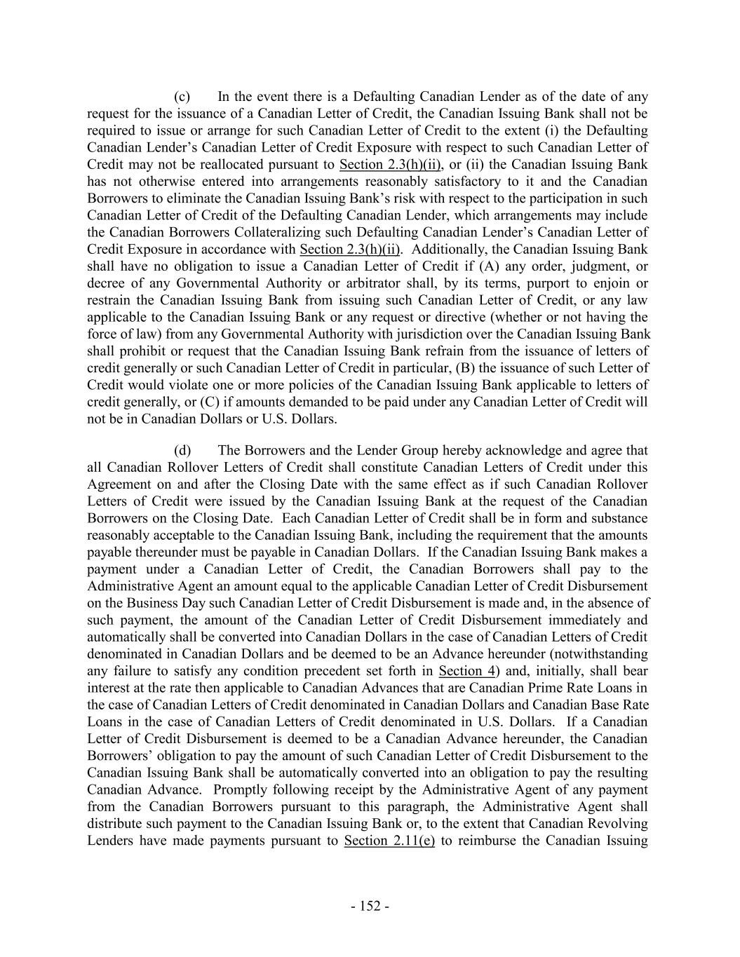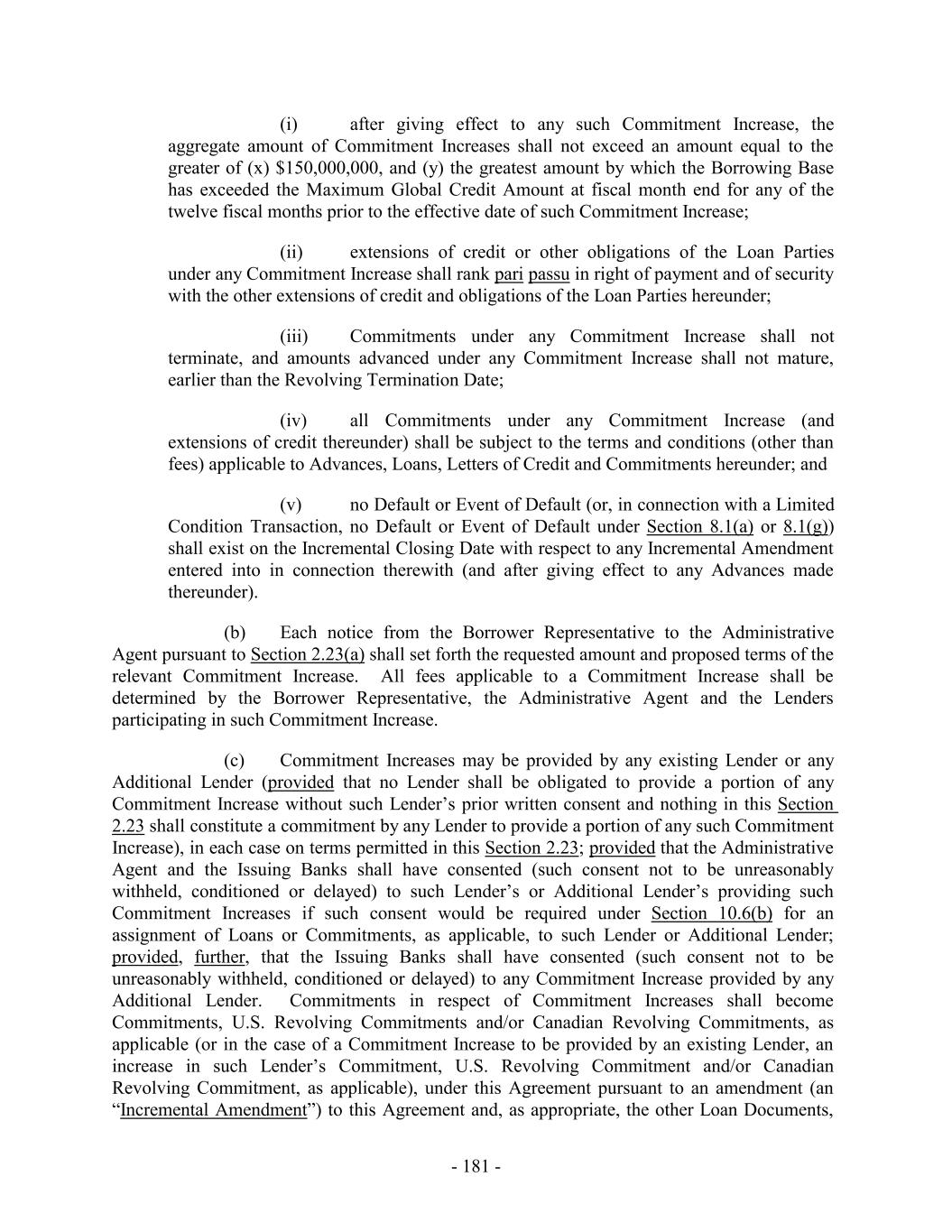 (i) after giving effect to any such Commitment Increase, the aggregate amount of Commitment Increases shall not exceed an amount equal to the greater of (x) $150,000,000, and (y) the greatest amount by which the Borrowing Base has exceeded the Maximum Global Credit Amount at fiscal month end for any of the twelve fiscal months prior to the effective date of such Commitment Increase; (ii) extensions of credit or other obligations of the Loan Parties under any Commitment Increase shall rank pari passu in right of payment and of security with the other extensions of credit and obligations of the Loan Parties hereunder; (iii) Commitments under any Commitment Increase shall not terminate, and amounts advanced under any Commitment Increase shall not mature, earlier than the Revolving Termination Date; (iv) all Commitments under any Commitment Increase (and extensions of credit thereunder) shall be subject to the terms and conditions (other than fees) applicable to Advances, Loans, Letters of Credit and Commitments hereunder; and (v) no Default or Event of Default (or, in connection with a Limited Condition Transaction, no Default or Event of Default under Section 8.1(a) or 8.1(g)) shall exist on the Incremental Closing Date with respect to any Incremental Amendment entered into in connection therewith (and after giving effect to any Advances made thereunder). (b) Each notice from the Borrower Representative to the Administrative Agent pursuant to Section 2.23(a) shall set forth the requested amount and proposed terms of the relevant Commitment Increase. All fees applicable to a Commitment Increase shall be determined by the Borrower Representative, the Administrative Agent and the Lenders participating in such Commitment Increase. (c) Commitment Increases may be provided by any existing Lender or any Additional Lender (provided that no Lender shall be obligated to provide a portion of any Commitment Increase without such Lender’s prior written consent and nothing in this Section 2.23 shall constitute a commitment by any Lender to provide a portion of any such Commitment Increase), in each case on terms permitted in this Section 2.23; provided that the Administrative Agent and the Issuing Banks shall have consented (such consent not to be unreasonably withheld, conditioned or delayed) to such Lender’s or Additional Lender’s providing such Commitment Increases if such consent would be required under Section 10.6(b) for an assignment of Loans or Commitments, as applicable, to such Lender or Additional Lender; provided, further, that the Issuing Banks shall have consented (such consent not to be unreasonably withheld, conditioned or delayed) to any Commitment Increase provided by any Additional Lender. Commitments in respect of Commitment Increases shall become Commitments, U.S. Revolving Commitments and/or Canadian Revolving Commitments, as applicable (or in the case of a Commitment Increase to be provided by an existing Lender, an increase in such Lender’s Commitment, U.S. Revolving Commitment and/or Canadian Revolving Commitment, as applicable), under this Agreement pursuant to an amendment (an “Incremental Amendment”) to this Agreement and, as appropriate, the other Loan Documents, - 181 -