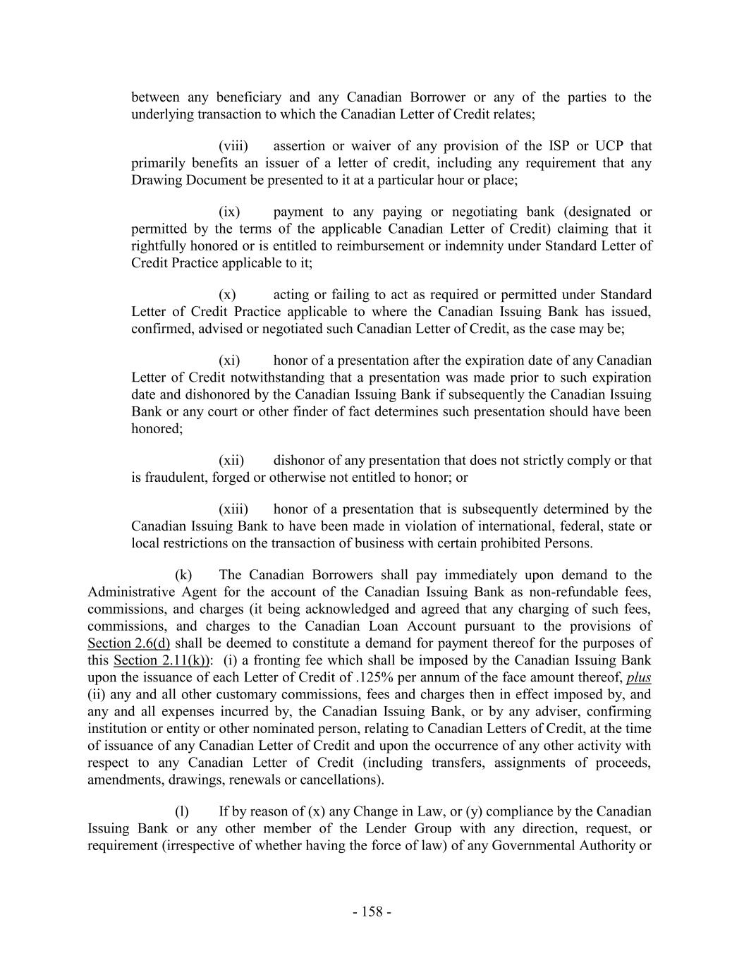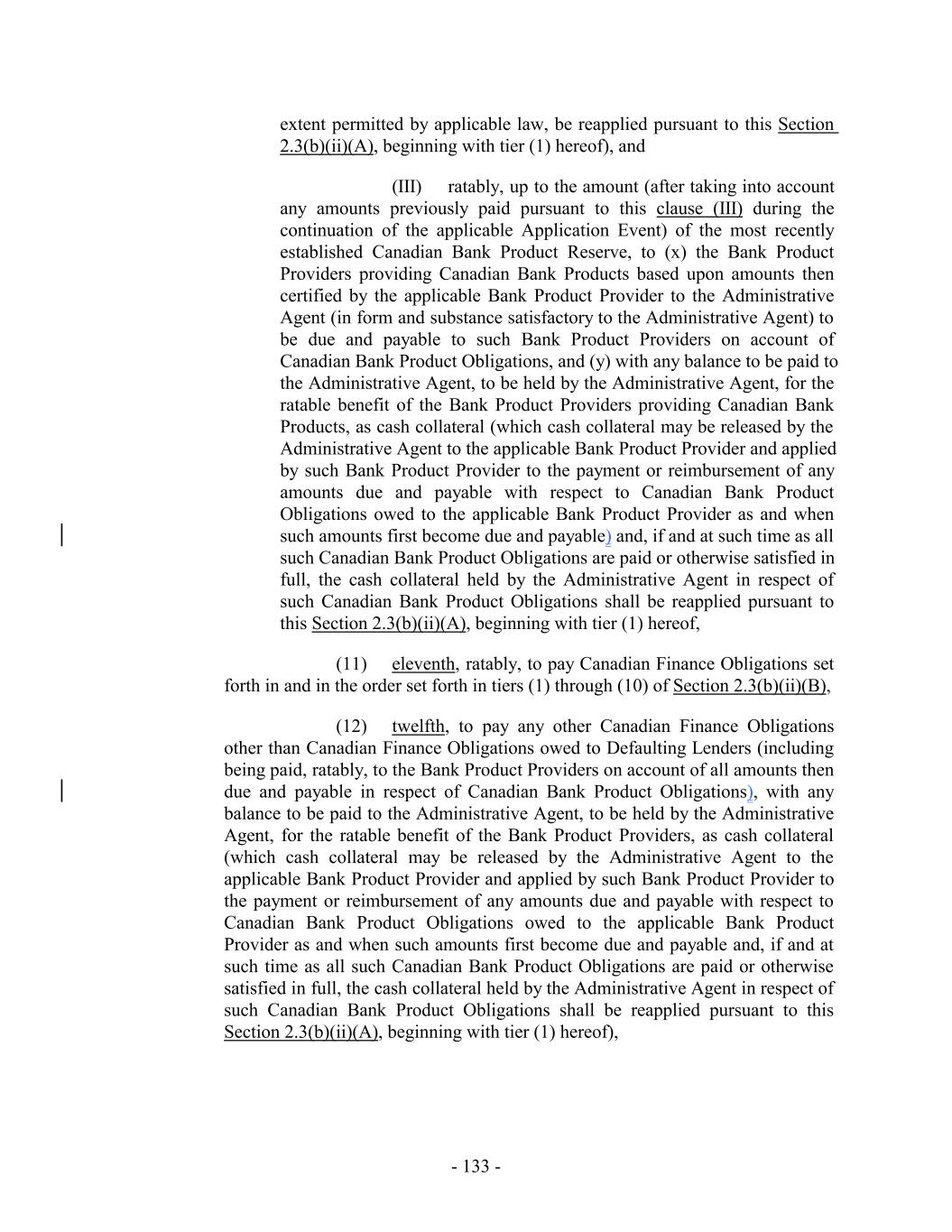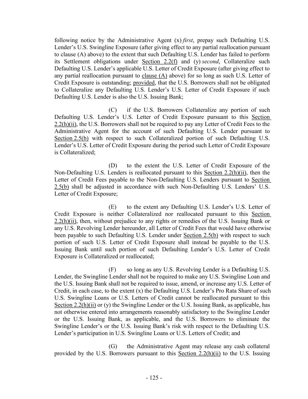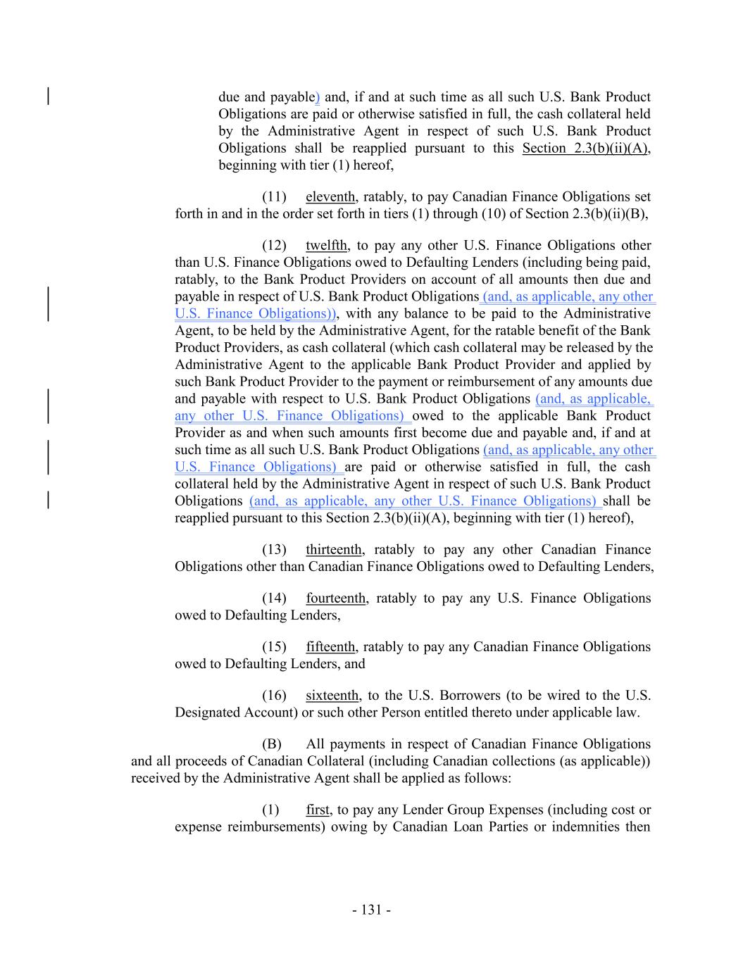 (i) after giving effect to any such Commitment Increase, the aggregate amount of Commitment Increases shall not exceed an amount equal to the greater of (x) $150,000,000, and (y) the greatest amount by which the Borrowing Base has exceeded the Maximum Global Credit Amount at fiscal month end for any of the twelve fiscal months prior to the effective date of such Commitment Increase; (ii) extensions of credit or other obligations of the Loan Parties under any Commitment Increase shall rank pari passu in right of payment and of security with the other extensions of credit and obligations of the Loan Parties hereunder; (iii) Commitments under any Commitment Increase shall not terminate, and amounts advanced under any Commitment Increase shall not mature, earlier than the Revolving Termination Date; (iv) all Commitments under any Commitment Increase (and extensions of credit thereunder) shall be subject to the terms and conditions (other than fees) applicable to Advances, Loans, Letters of Credit and Commitments hereunder; and (v) no Default or Event of Default (or, in connection with a Limited Condition Transaction, no Default or Event of Default under Section 8.1(a) or 8.1(g)) shall exist on the Incremental Closing Date with respect to any Incremental Amendment entered into in connection therewith (and after giving effect to any Advances made thereunder). (b) Each notice from the Borrower Representative to the Administrative Agent pursuant to Section 2.23(a) shall set forth the requested amount and proposed terms of the relevant Commitment Increase. All fees applicable to a Commitment Increase shall be determined by the Borrower Representative, the Administrative Agent and the Lenders participating in such Commitment Increase. (c) Commitment Increases may be provided by any existing Lender or any Additional Lender (provided that no Lender shall be obligated to provide a portion of any Commitment Increase without such Lender’s prior written consent and nothing in this Section 2.23 shall constitute a commitment by any Lender to provide a portion of any such Commitment Increase), in each case on terms permitted in this Section 2.23; provided that the Administrative Agent and the Issuing Banks shall have consented (such consent not to be unreasonably withheld, conditioned or delayed) to such Lender’s or Additional Lender’s providing such Commitment Increases if such consent would be required under Section 10.6(b) for an assignment of Loans or Commitments, as applicable, to such Lender or Additional Lender; provided, further, that the Issuing Banks shall have consented (such consent not to be unreasonably withheld, conditioned or delayed) to any Commitment Increase provided by any Additional Lender. Commitments in respect of Commitment Increases shall become Commitments, U.S. Revolving Commitments and/or Canadian Revolving Commitments, as applicable (or in the case of a Commitment Increase to be provided by an existing Lender, an increase in such Lender’s Commitment, U.S. Revolving Commitment and/or Canadian Revolving Commitment, as applicable), under this Agreement pursuant to an amendment (an “Incremental Amendment”) to this Agreement and, as appropriate, the other Loan Documents, - 181 -