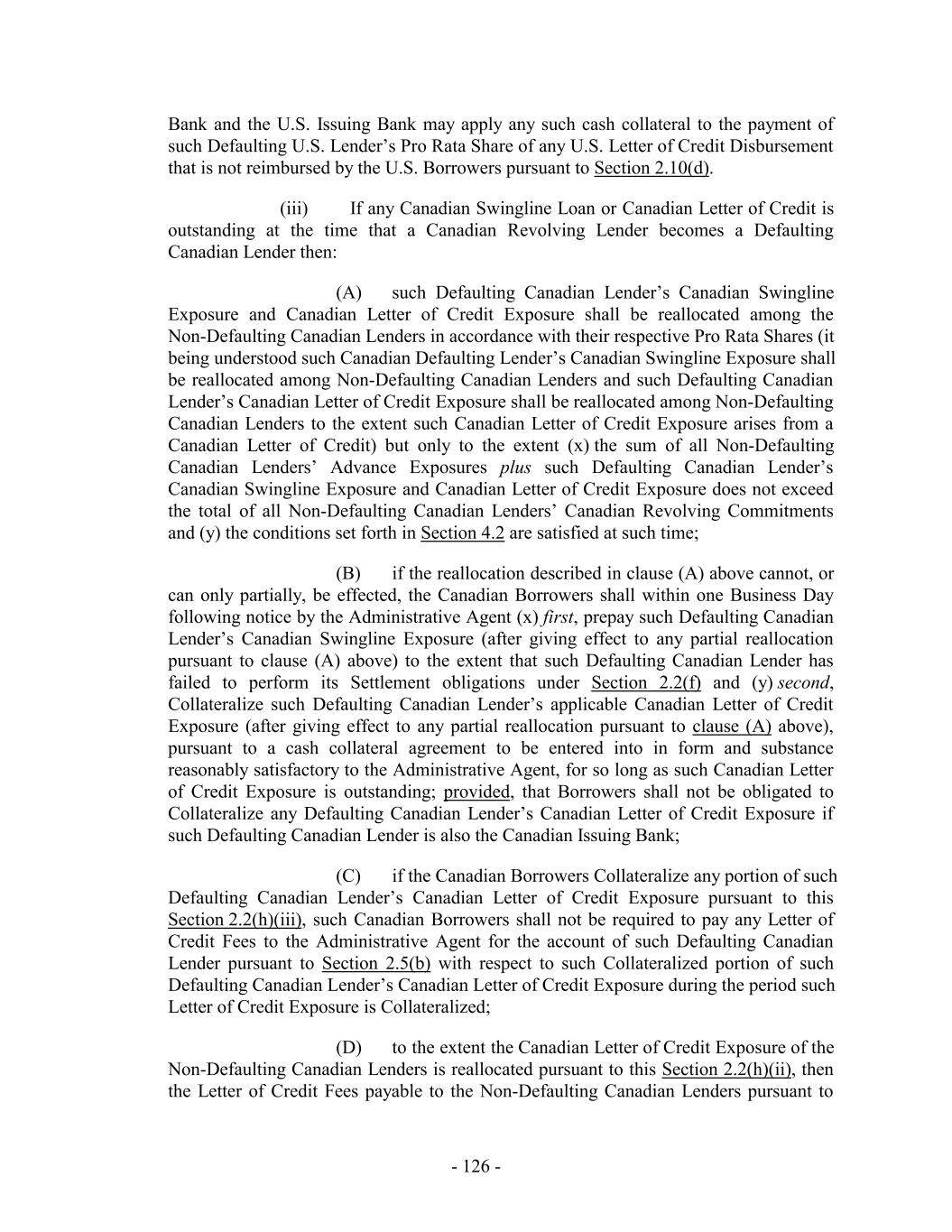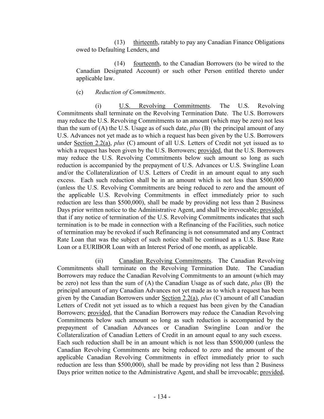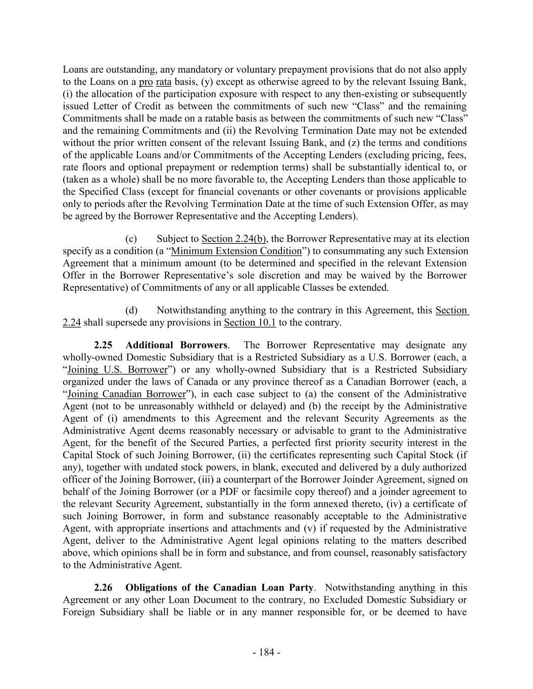 Loans are outstanding, any mandatory or voluntary prepayment provisions that do not also apply to the Loans on a pro rata basis, (y) except as otherwise agreed to by the relevant Issuing Bank, (i) the allocation of the participation exposure with respect to any then-existing or subsequently issued Letter of Credit as between the commitments of such new “Class” and the remaining Commitments shall be made on a ratable basis as between the commitments of such new “Class” and the remaining Commitments and (ii) the Revolving Termination Date may not be extended without the prior written consent of the relevant Issuing Bank, and (z) the terms and conditions of the applicable Loans and/or Commitments of the Accepting Lenders (excluding pricing, fees, rate floors and optional prepayment or redemption terms) shall be substantially identical to, or (taken as a whole) shall be no more favorable to, the Accepting Lenders than those applicable to the Specified Class (except for financial covenants or other covenants or provisions applicable only to periods after the Revolving Termination Date at the time of such Extension Offer, as may be agreed by the Borrower Representative and the Accepting Lenders). (c) Subject to Section 2.24(b), the Borrower Representative may at its election specify as a condition (a “Minimum Extension Condition”) to consummating any such Extension Agreement that a minimum amount (to be determined and specified in the relevant Extension Offer in the Borrower Representative’s sole discretion and may be waived by the Borrower Representative) of Commitments of any or all applicable Classes be extended. (d) Notwithstanding anything to the contrary in this Agreement, this Section 2.24 shall supersede any provisions in Section 10.1 to the contrary. 2.25 Additional Borrowers. The Borrower Representative may designate any wholly-owned Domestic Subsidiary that is a Restricted Subsidiary as a U.S. Borrower (each, a “Joining U.S. Borrower”) or any wholly-owned Subsidiary that is a Restricted Subsidiary organized under the laws of Canada or any province thereof as a Canadian Borrower (each, a “Joining Canadian Borrower”), in each case subject to (a) the consent of the Administrative Agent (not to be unreasonably withheld or delayed) and (b) the receipt by the Administrative Agent of (i) amendments to this Agreement and the relevant Security Agreements as the Administrative Agent deems reasonably necessary or advisable to grant to the Administrative Agent, for the benefit of the Secured Parties, a perfected first priority security interest in the Capital Stock of such Joining Borrower, (ii) the certificates representing such Capital Stock (if any), together with undated stock powers, in blank, executed and delivered by a duly authorized officer of the Joining Borrower, (iii) a counterpart of the Borrower Joinder Agreement, signed on behalf of the Joining Borrower (or a PDF or facsimile copy thereof) and a joinder agreement to the relevant Security Agreement, substantially in the form annexed thereto, (iv) a certificate of such Joining Borrower, in form and substance reasonably acceptable to the Administrative Agent, with appropriate insertions and attachments and (v) if requested by the Administrative Agent, deliver to the Administrative Agent legal opinions relating to the matters described above, which opinions shall be in form and substance, and from counsel, reasonably satisfactory to the Administrative Agent. 2.26 Obligations of the Canadian Loan Party. Notwithstanding anything in this Agreement or any other Loan Document to the contrary, no Excluded Domestic Subsidiary or Foreign Subsidiary shall be liable or in any manner responsible for, or be deemed to have - 184 -