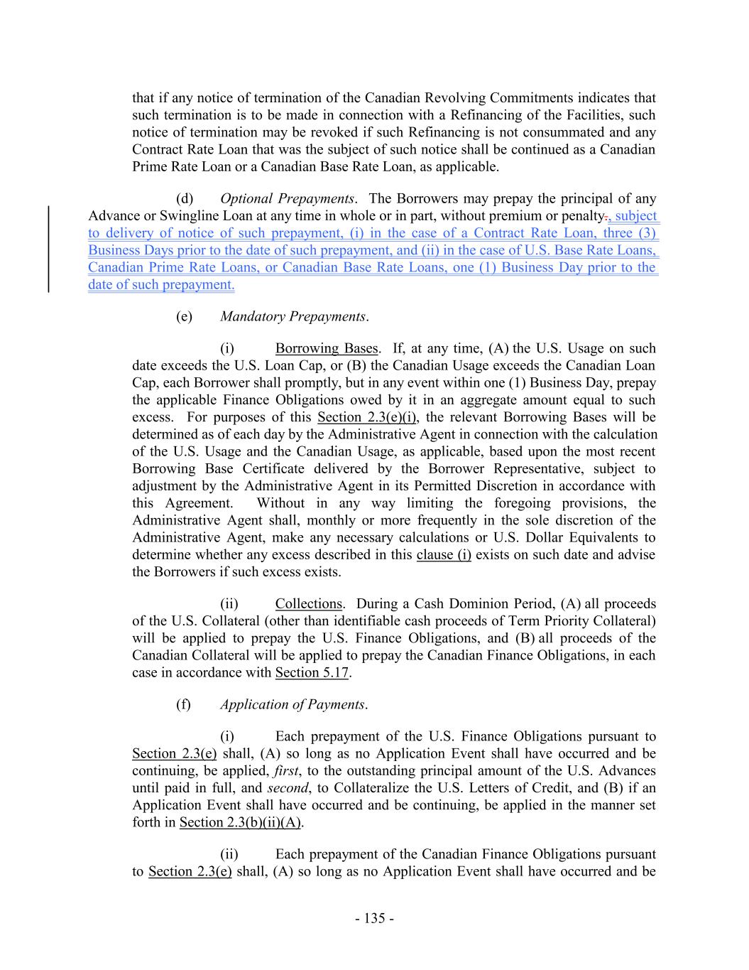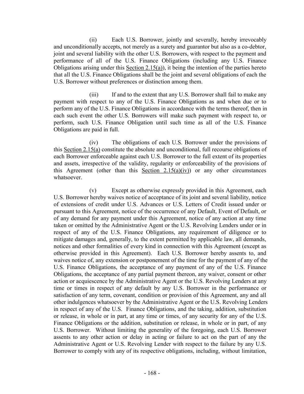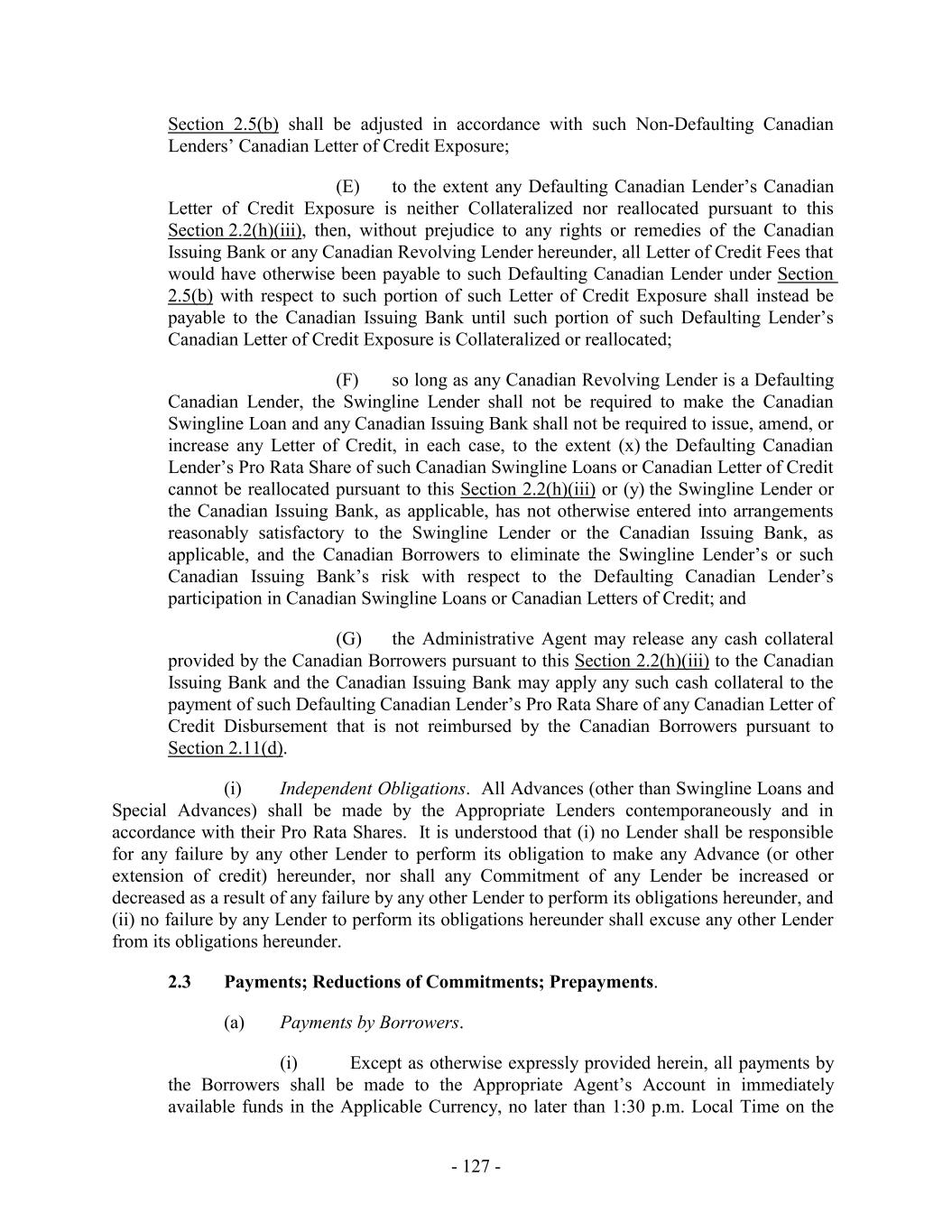 Loans are outstanding, any mandatory or voluntary prepayment provisions that do not also apply to the Loans on a pro rata basis, (y) except as otherwise agreed to by the relevant Issuing Bank, (i) the allocation of the participation exposure with respect to any then-existing or subsequently issued Letter of Credit as between the commitments of such new “Class” and the remaining Commitments shall be made on a ratable basis as between the commitments of such new “Class” and the remaining Commitments and (ii) the Revolving Termination Date may not be extended without the prior written consent of the relevant Issuing Bank, and (z) the terms and conditions of the applicable Loans and/or Commitments of the Accepting Lenders (excluding pricing, fees, rate floors and optional prepayment or redemption terms) shall be substantially identical to, or (taken as a whole) shall be no more favorable to, the Accepting Lenders than those applicable to the Specified Class (except for financial covenants or other covenants or provisions applicable only to periods after the Revolving Termination Date at the time of such Extension Offer, as may be agreed by the Borrower Representative and the Accepting Lenders). (c) Subject to Section 2.24(b), the Borrower Representative may at its election specify as a condition (a “Minimum Extension Condition”) to consummating any such Extension Agreement that a minimum amount (to be determined and specified in the relevant Extension Offer in the Borrower Representative’s sole discretion and may be waived by the Borrower Representative) of Commitments of any or all applicable Classes be extended. (d) Notwithstanding anything to the contrary in this Agreement, this Section 2.24 shall supersede any provisions in Section 10.1 to the contrary. 2.25 Additional Borrowers. The Borrower Representative may designate any wholly-owned Domestic Subsidiary that is a Restricted Subsidiary as a U.S. Borrower (each, a “Joining U.S. Borrower”) or any wholly-owned Subsidiary that is a Restricted Subsidiary organized under the laws of Canada or any province thereof as a Canadian Borrower (each, a “Joining Canadian Borrower”), in each case subject to (a) the consent of the Administrative Agent (not to be unreasonably withheld or delayed) and (b) the receipt by the Administrative Agent of (i) amendments to this Agreement and the relevant Security Agreements as the Administrative Agent deems reasonably necessary or advisable to grant to the Administrative Agent, for the benefit of the Secured Parties, a perfected first priority security interest in the Capital Stock of such Joining Borrower, (ii) the certificates representing such Capital Stock (if any), together with undated stock powers, in blank, executed and delivered by a duly authorized officer of the Joining Borrower, (iii) a counterpart of the Borrower Joinder Agreement, signed on behalf of the Joining Borrower (or a PDF or facsimile copy thereof) and a joinder agreement to the relevant Security Agreement, substantially in the form annexed thereto, (iv) a certificate of such Joining Borrower, in form and substance reasonably acceptable to the Administrative Agent, with appropriate insertions and attachments and (v) if requested by the Administrative Agent, deliver to the Administrative Agent legal opinions relating to the matters described above, which opinions shall be in form and substance, and from counsel, reasonably satisfactory to the Administrative Agent. 2.26 Obligations of the Canadian Loan Party. Notwithstanding anything in this Agreement or any other Loan Document to the contrary, no Excluded Domestic Subsidiary or Foreign Subsidiary shall be liable or in any manner responsible for, or be deemed to have - 184 -