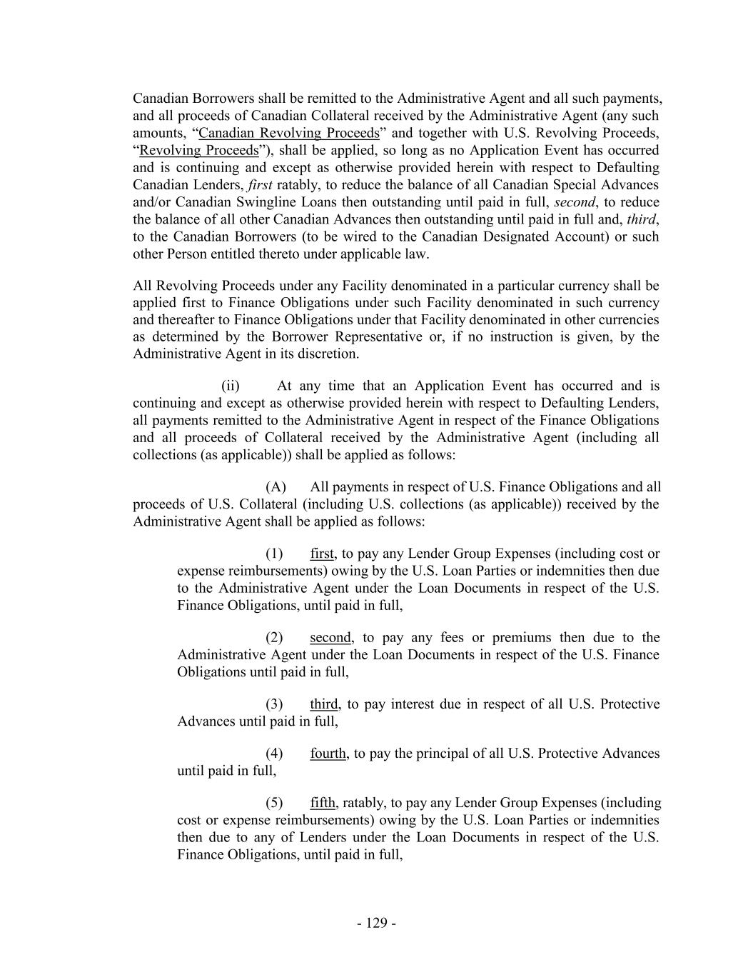 - 6 - < 50% of the Global Loan Cap 0.50% and Canadian Prime Rate Loans 1.50% EURIBOR Loans 2 > 50% of the Global Loan Cap 0.25% 1.25% 1 The Applicable Margin shall be re-determined as of the first day of each calendar month; provided, that if the Borrowers fail to deliver any Borrowing Base Certificate when due hereunder, then, upon the request of the Required Lenders, the Applicable Margin shall be set at the margin in the row styled “Level 1” on such date and shall remain in effect until the first Business Day following the date on which such Borrowing Base Certificate is delivered; provided, further, that if any Borrowing Base Certificate is at any time restated or otherwise revised or if the information set forth in any Borrowing Base Certificate otherwise proves to be false or incorrect such that the Applicable Margin would have been higher than was otherwise in effect during any period, without constituting a waiver of any Default or Event of Default arising as a result thereof, interest due under this Agreement shall be immediately recalculated at such higher rate for any such applicable periods. “Application Event”: the occurrence of (a) a failure by the Borrowers to repay all of the Finance Obligations in full on the Revolving Termination Date, or (b) an Event of Default and the election by the Administrative Agent or the Required Lenders to require that payments and proceeds of Collateral be applied pursuant to Section 2.3(b)(ii) of this Agreement. “Appropriate Lender”: at any time, with respect to any Facility, a Lender that has a Commitment with respect to such Facility or holds a Loan under such Facility at such time. “Approved Electronic Communications”: as defined in Section 10.2. “Approved European Acquisition”: as defined in the definition of “Permitted Investment.” “Approved Fund”: as defined in Section 10.6(b)(ii). “Approving Lender”: as defined in Section 1.5(a). “Asset Sale”: (1) the sale, conveyance, transfer or other Disposition (whether in a single transaction or a series of related transactions) of property or assets of the Company or any Restricted Subsidiary outside of the ordinary course of business of the Company or such Restricted Subsidiary; or (2) the issuance or sale of Equity Interests of the Company or any Restricted Subsidiary of the Company (other than directors’ qualifying shares or shares or interests