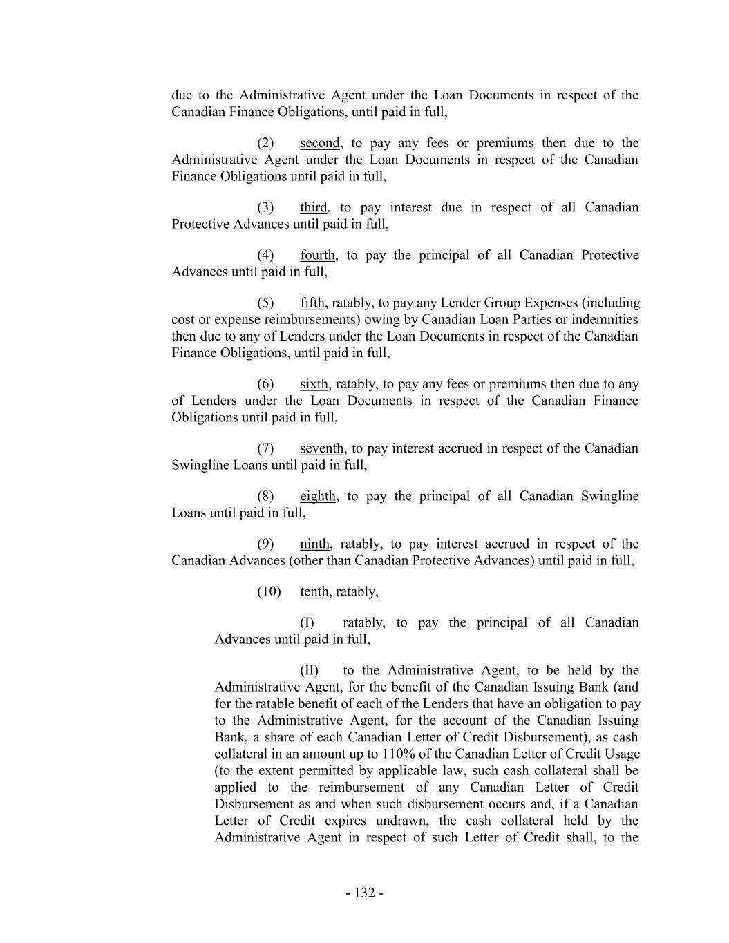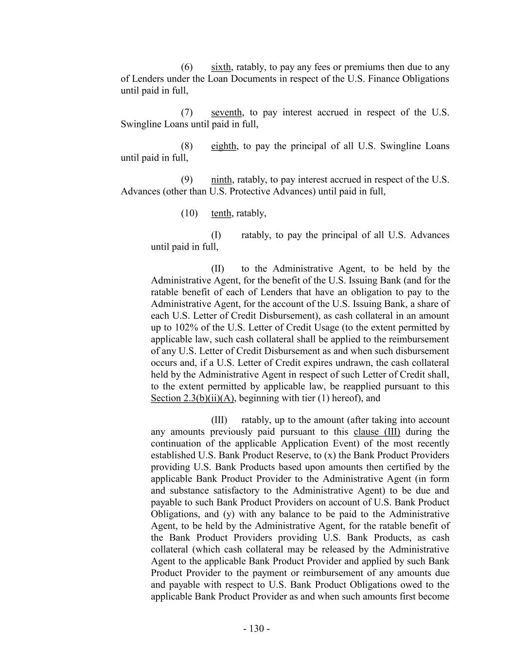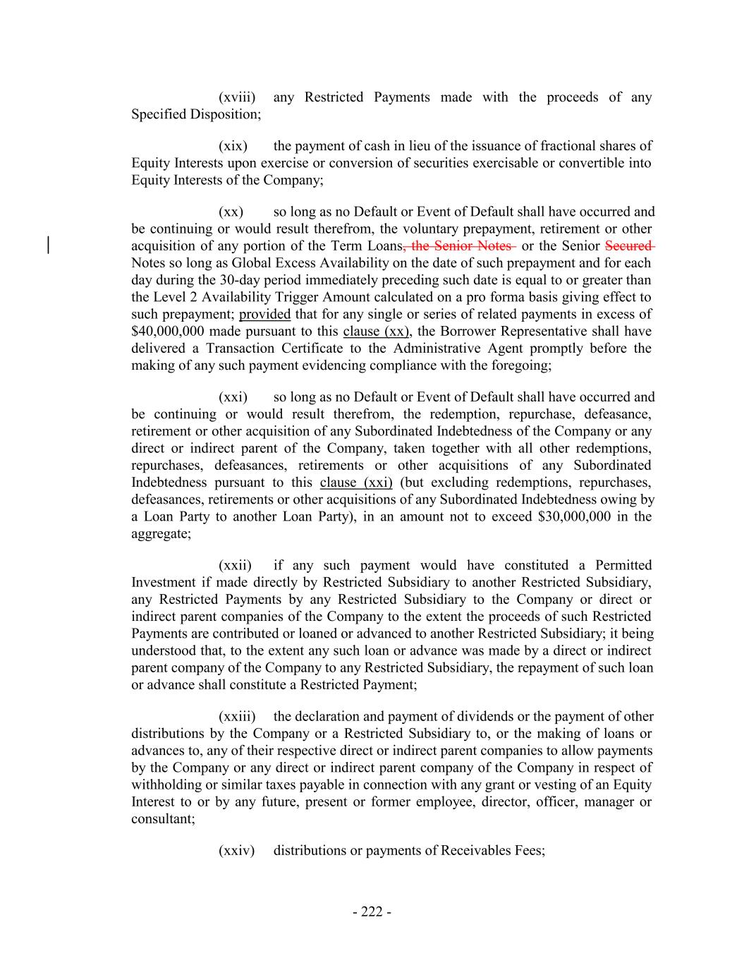 (xviii) any Restricted Payments made with the proceeds of any Specified Disposition; (xix) the payment of cash in lieu of the issuance of fractional shares of Equity Interests upon exercise or conversion of securities exercisable or convertible into Equity Interests of the Company; (xx) so long as no Default or Event of Default shall have occurred and be continuing or would result therefrom, the voluntary prepayment, retirement or other acquisition of any portion of the Term Loans, the Senior Notes or the Senior Secured Notes so long as Global Excess Availability on the date of such prepayment and for each day during the 30-day period immediately preceding such date is equal to or greater than the Level 2 Availability Trigger Amount calculated on a pro forma basis giving effect to such prepayment; provided that for any single or series of related payments in excess of $40,000,000 made pursuant to this clause (xx), the Borrower Representative shall have delivered a Transaction Certificate to the Administrative Agent promptly before the making of any such payment evidencing compliance with the foregoing; (xxi) so long as no Default or Event of Default shall have occurred and be continuing or would result therefrom, the redemption, repurchase, defeasance, retirement or other acquisition of any Subordinated Indebtedness of the Company or any direct or indirect parent of the Company, taken together with all other redemptions, repurchases, defeasances, retirements or other acquisitions of any Subordinated Indebtedness pursuant to this clause (xxi) (but excluding redemptions, repurchases, defeasances, retirements or other acquisitions of any Subordinated Indebtedness owing by a Loan Party to another Loan Party), in an amount not to exceed $30,000,000 in the aggregate; (xxii) if any such payment would have constituted a Permitted Investment if made directly by Restricted Subsidiary to another Restricted Subsidiary, any Restricted Payments by any Restricted Subsidiary to the Company or direct or indirect parent companies of the Company to the extent the proceeds of such Restricted Payments are contributed or loaned or advanced to another Restricted Subsidiary; it being understood that, to the extent any such loan or advance was made by a direct or indirect parent company of the Company to any Restricted Subsidiary, the repayment of such loan or advance shall constitute a Restricted Payment; (xxiii) the declaration and payment of dividends or the payment of other distributions by the Company or a Restricted Subsidiary to, or the making of loans or advances to, any of their respective direct or indirect parent companies to allow payments by the Company or any direct or indirect parent company of the Company in respect of withholding or similar taxes payable in connection with any grant or vesting of an Equity Interest to or by any future, present or former employee, director, officer, manager or consultant; (xxiv) distributions or payments of Receivables Fees; - 222 -