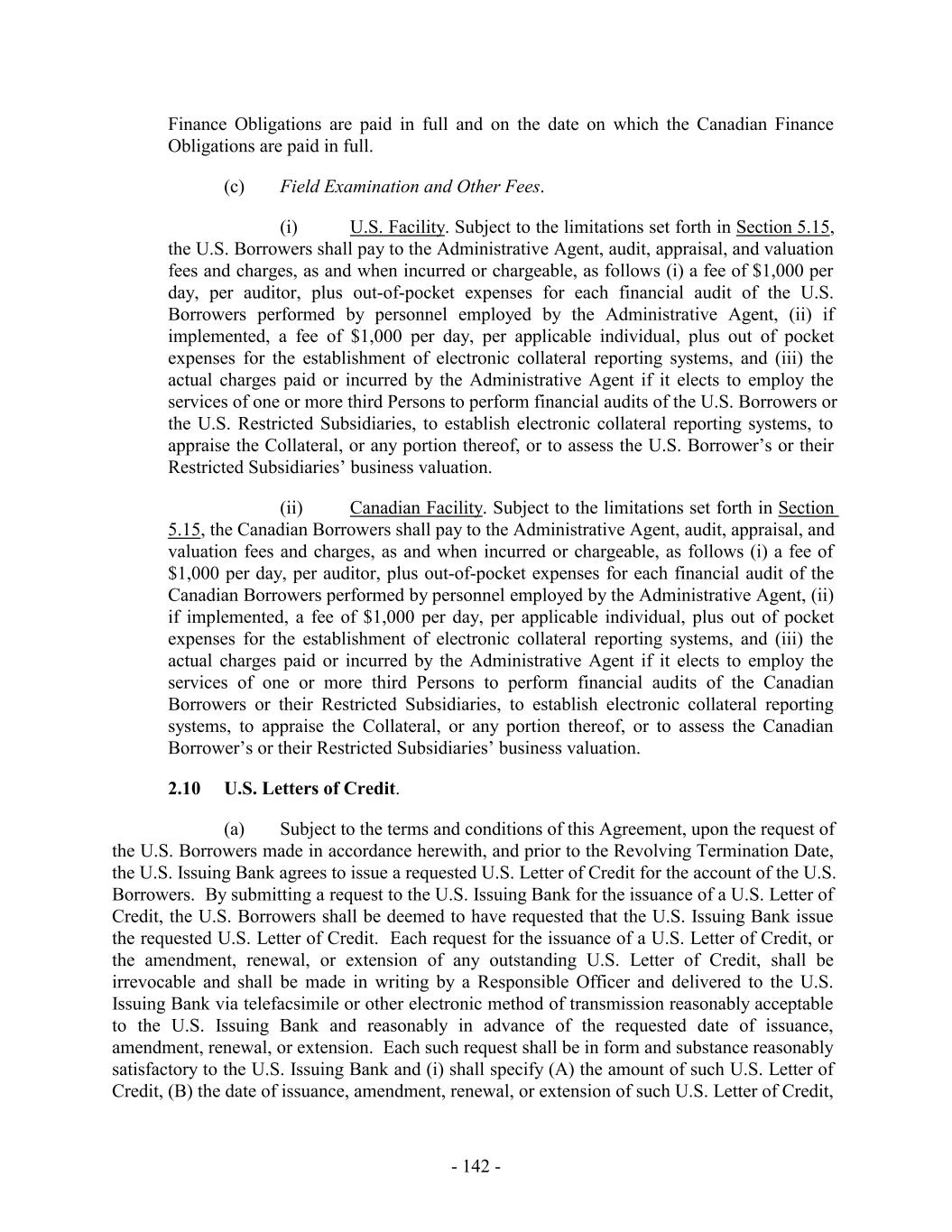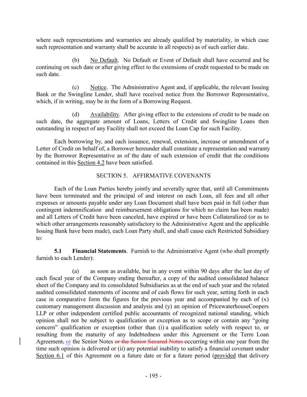 where such representations and warranties are already qualified by materiality, in which case such representation and warranty shall be accurate in all respects) as of such earlier date. (b) No Default. No Default or Event of Default shall have occurred and be continuing on such date or after giving effect to the extensions of credit requested to be made on such date. (c) Notice. The Administrative Agent and, if applicable, the relevant Issuing Bank or the Swingline Lender, shall have received notice from the Borrower Representative, which, if in writing, may be in the form of a Borrowing Request. (d) Availability. After giving effect to the extensions of credit to be made on such date, the aggregate amount of Loans, Letters of Credit and Swingline Loans then outstanding in respect of any Facility shall not exceed the Loan Cap for such Facility. Each borrowing by, and each issuance, renewal, extension, increase or amendment of a Letter of Credit on behalf of, a Borrower hereunder shall constitute a representation and warranty by the Borrower Representative as of the date of such extension of credit that the conditions contained in this Section 4.2 have been satisfied. SECTION 5. AFFIRMATIVE COVENANTS Each of the Loan Parties hereby jointly and severally agree that, until all Commitments have been terminated and the principal of and interest on each Loan, all fees and all other expenses or amounts payable under any Loan Document shall have been paid in full (other than contingent indemnification and reimbursement obligations for which no claim has been made) and all Letters of Credit have been canceled, have expired or have been Collateralized (or as to which other arrangements reasonably satisfactory to the Administrative Agent and the applicable Issuing Bank have been made), each Loan Party shall, and shall cause each Restricted Subsidiary to: 5.1 Financial Statements. Furnish to the Administrative Agent (who shall promptly furnish to each Lender): (a) as soon as available, but in any event within 90 days after the last day of each fiscal year of the Company ending thereafter, a copy of the audited consolidated balance sheet of the Company and its consolidated Subsidiaries as at the end of such year and the related audited consolidated statements of income and of cash flows for such year, setting forth in each case in comparative form the figures for the previous year and accompanied by each of (x) customary management discussion and analysis and (y) an opinion of PricewaterhouseCoopers LLP or other independent certified public accountants of recognized national standing, which opinion shall not be subject to qualification or exception as to scope or contain any “going concern” qualification or exception (other than (i) a qualification solely with respect to, or resulting from the maturity of any Indebtedness under this Agreement or the Term Loan Agreement, or the Senior Notes or the Senior Secured Notes occurring within one year from the time such opinion is delivered or (ii) any potential inability to satisfy a financial covenant under Section 6.1 of this Agreement on a future date or for a future period (provided that delivery - 195 -