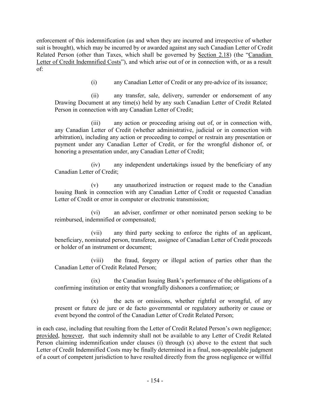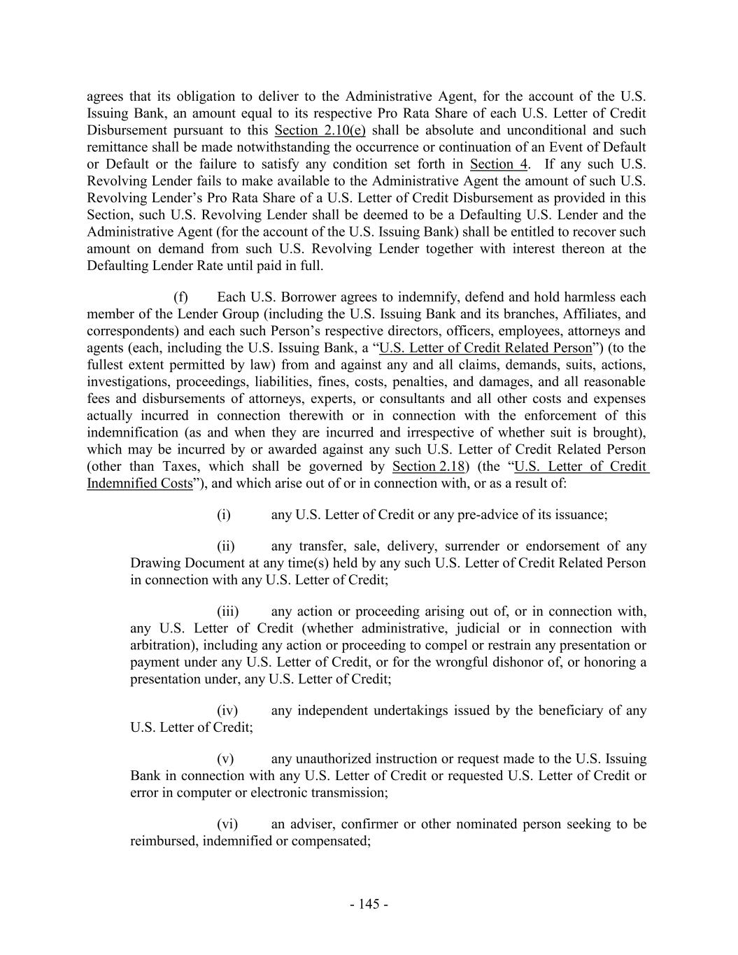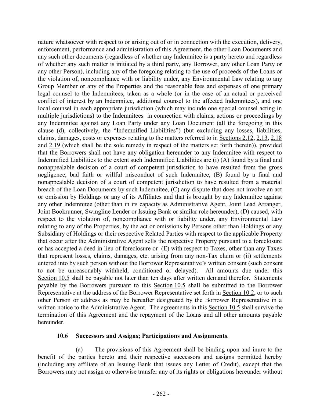 nature whatsoever with respect to or arising out of or in connection with the execution, delivery, enforcement, performance and administration of this Agreement, the other Loan Documents and any such other documents (regardless of whether any Indemnitee is a party hereto and regardless of whether any such matter is initiated by a third party, any Borrower, any other Loan Party or any other Person), including any of the foregoing relating to the use of proceeds of the Loans or the violation of, noncompliance with or liability under, any Environmental Law relating to any Group Member or any of the Properties and the reasonable fees and expenses of one primary legal counsel to the Indemnitees, taken as a whole (or in the case of an actual or perceived conflict of interest by an Indemnitee, additional counsel to the affected Indemnitees), and one local counsel in each appropriate jurisdiction (which may include one special counsel acting in multiple jurisdictions) to the Indemnitees in connection with claims, actions or proceedings by any Indemnitee against any Loan Party under any Loan Document (all the foregoing in this clause (d), collectively, the “Indemnified Liabilities”) (but excluding any losses, liabilities, claims, damages, costs or expenses relating to the matters referred to in Sections 2.12, 2.13, 2.18 and 2.19 (which shall be the sole remedy in respect of the matters set forth therein)), provided that the Borrowers shall not have any obligation hereunder to any Indemnitee with respect to Indemnified Liabilities to the extent such Indemnified Liabilities are (i) (A) found by a final and nonappealable decision of a court of competent jurisdiction to have resulted from the gross negligence, bad faith or willful misconduct of such Indemnitee, (B) found by a final and nonappealable decision of a court of competent jurisdiction to have resulted from a material breach of the Loan Documents by such Indemnitee, (C) any dispute that does not involve an act or omission by Holdings or any of its Affiliates and that is brought by any Indemnitee against any other Indemnitee (other than in its capacity as Administrative Agent, Joint Lead Arranger, Joint Bookrunner, Swingline Lender or Issuing Bank or similar role hereunder), (D) caused, with respect to the violation of, noncompliance with or liability under, any Environmental Law relating to any of the Properties, by the act or omissions by Persons other than Holdings or any Subsidiary of Holdings or their respective Related Parties with respect to the applicable Property that occur after the Administrative Agent sells the respective Property pursuant to a foreclosure or has accepted a deed in lieu of foreclosure or (E) with respect to Taxes, other than any Taxes that represent losses, claims, damages, etc. arising from any non-Tax claim or (ii) settlements entered into by such person without the Borrower Representative’s written consent (such consent to not be unreasonably withheld, conditioned or delayed). All amounts due under this Section 10.5 shall be payable not later than ten days after written demand therefor. Statements payable by the Borrowers pursuant to this Section 10.5 shall be submitted to the Borrower Representative at the address of the Borrower Representative set forth in Section 10.2, or to such other Person or address as may be hereafter designated by the Borrower Representative in a written notice to the Administrative Agent. The agreements in this Section 10.5 shall survive the termination of this Agreement and the repayment of the Loans and all other amounts payable hereunder. 10.6 Successors and Assigns; Participations and Assignments. (a) The provisions of this Agreement shall be binding upon and inure to the benefit of the parties hereto and their respective successors and assigns permitted hereby (including any affiliate of an Issuing Bank that issues any Letter of Credit), except that the Borrowers may not assign or otherwise transfer any of its rights or obligations hereunder without - 262 -