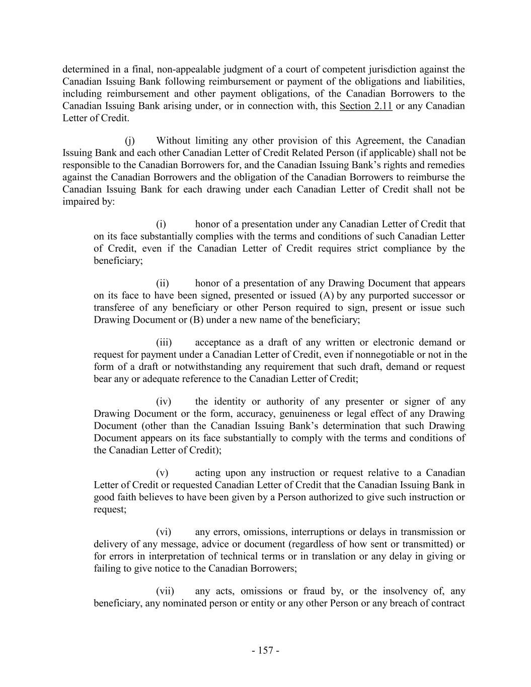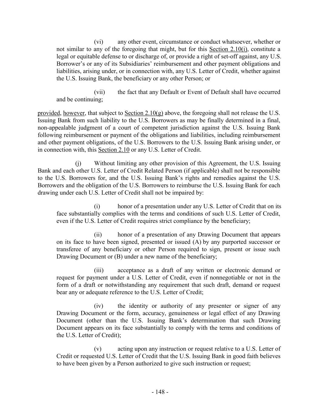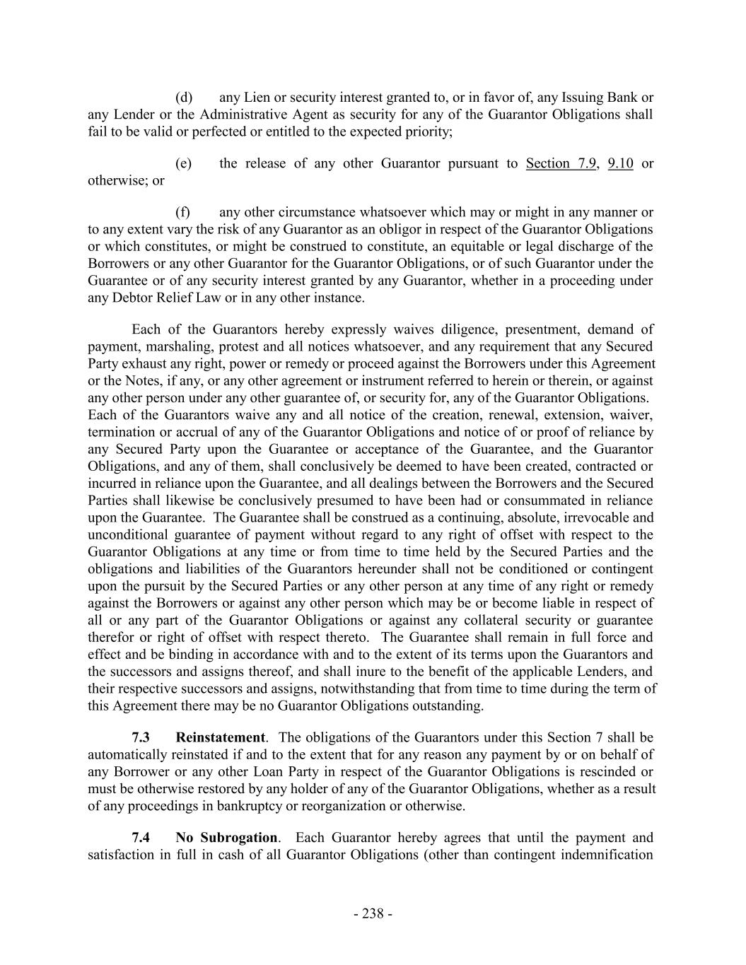 (d) any Lien or security interest granted to, or in favor of, any Issuing Bank or any Lender or the Administrative Agent as security for any of the Guarantor Obligations shall fail to be valid or perfected or entitled to the expected priority; (e) the release of any other Guarantor pursuant to Section 7.9, 9.10 or otherwise; or (f) any other circumstance whatsoever which may or might in any manner or to any extent vary the risk of any Guarantor as an obligor in respect of the Guarantor Obligations or which constitutes, or might be construed to constitute, an equitable or legal discharge of the Borrowers or any other Guarantor for the Guarantor Obligations, or of such Guarantor under the Guarantee or of any security interest granted by any Guarantor, whether in a proceeding under any Debtor Relief Law or in any other instance. Each of the Guarantors hereby expressly waives diligence, presentment, demand of payment, marshaling, protest and all notices whatsoever, and any requirement that any Secured Party exhaust any right, power or remedy or proceed against the Borrowers under this Agreement or the Notes, if any, or any other agreement or instrument referred to herein or therein, or against any other person under any other guarantee of, or security for, any of the Guarantor Obligations. Each of the Guarantors waive any and all notice of the creation, renewal, extension, waiver, termination or accrual of any of the Guarantor Obligations and notice of or proof of reliance by any Secured Party upon the Guarantee or acceptance of the Guarantee, and the Guarantor Obligations, and any of them, shall conclusively be deemed to have been created, contracted or incurred in reliance upon the Guarantee, and all dealings between the Borrowers and the Secured Parties shall likewise be conclusively presumed to have been had or consummated in reliance upon the Guarantee. The Guarantee shall be construed as a continuing, absolute, irrevocable and unconditional guarantee of payment without regard to any right of offset with respect to the Guarantor Obligations at any time or from time to time held by the Secured Parties and the obligations and liabilities of the Guarantors hereunder shall not be conditioned or contingent upon the pursuit by the Secured Parties or any other person at any time of any right or remedy against the Borrowers or against any other person which may be or become liable in respect of all or any part of the Guarantor Obligations or against any collateral security or guarantee therefor or right of offset with respect thereto. The Guarantee shall remain in full force and effect and be binding in accordance with and to the extent of its terms upon the Guarantors and the successors and assigns thereof, and shall inure to the benefit of the applicable Lenders, and their respective successors and assigns, notwithstanding that from time to time during the term of this Agreement there may be no Guarantor Obligations outstanding. 7.3 Reinstatement. The obligations of the Guarantors under this Section 7 shall be automatically reinstated if and to the extent that for any reason any payment by or on behalf of any Borrower or any other Loan Party in respect of the Guarantor Obligations is rescinded or must be otherwise restored by any holder of any of the Guarantor Obligations, whether as a result of any proceedings in bankruptcy or reorganization or otherwise. 7.4 No Subrogation. Each Guarantor hereby agrees that until the payment and satisfaction in full in cash of all Guarantor Obligations (other than contingent indemnification - 238 -