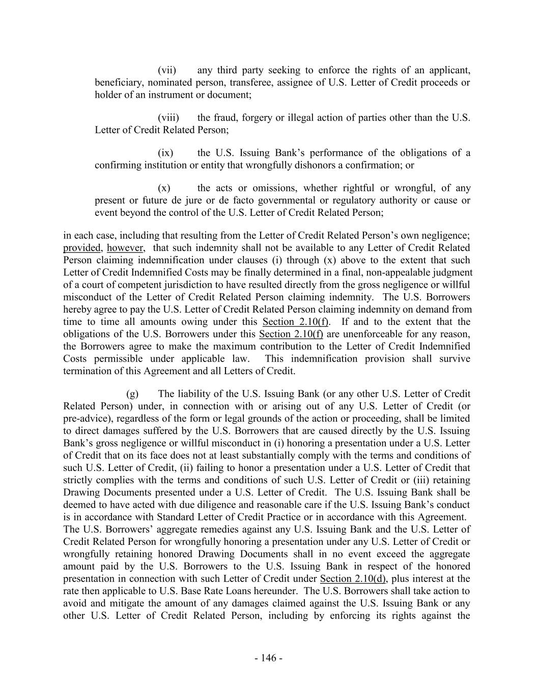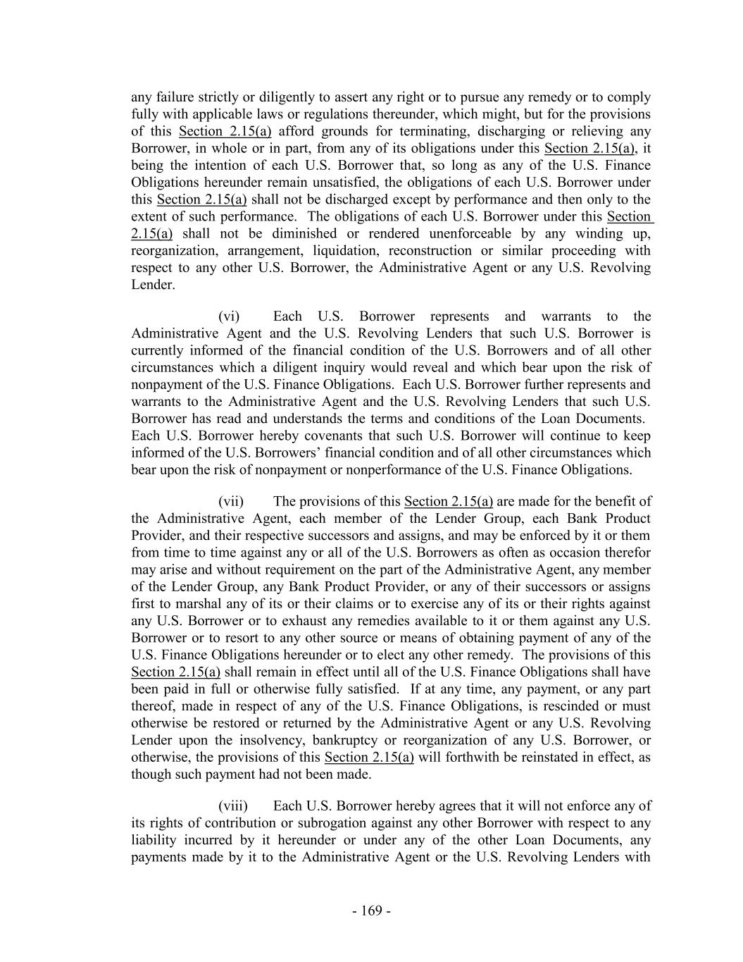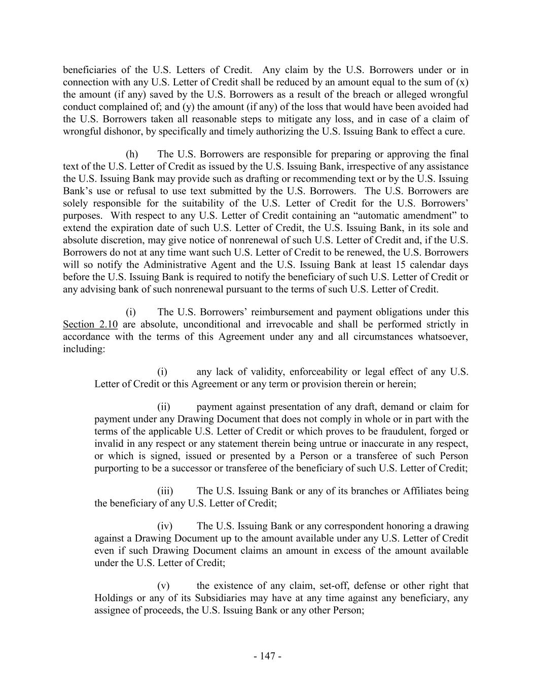 (d) any Lien or security interest granted to, or in favor of, any Issuing Bank or any Lender or the Administrative Agent as security for any of the Guarantor Obligations shall fail to be valid or perfected or entitled to the expected priority; (e) the release of any other Guarantor pursuant to Section 7.9, 9.10 or otherwise; or (f) any other circumstance whatsoever which may or might in any manner or to any extent vary the risk of any Guarantor as an obligor in respect of the Guarantor Obligations or which constitutes, or might be construed to constitute, an equitable or legal discharge of the Borrowers or any other Guarantor for the Guarantor Obligations, or of such Guarantor under the Guarantee or of any security interest granted by any Guarantor, whether in a proceeding under any Debtor Relief Law or in any other instance. Each of the Guarantors hereby expressly waives diligence, presentment, demand of payment, marshaling, protest and all notices whatsoever, and any requirement that any Secured Party exhaust any right, power or remedy or proceed against the Borrowers under this Agreement or the Notes, if any, or any other agreement or instrument referred to herein or therein, or against any other person under any other guarantee of, or security for, any of the Guarantor Obligations. Each of the Guarantors waive any and all notice of the creation, renewal, extension, waiver, termination or accrual of any of the Guarantor Obligations and notice of or proof of reliance by any Secured Party upon the Guarantee or acceptance of the Guarantee, and the Guarantor Obligations, and any of them, shall conclusively be deemed to have been created, contracted or incurred in reliance upon the Guarantee, and all dealings between the Borrowers and the Secured Parties shall likewise be conclusively presumed to have been had or consummated in reliance upon the Guarantee. The Guarantee shall be construed as a continuing, absolute, irrevocable and unconditional guarantee of payment without regard to any right of offset with respect to the Guarantor Obligations at any time or from time to time held by the Secured Parties and the obligations and liabilities of the Guarantors hereunder shall not be conditioned or contingent upon the pursuit by the Secured Parties or any other person at any time of any right or remedy against the Borrowers or against any other person which may be or become liable in respect of all or any part of the Guarantor Obligations or against any collateral security or guarantee therefor or right of offset with respect thereto. The Guarantee shall remain in full force and effect and be binding in accordance with and to the extent of its terms upon the Guarantors and the successors and assigns thereof, and shall inure to the benefit of the applicable Lenders, and their respective successors and assigns, notwithstanding that from time to time during the term of this Agreement there may be no Guarantor Obligations outstanding. 7.3 Reinstatement. The obligations of the Guarantors under this Section 7 shall be automatically reinstated if and to the extent that for any reason any payment by or on behalf of any Borrower or any other Loan Party in respect of the Guarantor Obligations is rescinded or must be otherwise restored by any holder of any of the Guarantor Obligations, whether as a result of any proceedings in bankruptcy or reorganization or otherwise. 7.4 No Subrogation. Each Guarantor hereby agrees that until the payment and satisfaction in full in cash of all Guarantor Obligations (other than contingent indemnification - 238 -