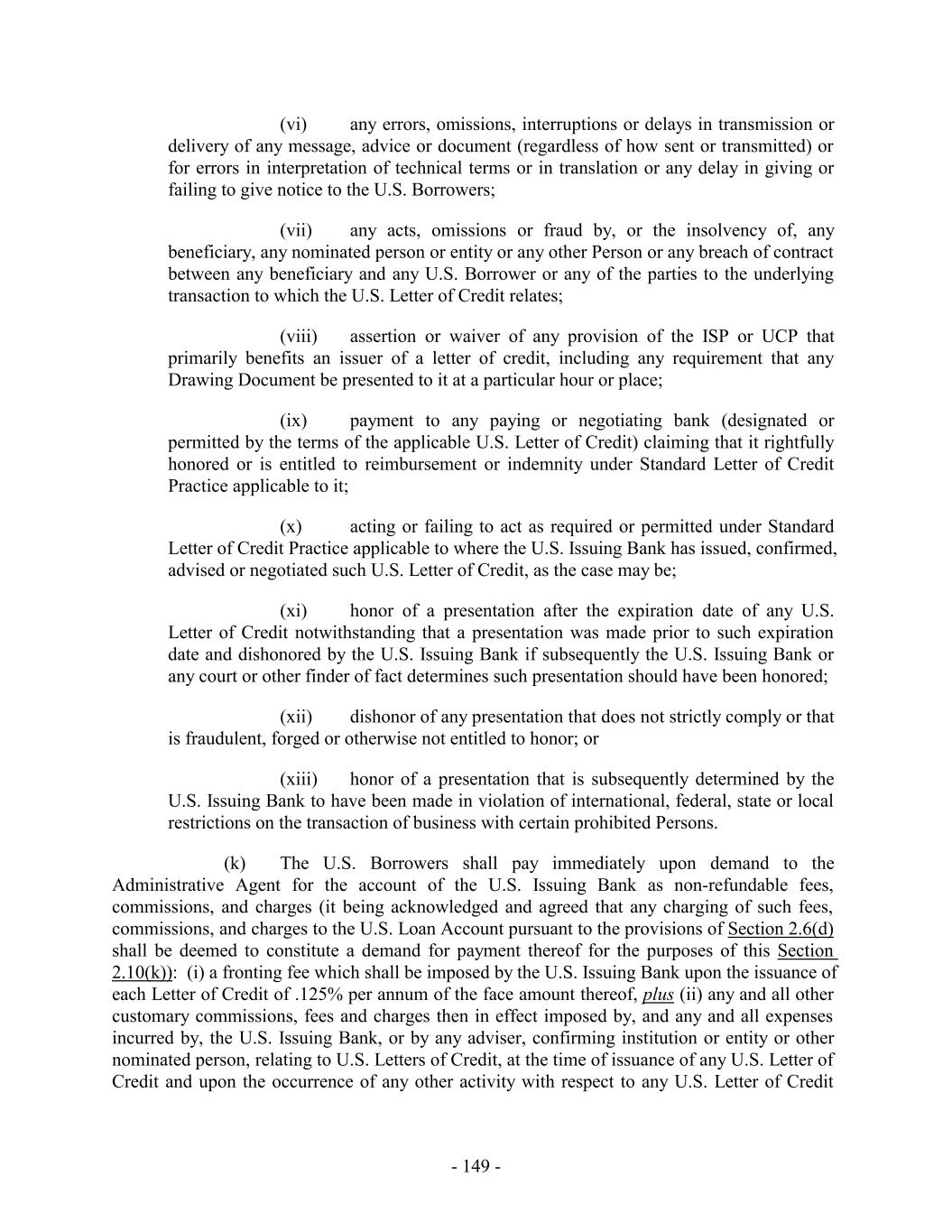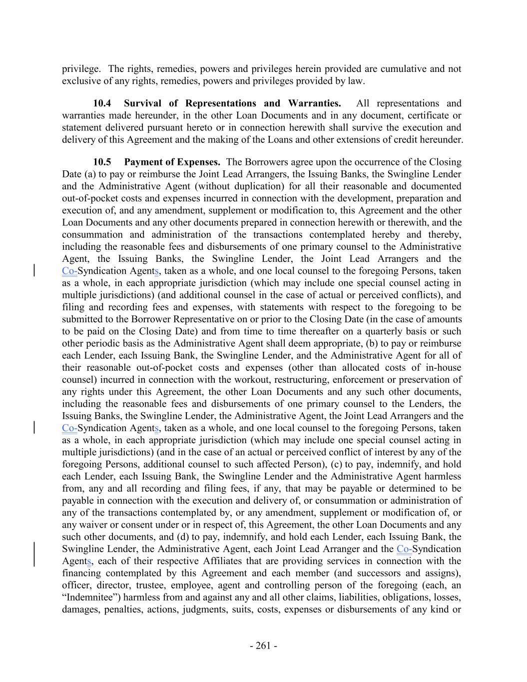 privilege. The rights, remedies, powers and privileges herein provided are cumulative and not exclusive of any rights, remedies, powers and privileges provided by law. 10.4 Survival of Representations and Warranties. All representations and warranties made hereunder, in the other Loan Documents and in any document, certificate or statement delivered pursuant hereto or in connection herewith shall survive the execution and delivery of this Agreement and the making of the Loans and other extensions of credit hereunder. 10.5 Payment of Expenses. The Borrowers agree upon the occurrence of the Closing Date (a) to pay or reimburse the Joint Lead Arrangers, the Issuing Banks, the Swingline Lender and the Administrative Agent (without duplication) for all their reasonable and documented out-of-pocket costs and expenses incurred in connection with the development, preparation and execution of, and any amendment, supplement or modification to, this Agreement and the other Loan Documents and any other documents prepared in connection herewith or therewith, and the consummation and administration of the transactions contemplated hereby and thereby, including the reasonable fees and disbursements of one primary counsel to the Administrative Agent, the Issuing Banks, the Swingline Lender, the Joint Lead Arrangers and the Co-Syndication Agents, taken as a whole, and one local counsel to the foregoing Persons, taken as a whole, in each appropriate jurisdiction (which may include one special counsel acting in multiple jurisdictions) (and additional counsel in the case of actual or perceived conflicts), and filing and recording fees and expenses, with statements with respect to the foregoing to be submitted to the Borrower Representative on or prior to the Closing Date (in the case of amounts to be paid on the Closing Date) and from time to time thereafter on a quarterly basis or such other periodic basis as the Administrative Agent shall deem appropriate, (b) to pay or reimburse each Lender, each Issuing Bank, the Swingline Lender, and the Administrative Agent for all of their reasonable out-of-pocket costs and expenses (other than allocated costs of in-house counsel) incurred in connection with the workout, restructuring, enforcement or preservation of any rights under this Agreement, the other Loan Documents and any such other documents, including the reasonable fees and disbursements of one primary counsel to the Lenders, the Issuing Banks, the Swingline Lender, the Administrative Agent, the Joint Lead Arrangers and the Co-Syndication Agents, taken as a whole, and one local counsel to the foregoing Persons, taken as a whole, in each appropriate jurisdiction (which may include one special counsel acting in multiple jurisdictions) (and in the case of an actual or perceived conflict of interest by any of the foregoing Persons, additional counsel to such affected Person), (c) to pay, indemnify, and hold each Lender, each Issuing Bank, the Swingline Lender and the Administrative Agent harmless from, any and all recording and filing fees, if any, that may be payable or determined to be payable in connection with the execution and delivery of, or consummation or administration of any of the transactions contemplated by, or any amendment, supplement or modification of, or any waiver or consent under or in respect of, this Agreement, the other Loan Documents and any such other documents, and (d) to pay, indemnify, and hold each Lender, each Issuing Bank, the Swingline Lender, the Administrative Agent, each Joint Lead Arranger and the Co-Syndication Agents, each of their respective Affiliates that are providing services in connection with the financing contemplated by this Agreement and each member (and successors and assigns), officer, director, trustee, employee, agent and controlling person of the foregoing (each, an “Indemnitee”) harmless from and against any and all other claims, liabilities, obligations, losses, damages, penalties, actions, judgments, suits, costs, expenses or disbursements of any kind or - 261 -
