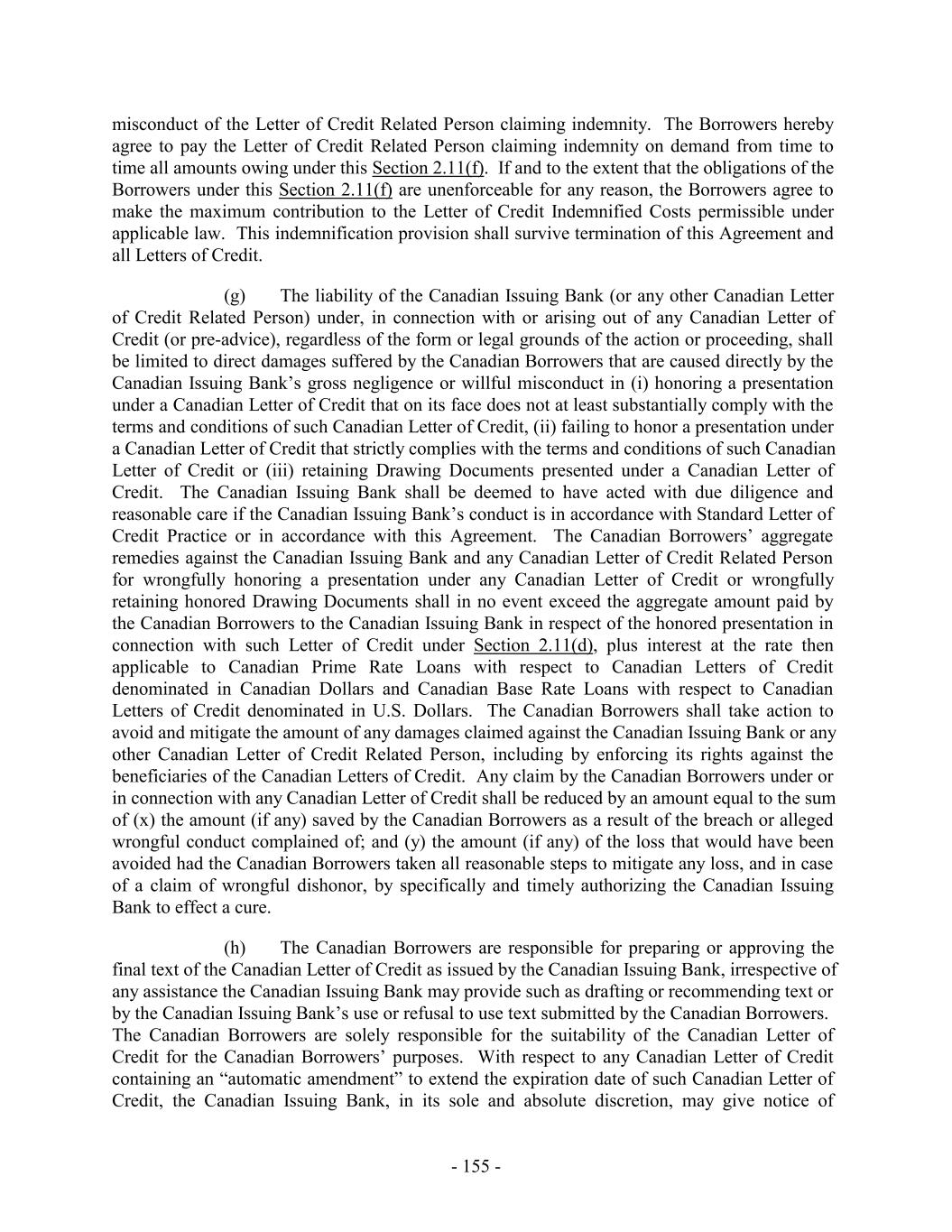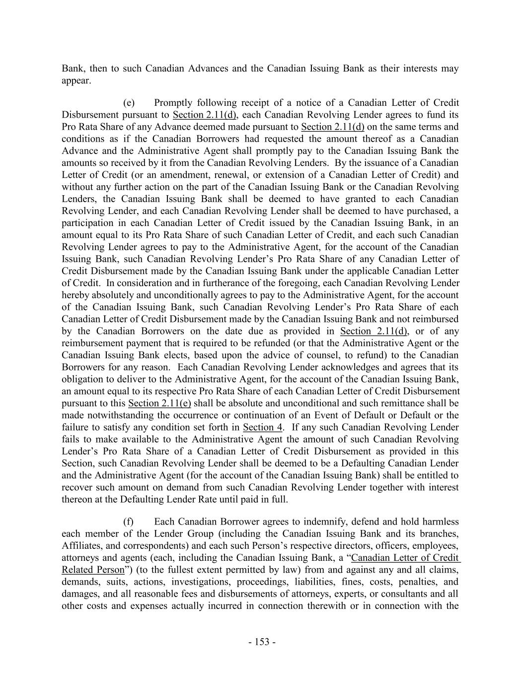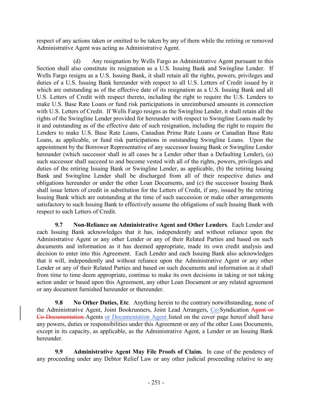 respect of any actions taken or omitted to be taken by any of them while the retiring or removed Administrative Agent was acting as Administrative Agent. (d) Any resignation by Wells Fargo as Administrative Agent pursuant to this Section shall also constitute its resignation as a U.S. Issuing Bank and Swingline Lender. If Wells Fargo resigns as a U.S. Issuing Bank, it shall retain all the rights, powers, privileges and duties of a U.S. Issuing Bank hereunder with respect to all U.S. Letters of Credit issued by it which are outstanding as of the effective date of its resignation as a U.S. Issuing Bank and all U.S. Letters of Credit with respect thereto, including the right to require the U.S. Lenders to make U.S. Base Rate Loans or fund risk participations in unreimbursed amounts in connection with U.S. Letters of Credit. If Wells Fargo resigns as the Swingline Lender, it shall retain all the rights of the Swingline Lender provided for hereunder with respect to Swingline Loans made by it and outstanding as of the effective date of such resignation, including the right to require the Lenders to make U.S. Base Rate Loans, Canadian Prime Rate Loans or Canadian Base Rate Loans, as applicable, or fund risk participations in outstanding Swingline Loans. Upon the appointment by the Borrower Representative of any successor Issuing Bank or Swingline Lender hereunder (which successor shall in all cases be a Lender other than a Defaulting Lender), (a) such successor shall succeed to and become vested with all of the rights, powers, privileges and duties of the retiring Issuing Bank or Swingline Lender, as applicable, (b) the retiring Issuing Bank and Swingline Lender shall be discharged from all of their respective duties and obligations hereunder or under the other Loan Documents, and (c) the successor Issuing Bank shall issue letters of credit in substitution for the Letters of Credit, if any, issued by the retiring Issuing Bank which are outstanding at the time of such succession or make other arrangements satisfactory to such Issuing Bank to effectively assume the obligations of such Issuing Bank with respect to such Letters of Credit. 9.7 Non-Reliance on Administrative Agent and Other Lenders. Each Lender and each Issuing Bank acknowledges that it has, independently and without reliance upon the Administrative Agent or any other Lender or any of their Related Parties and based on such documents and information as it has deemed appropriate, made its own credit analysis and decision to enter into this Agreement. Each Lender and each Issuing Bank also acknowledges that it will, independently and without reliance upon the Administrative Agent or any other Lender or any of their Related Parties and based on such documents and information as it shall from time to time deem appropriate, continue to make its own decisions in taking or not taking action under or based upon this Agreement, any other Loan Document or any related agreement or any document furnished hereunder or thereunder. 9.8 No Other Duties, Etc. Anything herein to the contrary notwithstanding, none of the Administrative Agent, Joint Bookrunners, Joint Lead Arrangers, Co-Syndication Agent or Co-Documentation Agents or Documentation Agent listed on the cover page hereof shall have any powers, duties or responsibilities under this Agreement or any of the other Loan Documents, except in its capacity, as applicable, as the Administrative Agent, a Lender or an Issuing Bank hereunder. 9.9 Administrative Agent May File Proofs of Claim. In case of the pendency of any proceeding under any Debtor Relief Law or any other judicial proceeding relative to any - 251 -