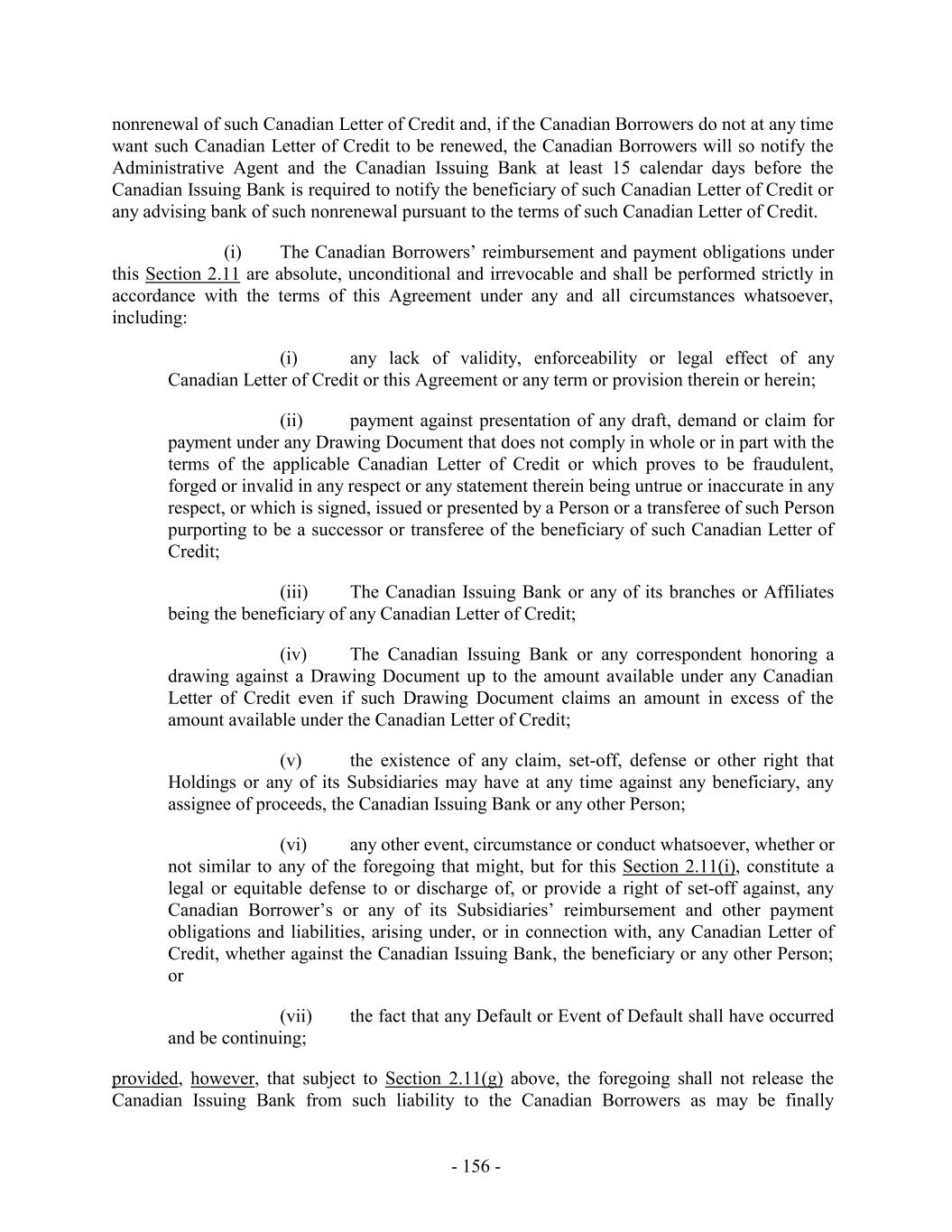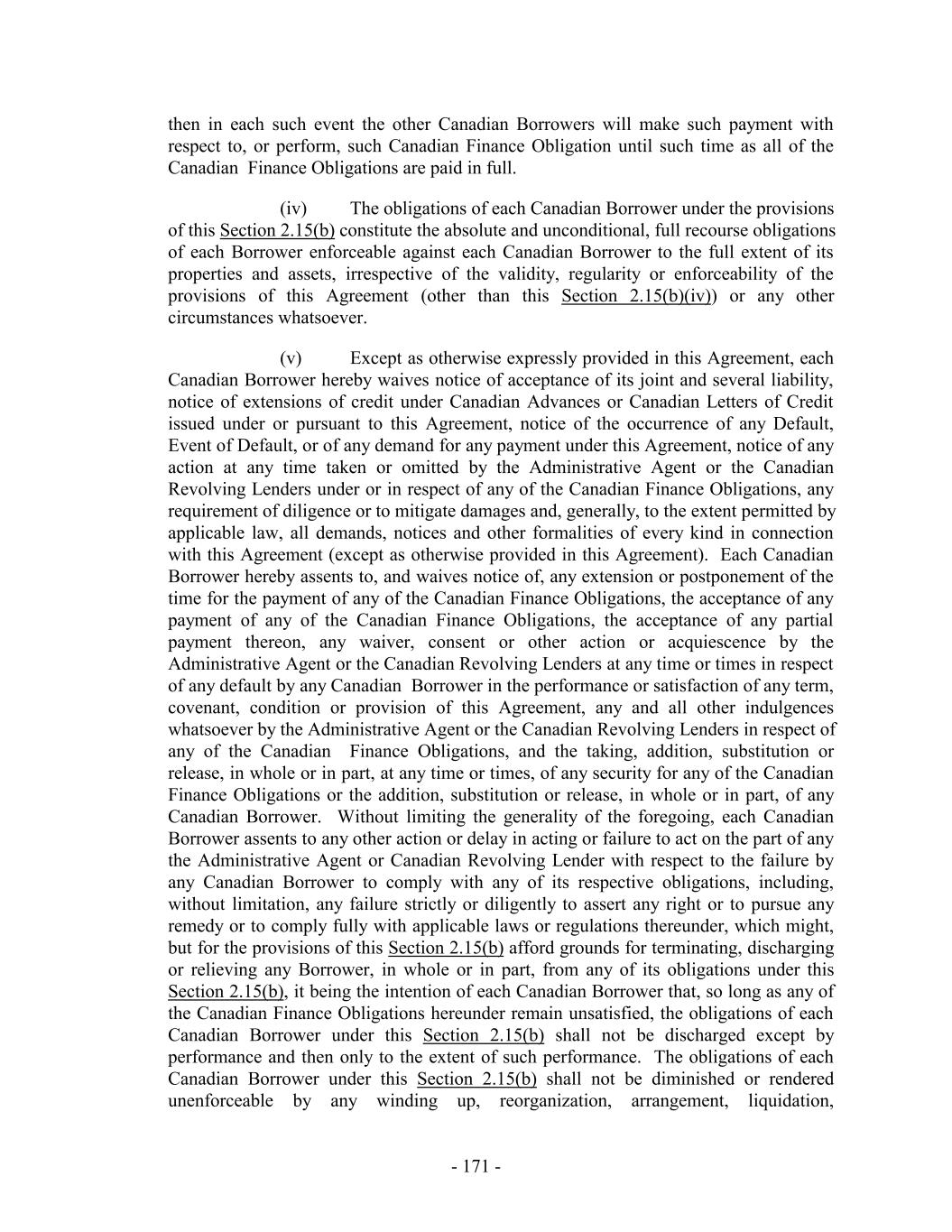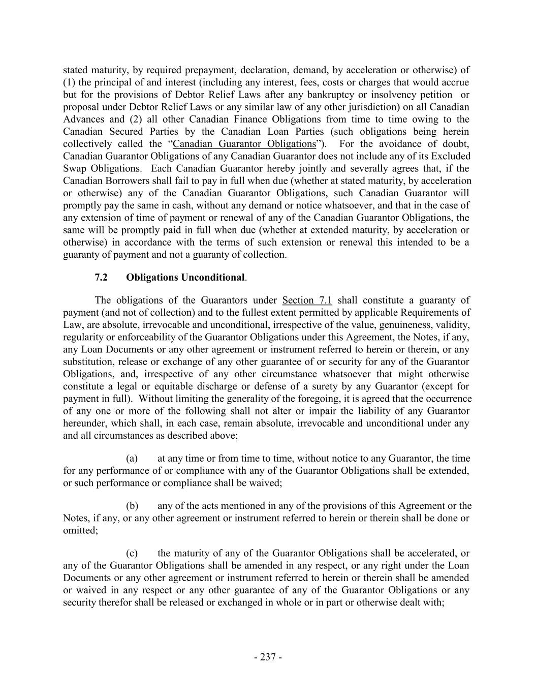 stated maturity, by required prepayment, declaration, demand, by acceleration or otherwise) of (1) the principal of and interest (including any interest, fees, costs or charges that would accrue but for the provisions of Debtor Relief Laws after any bankruptcy or insolvency petition or proposal under Debtor Relief Laws or any similar law of any other jurisdiction) on all Canadian Advances and (2) all other Canadian Finance Obligations from time to time owing to the Canadian Secured Parties by the Canadian Loan Parties (such obligations being herein collectively called the “Canadian Guarantor Obligations”). For the avoidance of doubt, Canadian Guarantor Obligations of any Canadian Guarantor does not include any of its Excluded Swap Obligations. Each Canadian Guarantor hereby jointly and severally agrees that, if the Canadian Borrowers shall fail to pay in full when due (whether at stated maturity, by acceleration or otherwise) any of the Canadian Guarantor Obligations, such Canadian Guarantor will promptly pay the same in cash, without any demand or notice whatsoever, and that in the case of any extension of time of payment or renewal of any of the Canadian Guarantor Obligations, the same will be promptly paid in full when due (whether at extended maturity, by acceleration or otherwise) in accordance with the terms of such extension or renewal this intended to be a guaranty of payment and not a guaranty of collection. 7.2 Obligations Unconditional. The obligations of the Guarantors under Section 7.1 shall constitute a guaranty of payment (and not of collection) and to the fullest extent permitted by applicable Requirements of Law, are absolute, irrevocable and unconditional, irrespective of the value, genuineness, validity, regularity or enforceability of the Guarantor Obligations under this Agreement, the Notes, if any, any Loan Documents or any other agreement or instrument referred to herein or therein, or any substitution, release or exchange of any other guarantee of or security for any of the Guarantor Obligations, and, irrespective of any other circumstance whatsoever that might otherwise constitute a legal or equitable discharge or defense of a surety by any Guarantor (except for payment in full). Without limiting the generality of the foregoing, it is agreed that the occurrence of any one or more of the following shall not alter or impair the liability of any Guarantor hereunder, which shall, in each case, remain absolute, irrevocable and unconditional under any and all circumstances as described above; (a) at any time or from time to time, without notice to any Guarantor, the time for any performance of or compliance with any of the Guarantor Obligations shall be extended, or such performance or compliance shall be waived; (b) any of the acts mentioned in any of the provisions of this Agreement or the Notes, if any, or any other agreement or instrument referred to herein or therein shall be done or omitted; (c) the maturity of any of the Guarantor Obligations shall be accelerated, or any of the Guarantor Obligations shall be amended in any respect, or any right under the Loan Documents or any other agreement or instrument referred to herein or therein shall be amended or waived in any respect or any other guarantee of any of the Guarantor Obligations or any security therefor shall be released or exchanged in whole or in part or otherwise dealt with; - 237 -