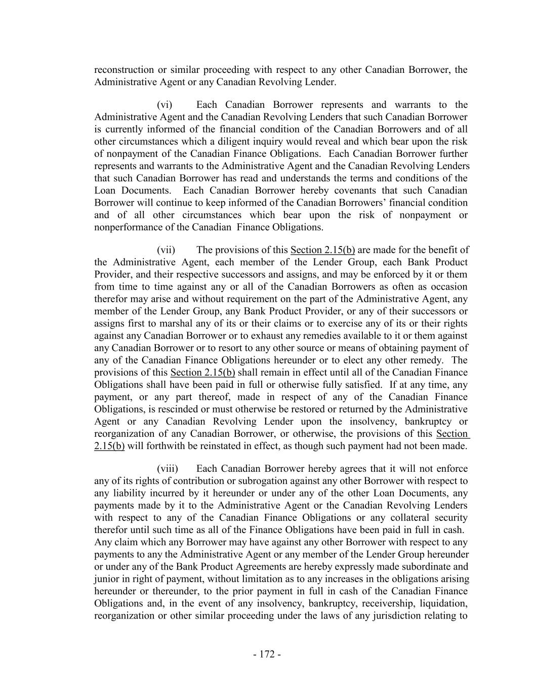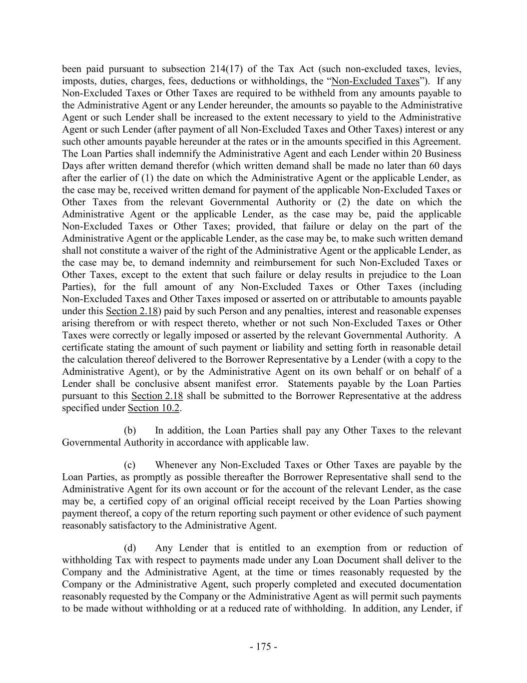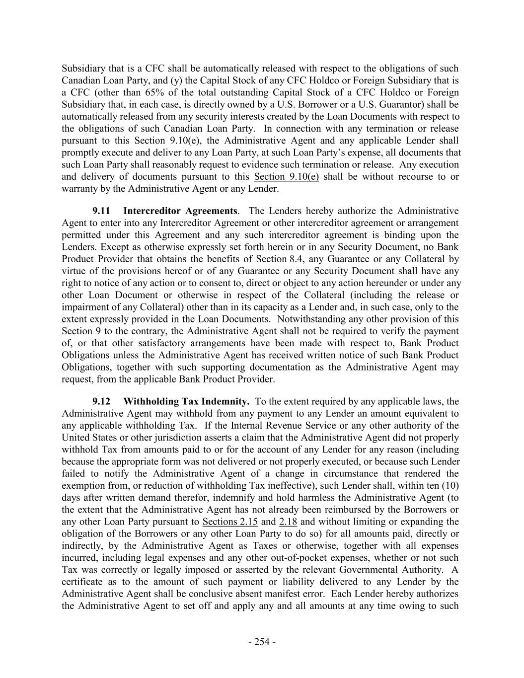 Subsidiary that is a CFC shall be automatically released with respect to the obligations of such Canadian Loan Party, and (y) the Capital Stock of any CFC Holdco or Foreign Subsidiary that is a CFC (other than 65% of the total outstanding Capital Stock of a CFC Holdco or Foreign Subsidiary that, in each case, is directly owned by a U.S. Borrower or a U.S. Guarantor) shall be automatically released from any security interests created by the Loan Documents with respect to the obligations of such Canadian Loan Party. In connection with any termination or release pursuant to this Section 9.10(e), the Administrative Agent and any applicable Lender shall promptly execute and deliver to any Loan Party, at such Loan Party’s expense, all documents that such Loan Party shall reasonably request to evidence such termination or release. Any execution and delivery of documents pursuant to this Section 9.10(e) shall be without recourse to or warranty by the Administrative Agent or any Lender. 9.11 Intercreditor Agreements. The Lenders hereby authorize the Administrative Agent to enter into any Intercreditor Agreement or other intercreditor agreement or arrangement permitted under this Agreement and any such intercreditor agreement is binding upon the Lenders. Except as otherwise expressly set forth herein or in any Security Document, no Bank Product Provider that obtains the benefits of Section 8.4, any Guarantee or any Collateral by virtue of the provisions hereof or of any Guarantee or any Security Document shall have any right to notice of any action or to consent to, direct or object to any action hereunder or under any other Loan Document or otherwise in respect of the Collateral (including the release or impairment of any Collateral) other than in its capacity as a Lender and, in such case, only to the extent expressly provided in the Loan Documents. Notwithstanding any other provision of this Section 9 to the contrary, the Administrative Agent shall not be required to verify the payment of, or that other satisfactory arrangements have been made with respect to, Bank Product Obligations unless the Administrative Agent has received written notice of such Bank Product Obligations, together with such supporting documentation as the Administrative Agent may request, from the applicable Bank Product Provider. 9.12 Withholding Tax Indemnity. To the extent required by any applicable laws, the Administrative Agent may withhold from any payment to any Lender an amount equivalent to any applicable withholding Tax. If the Internal Revenue Service or any other authority of the United States or other jurisdiction asserts a claim that the Administrative Agent did not properly withhold Tax from amounts paid to or for the account of any Lender for any reason (including because the appropriate form was not delivered or not properly executed, or because such Lender failed to notify the Administrative Agent of a change in circumstance that rendered the exemption from, or reduction of withholding Tax ineffective), such Lender shall, within ten (10) days after written demand therefor, indemnify and hold harmless the Administrative Agent (to the extent that the Administrative Agent has not already been reimbursed by the Borrowers or any other Loan Party pursuant to Sections 2.15 and 2.18 and without limiting or expanding the obligation of the Borrowers or any other Loan Party to do so) for all amounts paid, directly or indirectly, by the Administrative Agent as Taxes or otherwise, together with all expenses incurred, including legal expenses and any other out-of-pocket expenses, whether or not such Tax was correctly or legally imposed or asserted by the relevant Governmental Authority. A certificate as to the amount of such payment or liability delivered to any Lender by the Administrative Agent shall be conclusive absent manifest error. Each Lender hereby authorizes the Administrative Agent to set off and apply any and all amounts at any time owing to such - 254 -