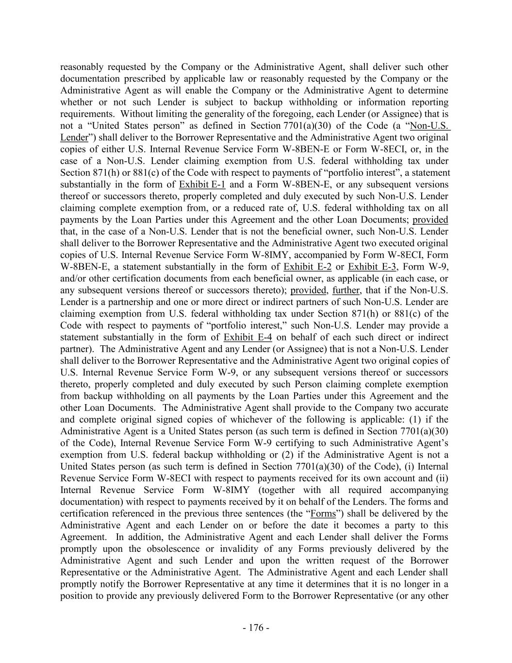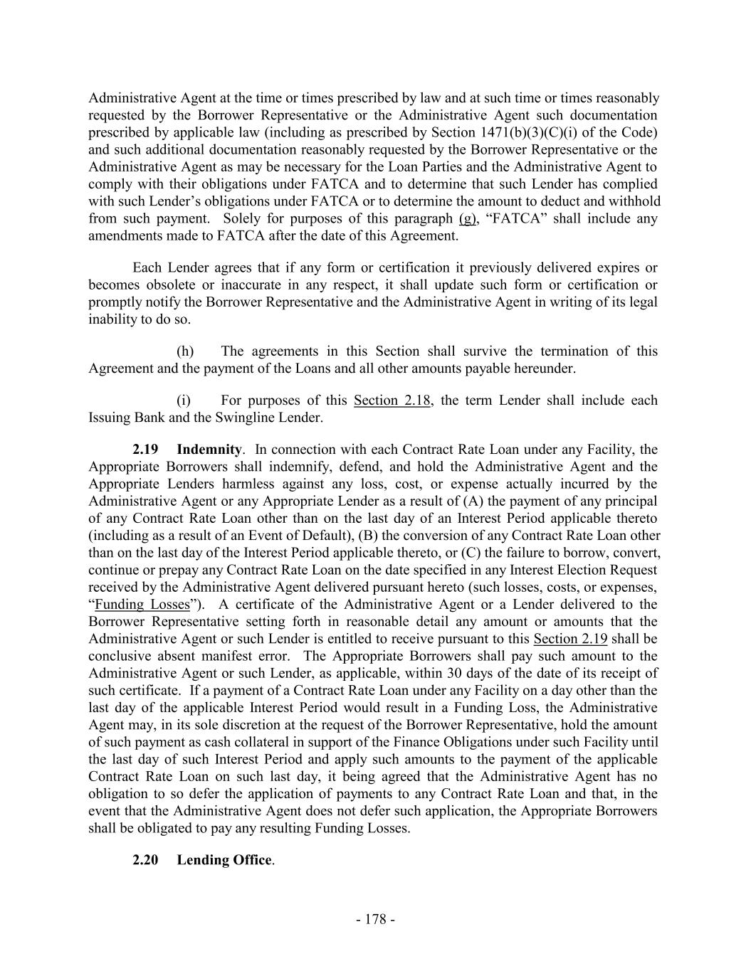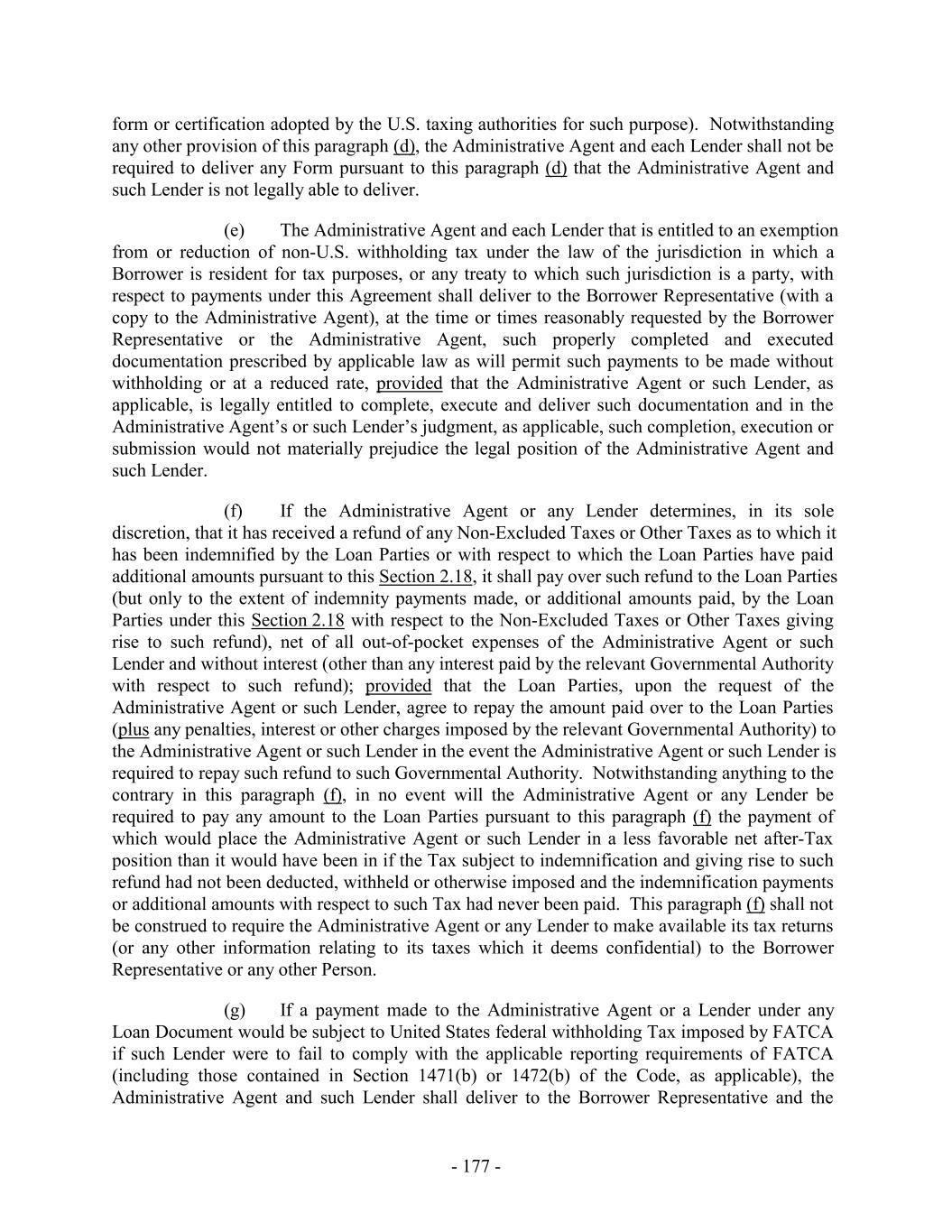 Subsidiary that is a CFC shall be automatically released with respect to the obligations of such Canadian Loan Party, and (y) the Capital Stock of any CFC Holdco or Foreign Subsidiary that is a CFC (other than 65% of the total outstanding Capital Stock of a CFC Holdco or Foreign Subsidiary that, in each case, is directly owned by a U.S. Borrower or a U.S. Guarantor) shall be automatically released from any security interests created by the Loan Documents with respect to the obligations of such Canadian Loan Party. In connection with any termination or release pursuant to this Section 9.10(e), the Administrative Agent and any applicable Lender shall promptly execute and deliver to any Loan Party, at such Loan Party’s expense, all documents that such Loan Party shall reasonably request to evidence such termination or release. Any execution and delivery of documents pursuant to this Section 9.10(e) shall be without recourse to or warranty by the Administrative Agent or any Lender. 9.11 Intercreditor Agreements. The Lenders hereby authorize the Administrative Agent to enter into any Intercreditor Agreement or other intercreditor agreement or arrangement permitted under this Agreement and any such intercreditor agreement is binding upon the Lenders. Except as otherwise expressly set forth herein or in any Security Document, no Bank Product Provider that obtains the benefits of Section 8.4, any Guarantee or any Collateral by virtue of the provisions hereof or of any Guarantee or any Security Document shall have any right to notice of any action or to consent to, direct or object to any action hereunder or under any other Loan Document or otherwise in respect of the Collateral (including the release or impairment of any Collateral) other than in its capacity as a Lender and, in such case, only to the extent expressly provided in the Loan Documents. Notwithstanding any other provision of this Section 9 to the contrary, the Administrative Agent shall not be required to verify the payment of, or that other satisfactory arrangements have been made with respect to, Bank Product Obligations unless the Administrative Agent has received written notice of such Bank Product Obligations, together with such supporting documentation as the Administrative Agent may request, from the applicable Bank Product Provider. 9.12 Withholding Tax Indemnity. To the extent required by any applicable laws, the Administrative Agent may withhold from any payment to any Lender an amount equivalent to any applicable withholding Tax. If the Internal Revenue Service or any other authority of the United States or other jurisdiction asserts a claim that the Administrative Agent did not properly withhold Tax from amounts paid to or for the account of any Lender for any reason (including because the appropriate form was not delivered or not properly executed, or because such Lender failed to notify the Administrative Agent of a change in circumstance that rendered the exemption from, or reduction of withholding Tax ineffective), such Lender shall, within ten (10) days after written demand therefor, indemnify and hold harmless the Administrative Agent (to the extent that the Administrative Agent has not already been reimbursed by the Borrowers or any other Loan Party pursuant to Sections 2.15 and 2.18 and without limiting or expanding the obligation of the Borrowers or any other Loan Party to do so) for all amounts paid, directly or indirectly, by the Administrative Agent as Taxes or otherwise, together with all expenses incurred, including legal expenses and any other out-of-pocket expenses, whether or not such Tax was correctly or legally imposed or asserted by the relevant Governmental Authority. A certificate as to the amount of such payment or liability delivered to any Lender by the Administrative Agent shall be conclusive absent manifest error. Each Lender hereby authorizes the Administrative Agent to set off and apply any and all amounts at any time owing to such - 254 -