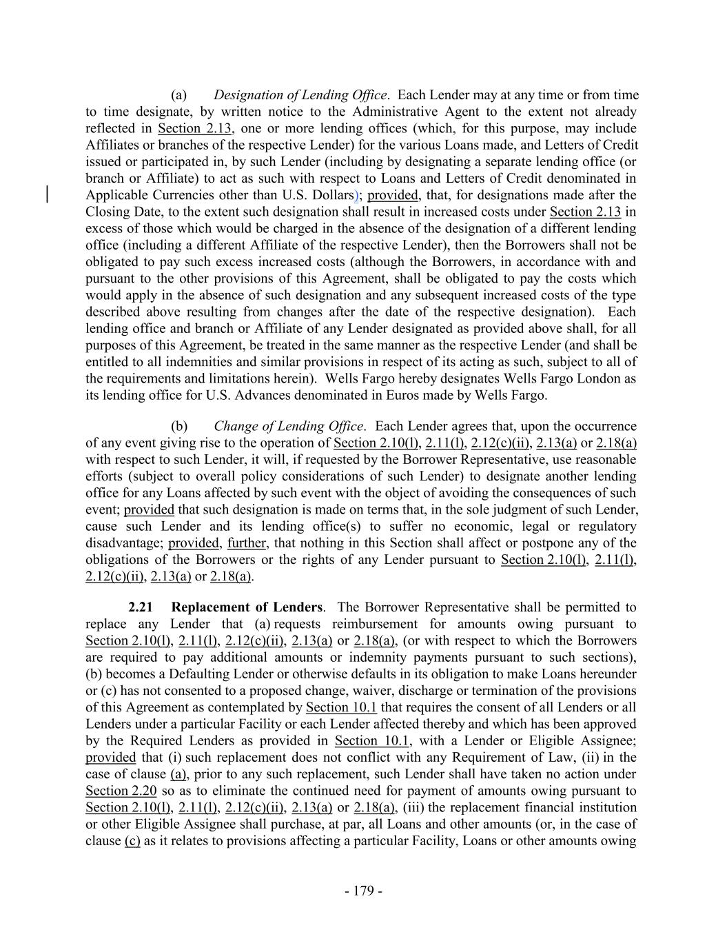 (a) Designation of Lending Office. Each Lender may at any time or from time to time designate, by written notice to the Administrative Agent to the extent not already reflected in Section 2.13, one or more lending offices (which, for this purpose, may include Affiliates or branches of the respective Lender) for the various Loans made, and Letters of Credit issued or participated in, by such Lender (including by designating a separate lending office (or branch or Affiliate) to act as such with respect to Loans and Letters of Credit denominated in Applicable Currencies other than U.S. Dollars); provided, that, for designations made after the Closing Date, to the extent such designation shall result in increased costs under Section 2.13 in excess of those which would be charged in the absence of the designation of a different lending office (including a different Affiliate of the respective Lender), then the Borrowers shall not be obligated to pay such excess increased costs (although the Borrowers, in accordance with and pursuant to the other provisions of this Agreement, shall be obligated to pay the costs which would apply in the absence of such designation and any subsequent increased costs of the type described above resulting from changes after the date of the respective designation). Each lending office and branch or Affiliate of any Lender designated as provided above shall, for all purposes of this Agreement, be treated in the same manner as the respective Lender (and shall be entitled to all indemnities and similar provisions in respect of its acting as such, subject to all of the requirements and limitations herein). Wells Fargo hereby designates Wells Fargo London as its lending office for U.S. Advances denominated in Euros made by Wells Fargo. (b) Change of Lending Office. Each Lender agrees that, upon the occurrence of any event giving rise to the operation of Section 2.10(l), 2.11(l), 2.12(c)(ii), 2.13(a) or 2.18(a) with respect to such Lender, it will, if requested by the Borrower Representative, use reasonable efforts (subject to overall policy considerations of such Lender) to designate another lending office for any Loans affected by such event with the object of avoiding the consequences of such event; provided that such designation is made on terms that, in the sole judgment of such Lender, cause such Lender and its lending office(s) to suffer no economic, legal or regulatory disadvantage; provided, further, that nothing in this Section shall affect or postpone any of the obligations of the Borrowers or the rights of any Lender pursuant to Section 2.10(l), 2.11(l), 2.12(c)(ii), 2.13(a) or 2.18(a). 2.21 Replacement of Lenders. The Borrower Representative shall be permitted to replace any Lender that (a) requests reimbursement for amounts owing pursuant to Section 2.10(l), 2.11(l), 2.12(c)(ii), 2.13(a) or 2.18(a), (or with respect to which the Borrowers are required to pay additional amounts or indemnity payments pursuant to such sections), (b) becomes a Defaulting Lender or otherwise defaults in its obligation to make Loans hereunder or (c) has not consented to a proposed change, waiver, discharge or termination of the provisions of this Agreement as contemplated by Section 10.1 that requires the consent of all Lenders or all Lenders under a particular Facility or each Lender affected thereby and which has been approved by the Required Lenders as provided in Section 10.1, with a Lender or Eligible Assignee; provided that (i) such replacement does not conflict with any Requirement of Law, (ii) in the case of clause (a), prior to any such replacement, such Lender shall have taken no action under Section 2.20 so as to eliminate the continued need for payment of amounts owing pursuant to Section 2.10(l), 2.11(l), 2.12(c)(ii), 2.13(a) or 2.18(a), (iii) the replacement financial institution or other Eligible Assignee shall purchase, at par, all Loans and other amounts (or, in the case of clause (c) as it relates to provisions affecting a particular Facility, Loans or other amounts owing - 179 -