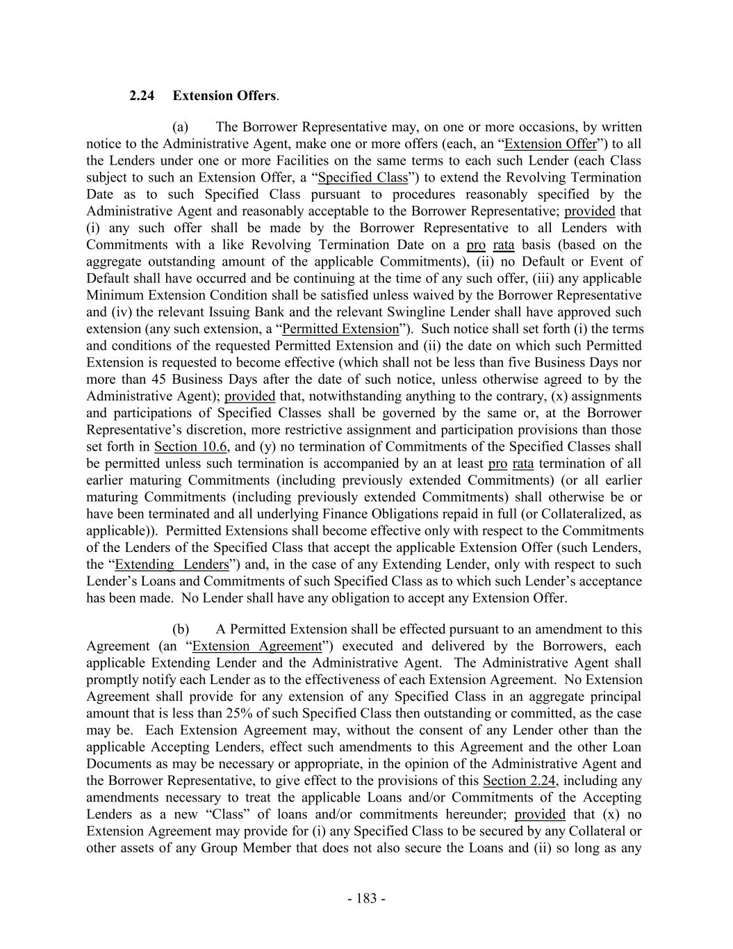 2.24 Extension Offers. (a) The Borrower Representative may, on one or more occasions, by written notice to the Administrative Agent, make one or more offers (each, an “Extension Offer”) to all the Lenders under one or more Facilities on the same terms to each such Lender (each Class subject to such an Extension Offer, a “Specified Class”) to extend the Revolving Termination Date as to such Specified Class pursuant to procedures reasonably specified by the Administrative Agent and reasonably acceptable to the Borrower Representative; provided that (i) any such offer shall be made by the Borrower Representative to all Lenders with Commitments with a like Revolving Termination Date on a pro rata basis (based on the aggregate outstanding amount of the applicable Commitments), (ii) no Default or Event of Default shall have occurred and be continuing at the time of any such offer, (iii) any applicable Minimum Extension Condition shall be satisfied unless waived by the Borrower Representative and (iv) the relevant Issuing Bank and the relevant Swingline Lender shall have approved such extension (any such extension, a “Permitted Extension”). Such notice shall set forth (i) the terms and conditions of the requested Permitted Extension and (ii) the date on which such Permitted Extension is requested to become effective (which shall not be less than five Business Days nor more than 45 Business Days after the date of such notice, unless otherwise agreed to by the Administrative Agent); provided that, notwithstanding anything to the contrary, (x) assignments and participations of Specified Classes shall be governed by the same or, at the Borrower Representative’s discretion, more restrictive assignment and participation provisions than those set forth in Section 10.6, and (y) no termination of Commitments of the Specified Classes shall be permitted unless such termination is accompanied by an at least pro rata termination of all earlier maturing Commitments (including previously extended Commitments) (or all earlier maturing Commitments (including previously extended Commitments) shall otherwise be or have been terminated and all underlying Finance Obligations repaid in full (or Collateralized, as applicable)). Permitted Extensions shall become effective only with respect to the Commitments of the Lenders of the Specified Class that accept the applicable Extension Offer (such Lenders, the “Extending Lenders”) and, in the case of any Extending Lender, only with respect to such Lender’s Loans and Commitments of such Specified Class as to which such Lender’s acceptance has been made. No Lender shall have any obligation to accept any Extension Offer. (b) A Permitted Extension shall be effected pursuant to an amendment to this Agreement (an “Extension Agreement”) executed and delivered by the Borrowers, each applicable Extending Lender and the Administrative Agent. The Administrative Agent shall promptly notify each Lender as to the effectiveness of each Extension Agreement. No Extension Agreement shall provide for any extension of any Specified Class in an aggregate principal amount that is less than 25% of such Specified Class then outstanding or committed, as the case may be. Each Extension Agreement may, without the consent of any Lender other than the applicable Accepting Lenders, effect such amendments to this Agreement and the other Loan Documents as may be necessary or appropriate, in the opinion of the Administrative Agent and the Borrower Representative, to give effect to the provisions of this Section 2.24, including any amendments necessary to treat the applicable Loans and/or Commitments of the Accepting Lenders as a new “Class” of loans and/or commitments hereunder; provided that (x) no Extension Agreement may provide for (i) any Specified Class to be secured by any Collateral or other assets of any Group Member that does not also secure the Loans and (ii) so long as any - 183 -