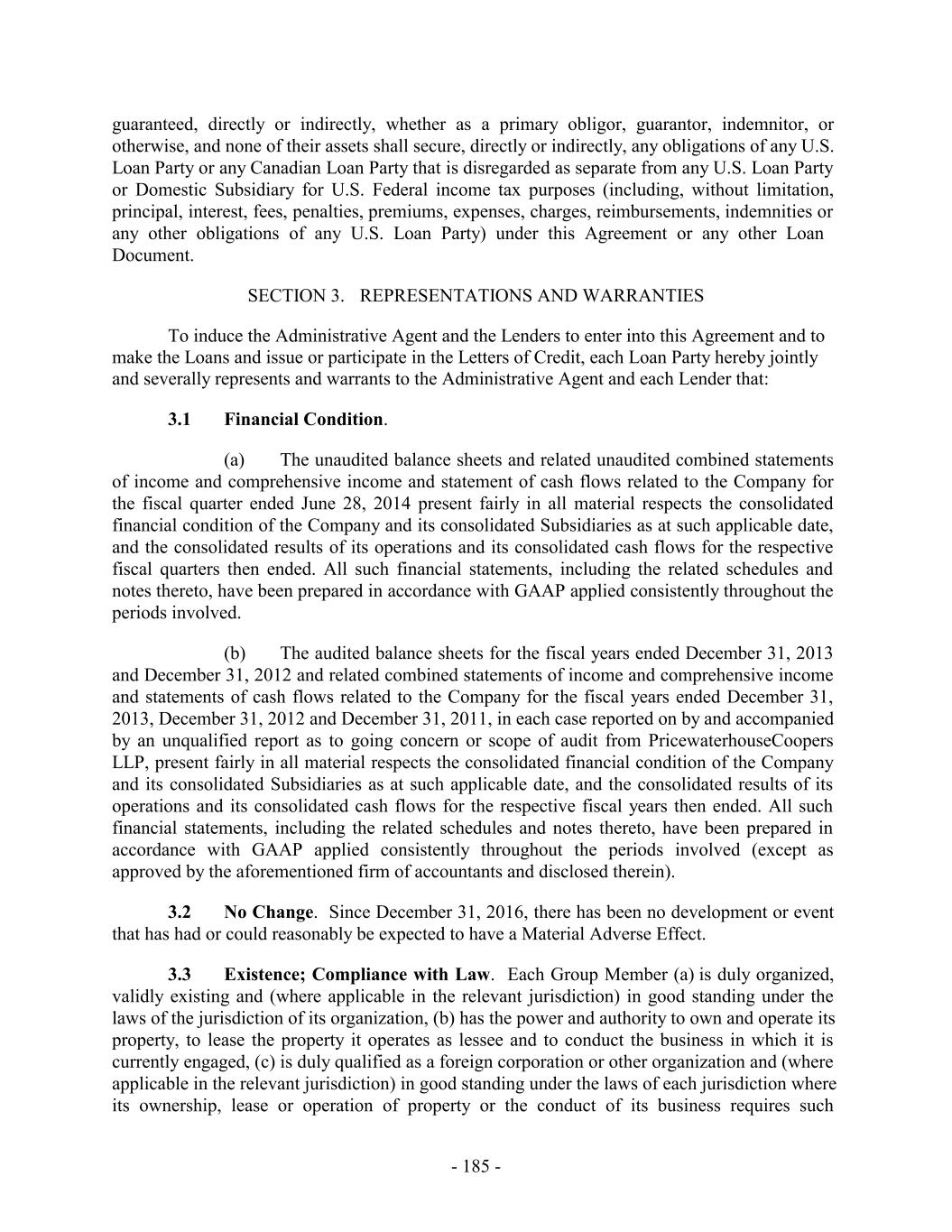 guaranteed, directly or indirectly, whether as a primary obligor, guarantor, indemnitor, or otherwise, and none of their assets shall secure, directly or indirectly, any obligations of any U.S. Loan Party or any Canadian Loan Party that is disregarded as separate from any U.S. Loan Party or Domestic Subsidiary for U.S. Federal income tax purposes (including, without limitation, principal, interest, fees, penalties, premiums, expenses, charges, reimbursements, indemnities or any other obligations of any U.S. Loan Party) under this Agreement or any other Loan Document. SECTION 3. REPRESENTATIONS AND WARRANTIES To induce the Administrative Agent and the Lenders to enter into this Agreement and to make the Loans and issue or participate in the Letters of Credit, each Loan Party hereby jointly and severally represents and warrants to the Administrative Agent and each Lender that: 3.1 Financial Condition. (a) The unaudited balance sheets and related unaudited combined statements of income and comprehensive income and statement of cash flows related to the Company for the fiscal quarter ended June 28, 2014 present fairly in all material respects the consolidated financial condition of the Company and its consolidated Subsidiaries as at such applicable date, and the consolidated results of its operations and its consolidated cash flows for the respective fiscal quarters then ended. All such financial statements, including the related schedules and notes thereto, have been prepared in accordance with GAAP applied consistently throughout the periods involved. (b) The audited balance sheets for the fiscal years ended December 31, 2013 and December 31, 2012 and related combined statements of income and comprehensive income and statements of cash flows related to the Company for the fiscal years ended December 31, 2013, December 31, 2012 and December 31, 2011, in each case reported on by and accompanied by an unqualified report as to going concern or scope of audit from PricewaterhouseCoopers LLP, present fairly in all material respects the consolidated financial condition of the Company and its consolidated Subsidiaries as at such applicable date, and the consolidated results of its operations and its consolidated cash flows for the respective fiscal years then ended. All such financial statements, including the related schedules and notes thereto, have been prepared in accordance with GAAP applied consistently throughout the periods involved (except as approved by the aforementioned firm of accountants and disclosed therein). 3.2 No Change. Since December 31, 2016, there has been no development or event that has had or could reasonably be expected to have a Material Adverse Effect. 3.3 Existence; Compliance with Law. Each Group Member (a) is duly organized, validly existing and (where applicable in the relevant jurisdiction) in good standing under the laws of the jurisdiction of its organization, (b) has the power and authority to own and operate its property, to lease the property it operates as lessee and to conduct the business in which it is currently engaged, (c) is duly qualified as a foreign corporation or other organization and (where applicable in the relevant jurisdiction) in good standing under the laws of each jurisdiction where its ownership, lease or operation of property or the conduct of its business requires such - 185 -