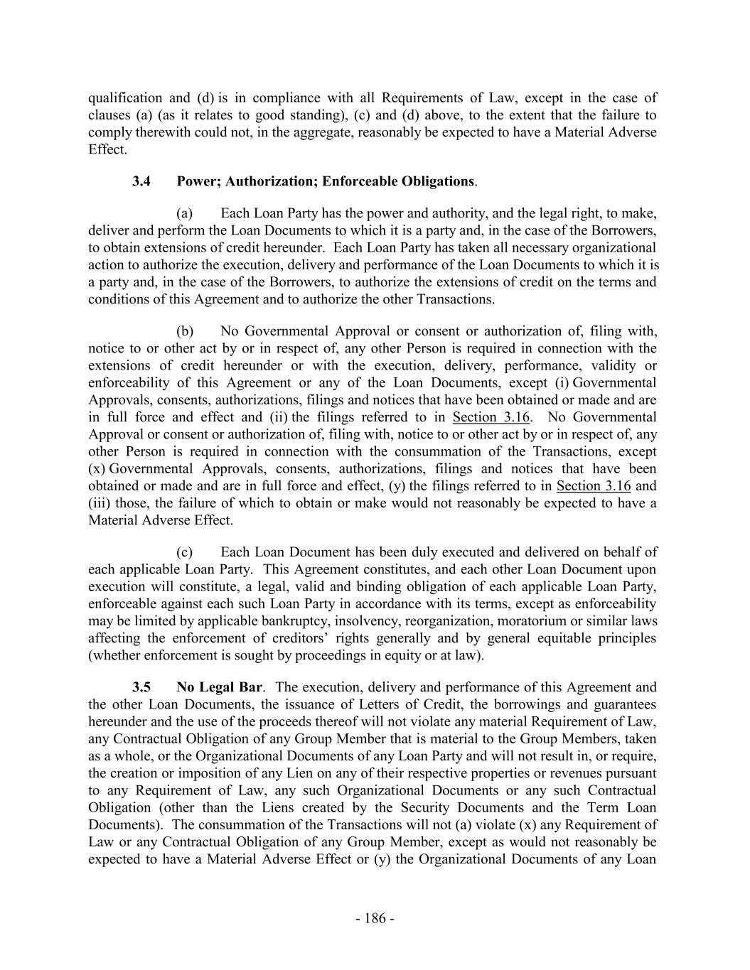 qualification and (d) is in compliance with all Requirements of Law, except in the case of clauses (a) (as it relates to good standing), (c) and (d) above, to the extent that the failure to comply therewith could not, in the aggregate, reasonably be expected to have a Material Adverse Effect. 3.4 Power; Authorization; Enforceable Obligations. (a) Each Loan Party has the power and authority, and the legal right, to make, deliver and perform the Loan Documents to which it is a party and, in the case of the Borrowers, to obtain extensions of credit hereunder. Each Loan Party has taken all necessary organizational action to authorize the execution, delivery and performance of the Loan Documents to which it is a party and, in the case of the Borrowers, to authorize the extensions of credit on the terms and conditions of this Agreement and to authorize the other Transactions. (b) No Governmental Approval or consent or authorization of, filing with, notice to or other act by or in respect of, any other Person is required in connection with the extensions of credit hereunder or with the execution, delivery, performance, validity or enforceability of this Agreement or any of the Loan Documents, except (i) Governmental Approvals, consents, authorizations, filings and notices that have been obtained or made and are in full force and effect and (ii) the filings referred to in Section 3.16. No Governmental Approval or consent or authorization of, filing with, notice to or other act by or in respect of, any other Person is required in connection with the consummation of the Transactions, except (x) Governmental Approvals, consents, authorizations, filings and notices that have been obtained or made and are in full force and effect, (y) the filings referred to in Section 3.16 and (iii) those, the failure of which to obtain or make would not reasonably be expected to have a Material Adverse Effect. (c) Each Loan Document has been duly executed and delivered on behalf of each applicable Loan Party. This Agreement constitutes, and each other Loan Document upon execution will constitute, a legal, valid and binding obligation of each applicable Loan Party, enforceable against each such Loan Party in accordance with its terms, except as enforceability may be limited by applicable bankruptcy, insolvency, reorganization, moratorium or similar laws affecting the enforcement of creditors’ rights generally and by general equitable principles (whether enforcement is sought by proceedings in equity or at law). 3.5 No Legal Bar. The execution, delivery and performance of this Agreement and the other Loan Documents, the issuance of Letters of Credit, the borrowings and guarantees hereunder and the use of the proceeds thereof will not violate any material Requirement of Law, any Contractual Obligation of any Group Member that is material to the Group Members, taken as a whole, or the Organizational Documents of any Loan Party and will not result in, or require, the creation or imposition of any Lien on any of their respective properties or revenues pursuant to any Requirement of Law, any such Organizational Documents or any such Contractual Obligation (other than the Liens created by the Security Documents and the Term Loan Documents). The consummation of the Transactions will not (a) violate (x) any Requirement of Law or any Contractual Obligation of any Group Member, except as would not reasonably be expected to have a Material Adverse Effect or (y) the Organizational Documents of any Loan - 186 -