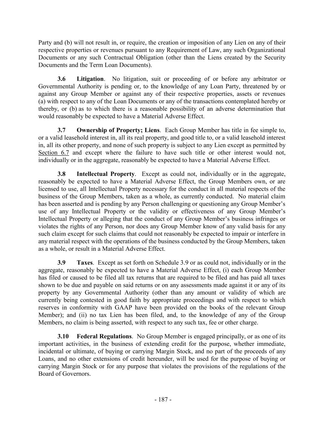 Party and (b) will not result in, or require, the creation or imposition of any Lien on any of their respective properties or revenues pursuant to any Requirement of Law, any such Organizational Documents or any such Contractual Obligation (other than the Liens created by the Security Documents and the Term Loan Documents). 3.6 Litigation. No litigation, suit or proceeding of or before any arbitrator or Governmental Authority is pending or, to the knowledge of any Loan Party, threatened by or against any Group Member or against any of their respective properties, assets or revenues (a) with respect to any of the Loan Documents or any of the transactions contemplated hereby or thereby, or (b) as to which there is a reasonable possibility of an adverse determination that would reasonably be expected to have a Material Adverse Effect. 3.7 Ownership of Property; Liens. Each Group Member has title in fee simple to, or a valid leasehold interest in, all its real property, and good title to, or a valid leasehold interest in, all its other property, and none of such property is subject to any Lien except as permitted by Section 6.7 and except where the failure to have such title or other interest would not, individually or in the aggregate, reasonably be expected to have a Material Adverse Effect. 3.8 Intellectual Property. Except as could not, individually or in the aggregate, reasonably be expected to have a Material Adverse Effect, the Group Members own, or are licensed to use, all Intellectual Property necessary for the conduct in all material respects of the business of the Group Members, taken as a whole, as currently conducted. No material claim has been asserted and is pending by any Person challenging or questioning any Group Member’s use of any Intellectual Property or the validity or effectiveness of any Group Member’s Intellectual Property or alleging that the conduct of any Group Member’s business infringes or violates the rights of any Person, nor does any Group Member know of any valid basis for any such claim except for such claims that could not reasonably be expected to impair or interfere in any material respect with the operations of the business conducted by the Group Members, taken as a whole, or result in a Material Adverse Effect. 3.9 Taxes. Except as set forth on Schedule 3.9 or as could not, individually or in the aggregate, reasonably be expected to have a Material Adverse Effect, (i) each Group Member has filed or caused to be filed all tax returns that are required to be filed and has paid all taxes shown to be due and payable on said returns or on any assessments made against it or any of its property by any Governmental Authority (other than any amount or validity of which are currently being contested in good faith by appropriate proceedings and with respect to which reserves in conformity with GAAP have been provided on the books of the relevant Group Member); and (ii) no tax Lien has been filed, and, to the knowledge of any of the Group Members, no claim is being asserted, with respect to any such tax, fee or other charge. 3.10 Federal Regulations. No Group Member is engaged principally, or as one of its important activities, in the business of extending credit for the purpose, whether immediate, incidental or ultimate, of buying or carrying Margin Stock, and no part of the proceeds of any Loans, and no other extensions of credit hereunder, will be used for the purpose of buying or carrying Margin Stock or for any purpose that violates the provisions of the regulations of the Board of Governors. - 187 -