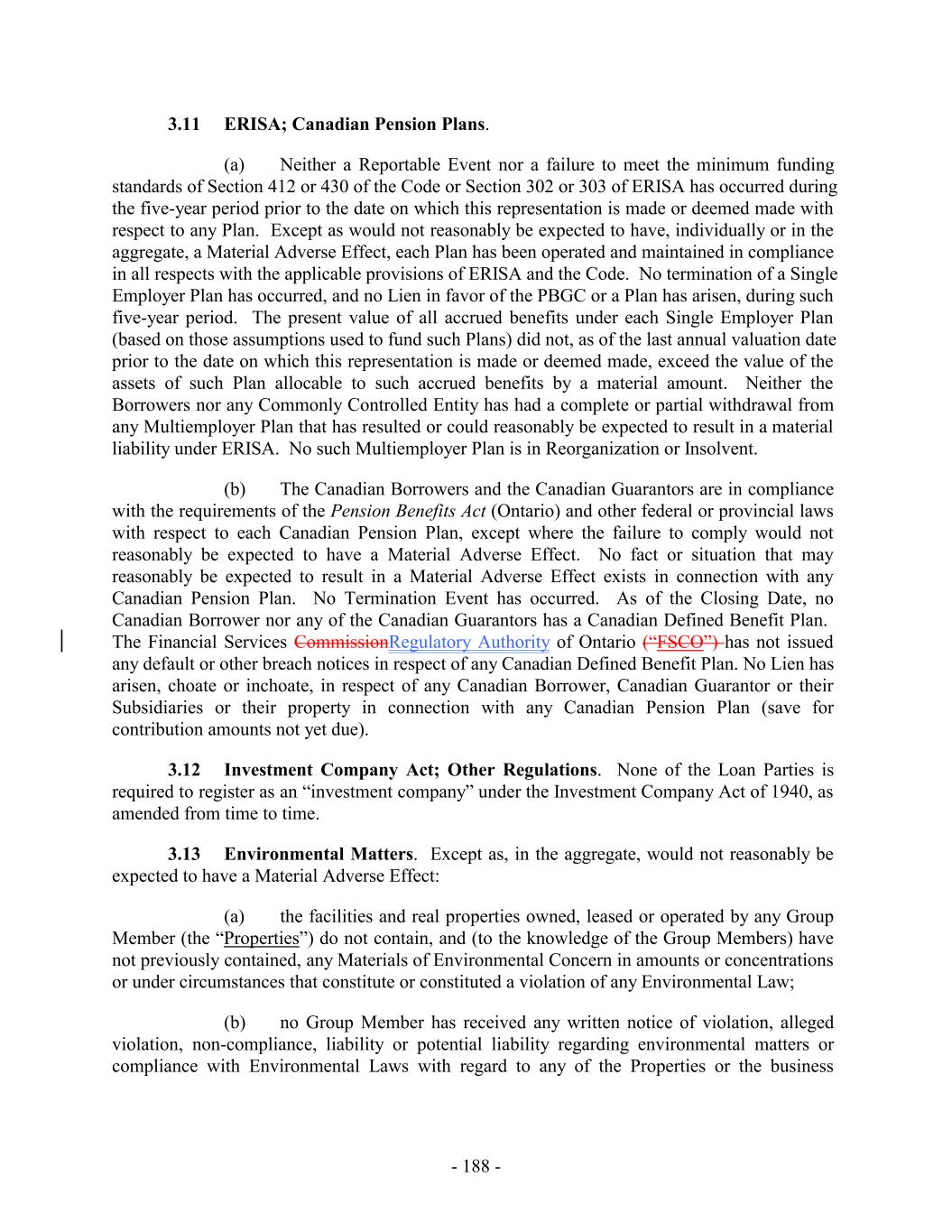 3.11 ERISA; Canadian Pension Plans. (a) Neither a Reportable Event nor a failure to meet the minimum funding standards of Section 412 or 430 of the Code or Section 302 or 303 of ERISA has occurred during the five-year period prior to the date on which this representation is made or deemed made with respect to any Plan. Except as would not reasonably be expected to have, individually or in the aggregate, a Material Adverse Effect, each Plan has been operated and maintained in compliance in all respects with the applicable provisions of ERISA and the Code. No termination of a Single Employer Plan has occurred, and no Lien in favor of the PBGC or a Plan has arisen, during such five-year period. The present value of all accrued benefits under each Single Employer Plan (based on those assumptions used to fund such Plans) did not, as of the last annual valuation date prior to the date on which this representation is made or deemed made, exceed the value of the assets of such Plan allocable to such accrued benefits by a material amount. Neither the Borrowers nor any Commonly Controlled Entity has had a complete or partial withdrawal from any Multiemployer Plan that has resulted or could reasonably be expected to result in a material liability under ERISA. No such Multiemployer Plan is in Reorganization or Insolvent. (b) The Canadian Borrowers and the Canadian Guarantors are in compliance with the requirements of the Pension Benefits Act (Ontario) and other federal or provincial laws with respect to each Canadian Pension Plan, except where the failure to comply would not reasonably be expected to have a Material Adverse Effect. No fact or situation that may reasonably be expected to result in a Material Adverse Effect exists in connection with any Canadian Pension Plan. No Termination Event has occurred. As of the Closing Date, no Canadian Borrower nor any of the Canadian Guarantors has a Canadian Defined Benefit Plan. The Financial Services CommissionRegulatory Authority of Ontario (“FSCO”) has not issued any default or other breach notices in respect of any Canadian Defined Benefit Plan. No Lien has arisen, choate or inchoate, in respect of any Canadian Borrower, Canadian Guarantor or their Subsidiaries or their property in connection with any Canadian Pension Plan (save for contribution amounts not yet due). 3.12 Investment Company Act; Other Regulations. None of the Loan Parties is required to register as an “investment company” under the Investment Company Act of 1940, as amended from time to time. 3.13 Environmental Matters. Except as, in the aggregate, would not reasonably be expected to have a Material Adverse Effect: (a) the facilities and real properties owned, leased or operated by any Group Member (the “Properties”) do not contain, and (to the knowledge of the Group Members) have not previously contained, any Materials of Environmental Concern in amounts or concentrations or under circumstances that constitute or constituted a violation of any Environmental Law; (b) no Group Member has received any written notice of violation, alleged violation, non-compliance, liability or potential liability regarding environmental matters or compliance with Environmental Laws with regard to any of the Properties or the business - 188 -