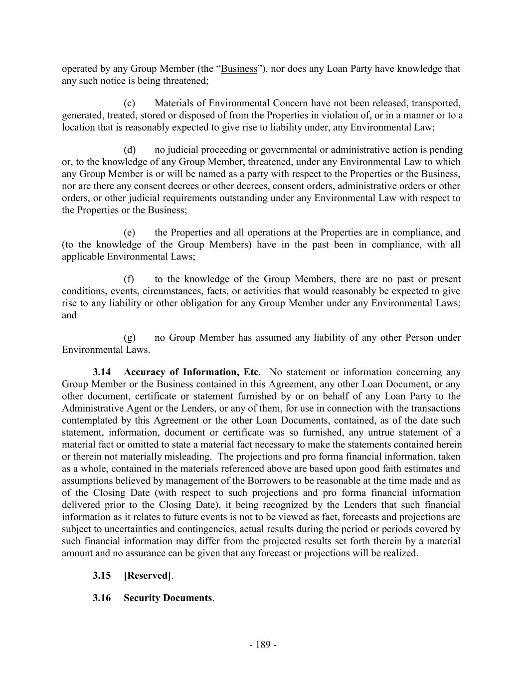 operated by any Group Member (the “Business”), nor does any Loan Party have knowledge that any such notice is being threatened; (c) Materials of Environmental Concern have not been released, transported, generated, treated, stored or disposed of from the Properties in violation of, or in a manner or to a location that is reasonably expected to give rise to liability under, any Environmental Law; (d) no judicial proceeding or governmental or administrative action is pending or, to the knowledge of any Group Member, threatened, under any Environmental Law to which any Group Member is or will be named as a party with respect to the Properties or the Business, nor are there any consent decrees or other decrees, consent orders, administrative orders or other orders, or other judicial requirements outstanding under any Environmental Law with respect to the Properties or the Business; (e) the Properties and all operations at the Properties are in compliance, and (to the knowledge of the Group Members) have in the past been in compliance, with all applicable Environmental Laws; (f) to the knowledge of the Group Members, there are no past or present conditions, events, circumstances, facts, or activities that would reasonably be expected to give rise to any liability or other obligation for any Group Member under any Environmental Laws; and (g) no Group Member has assumed any liability of any other Person under Environmental Laws. 3.14 Accuracy of Information, Etc. No statement or information concerning any Group Member or the Business contained in this Agreement, any other Loan Document, or any other document, certificate or statement furnished by or on behalf of any Loan Party to the Administrative Agent or the Lenders, or any of them, for use in connection with the transactions contemplated by this Agreement or the other Loan Documents, contained, as of the date such statement, information, document or certificate was so furnished, any untrue statement of a material fact or omitted to state a material fact necessary to make the statements contained herein or therein not materially misleading. The projections and pro forma financial information, taken as a whole, contained in the materials referenced above are based upon good faith estimates and assumptions believed by management of the Borrowers to be reasonable at the time made and as of the Closing Date (with respect to such projections and pro forma financial information delivered prior to the Closing Date), it being recognized by the Lenders that such financial information as it relates to future events is not to be viewed as fact, forecasts and projections are subject to uncertainties and contingencies, actual results during the period or periods covered by such financial information may differ from the projected results set forth therein by a material amount and no assurance can be given that any forecast or projections will be realized. 3.15 [Reserved]. 3.16 Security Documents. - 189 -