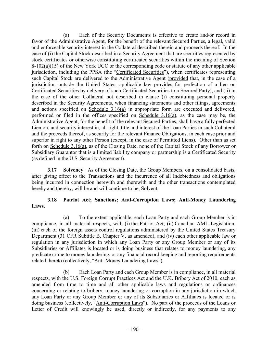 (a) Each of the Security Documents is effective to create and/or record in favor of the Administrative Agent, for the benefit of the relevant Secured Parties, a legal, valid and enforceable security interest in the Collateral described therein and proceeds thereof. In the case of (i) the Capital Stock described in a Security Agreement that are securities represented by stock certificates or otherwise constituting certificated securities within the meaning of Section 8-102(a)(15) of the New York UCC or the corresponding code or statute of any other applicable jurisdiction, including the PPSA (the “Certificated Securities”), when certificates representing such Capital Stock are delivered to the Administrative Agent (provided that, in the case of a jurisdiction outside the United States, applicable law provides for perfection of a lien on Certificated Securities by delivery of such Certificated Securities to a Secured Party), and (ii) in the case of the other Collateral not described in clause (i) constituting personal property described in the Security Agreements, when financing statements and other filings, agreements and actions specified on Schedule 3.16(a) in appropriate form are executed and delivered, performed or filed in the offices specified on Schedule 3.16(a), as the case may be, the Administrative Agent, for the benefit of the relevant Secured Parties, shall have a fully perfected Lien on, and security interest in, all right, title and interest of the Loan Parties in such Collateral and the proceeds thereof, as security for the relevant Finance Obligations, in each case prior and superior in right to any other Person (except, in the case of Permitted Liens). Other than as set forth on Schedule 3.16(a), as of the Closing Date, none of the Capital Stock of any Borrower or Subsidiary Guarantor that is a limited liability company or partnership is a Certificated Security (as defined in the U.S. Security Agreement). 3.17 Solvency. As of the Closing Date, the Group Members, on a consolidated basis, after giving effect to the Transactions and the incurrence of all Indebtedness and obligations being incurred in connection herewith and therewith and the other transactions contemplated hereby and thereby, will be and will continue to be, Solvent. 3.18 Patriot Act; Sanctions; Anti-Corruption Laws; Anti-Money Laundering Laws. (a) To the extent applicable, each Loan Party and each Group Member is in compliance, in all material respects, with (i) the Patriot Act, (ii) Canadian AML Legislation, (iii) each of the foreign assets control regulations administered by the United States Treasury Department (31 CFR Subtitle B, Chapter V, as amended), and (iv) each other applicable law or regulation in any jurisdiction in which any Loan Party or any Group Member or any of its Subsidiaries or Affiliates is located or is doing business that relates to money laundering, any predicate crime to money laundering, or any financial record keeping and reporting requirements related thereto (collectively, “Anti-Money Laundering Laws”). (b) Each Loan Party and each Group Member is in compliance, in all material respects, with the U.S. Foreign Corrupt Practices Act and the U.K. Bribery Act of 2010, each as amended from time to time and all other applicable laws and regulations or ordinances concerning or relating to bribery, money laundering or corruption in any jurisdiction in which any Loan Party or any Group Member or any of its Subsidiaries or Affiliates is located or is doing business (collectively, “Anti-Corruption Laws”). No part of the proceeds of the Loans or Letter of Credit will knowingly be used, directly or indirectly, for any payments to any - 190 -