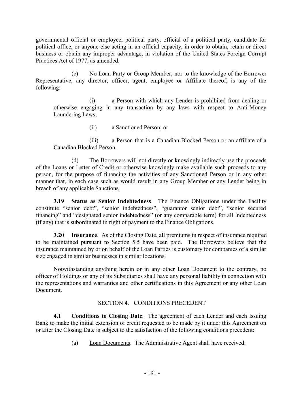 governmental official or employee, political party, official of a political party, candidate for political office, or anyone else acting in an official capacity, in order to obtain, retain or direct business or obtain any improper advantage, in violation of the United States Foreign Corrupt Practices Act of 1977, as amended. (c) No Loan Party or Group Member, nor to the knowledge of the Borrower Representative, any director, officer, agent, employee or Affiliate thereof, is any of the following: (i) a Person with which any Lender is prohibited from dealing or otherwise engaging in any transaction by any laws with respect to Anti-Money Laundering Laws; (ii) a Sanctioned Person; or (iii) a Person that is a Canadian Blocked Person or an affiliate of a Canadian Blocked Person. (d) The Borrowers will not directly or knowingly indirectly use the proceeds of the Loans or Letter of Credit or otherwise knowingly make available such proceeds to any person, for the purpose of financing the activities of any Sanctioned Person or in any other manner that, in each case such as would result in any Group Member or any Lender being in breach of any applicable Sanctions. 3.19 Status as Senior Indebtedness. The Finance Obligations under the Facility constitute “senior debt”, “senior indebtedness”, “guarantor senior debt”, “senior secured financing” and “designated senior indebtedness” (or any comparable term) for all Indebtedness (if any) that is subordinated in right of payment to the Finance Obligations. 3.20 Insurance. As of the Closing Date, all premiums in respect of insurance required to be maintained pursuant to Section 5.5 have been paid. The Borrowers believe that the insurance maintained by or on behalf of the Loan Parties is customary for companies of a similar size engaged in similar businesses in similar locations. Notwithstanding anything herein or in any other Loan Document to the contrary, no officer of Holdings or any of its Subsidiaries shall have any personal liability in connection with the representations and warranties and other certifications in this Agreement or any other Loan Document. SECTION 4. CONDITIONS PRECEDENT 4.1 Conditions to Closing Date. The agreement of each Lender and each Issuing Bank to make the initial extension of credit requested to be made by it under this Agreement on or after the Closing Date is subject to the satisfaction of the following conditions precedent: (a) Loan Documents. The Administrative Agent shall have received: - 191 -