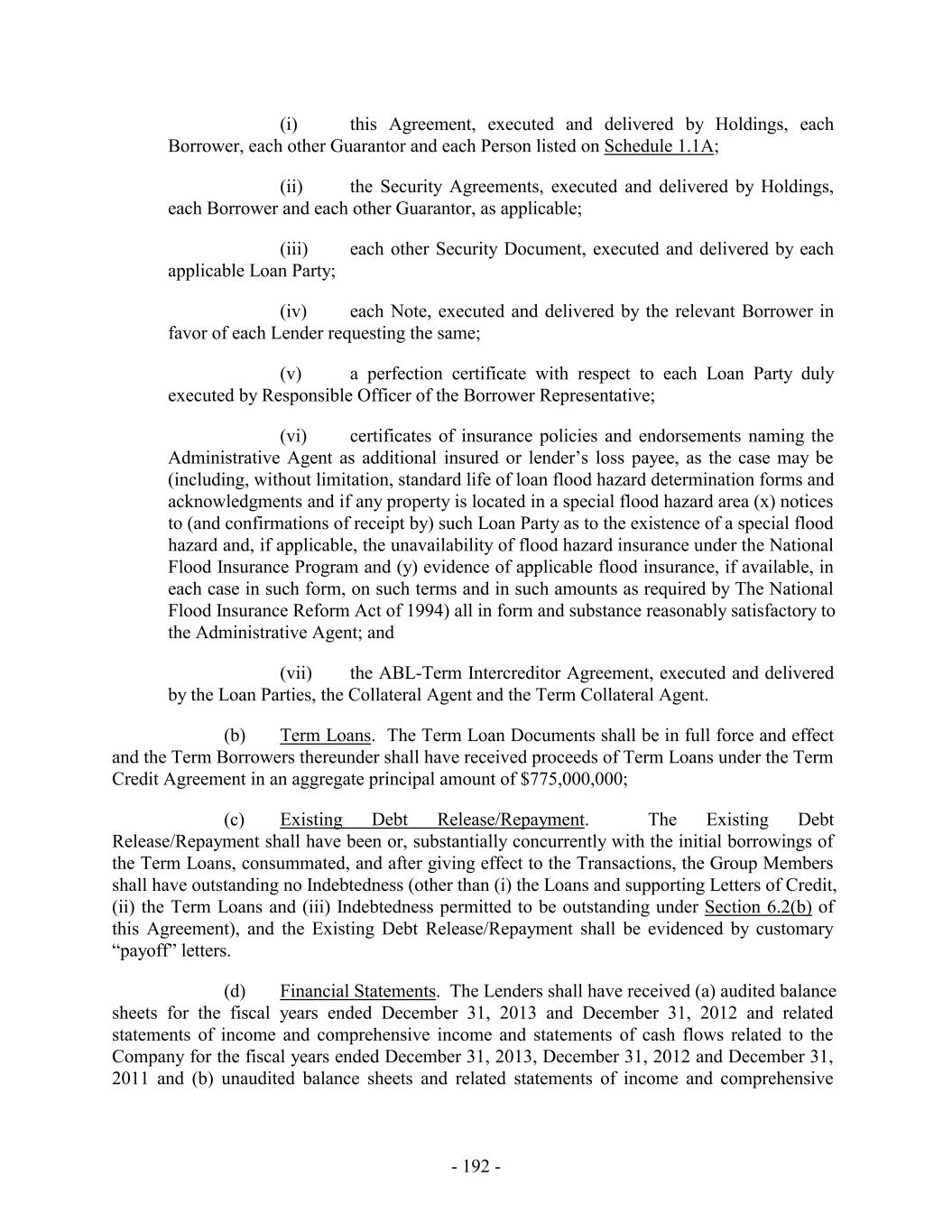 (i) this Agreement, executed and delivered by Holdings, each Borrower, each other Guarantor and each Person listed on Schedule 1.1A; (ii) the Security Agreements, executed and delivered by Holdings, each Borrower and each other Guarantor, as applicable; (iii) each other Security Document, executed and delivered by each applicable Loan Party; (iv) each Note, executed and delivered by the relevant Borrower in favor of each Lender requesting the same; (v) a perfection certificate with respect to each Loan Party duly executed by Responsible Officer of the Borrower Representative; (vi) certificates of insurance policies and endorsements naming the Administrative Agent as additional insured or lender’s loss payee, as the case may be (including, without limitation, standard life of loan flood hazard determination forms and acknowledgments and if any property is located in a special flood hazard area (x) notices to (and confirmations of receipt by) such Loan Party as to the existence of a special flood hazard and, if applicable, the unavailability of flood hazard insurance under the National Flood Insurance Program and (y) evidence of applicable flood insurance, if available, in each case in such form, on such terms and in such amounts as required by The National Flood Insurance Reform Act of 1994) all in form and substance reasonably satisfactory to the Administrative Agent; and (vii) the ABL-Term Intercreditor Agreement, executed and delivered by the Loan Parties, the Collateral Agent and the Term Collateral Agent. (b) Term Loans. The Term Loan Documents shall be in full force and effect and the Term Borrowers thereunder shall have received proceeds of Term Loans under the Term Credit Agreement in an aggregate principal amount of $775,000,000; (c) Existing Debt Release/Repayment. The Existing Debt Release/Repayment shall have been or, substantially concurrently with the initial borrowings of the Term Loans, consummated, and after giving effect to the Transactions, the Group Members shall have outstanding no Indebtedness (other than (i) the Loans and supporting Letters of Credit, (ii) the Term Loans and (iii) Indebtedness permitted to be outstanding under Section 6.2(b) of this Agreement), and the Existing Debt Release/Repayment shall be evidenced by customary “payoff” letters. (d) Financial Statements. The Lenders shall have received (a) audited balance sheets for the fiscal years ended December 31, 2013 and December 31, 2012 and related statements of income and comprehensive income and statements of cash flows related to the Company for the fiscal years ended December 31, 2013, December 31, 2012 and December 31, 2011 and (b) unaudited balance sheets and related statements of income and comprehensive - 192 -