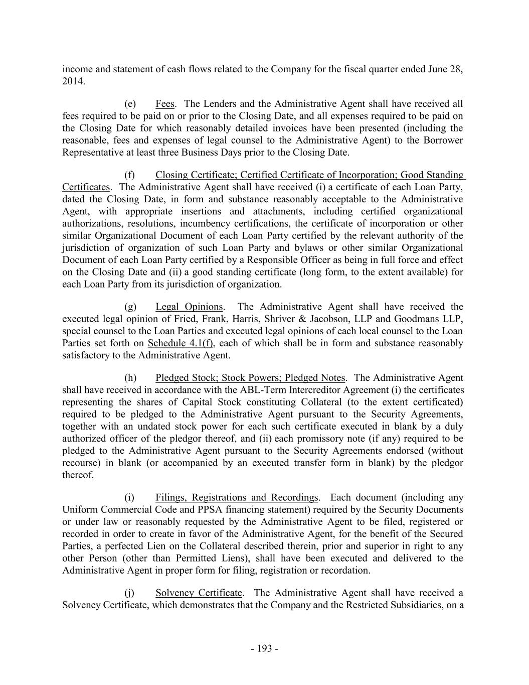 income and statement of cash flows related to the Company for the fiscal quarter ended June 28, 2014. (e) Fees. The Lenders and the Administrative Agent shall have received all fees required to be paid on or prior to the Closing Date, and all expenses required to be paid on the Closing Date for which reasonably detailed invoices have been presented (including the reasonable, fees and expenses of legal counsel to the Administrative Agent) to the Borrower Representative at least three Business Days prior to the Closing Date. (f) Closing Certificate; Certified Certificate of Incorporation; Good Standing Certificates. The Administrative Agent shall have received (i) a certificate of each Loan Party, dated the Closing Date, in form and substance reasonably acceptable to the Administrative Agent, with appropriate insertions and attachments, including certified organizational authorizations, resolutions, incumbency certifications, the certificate of incorporation or other similar Organizational Document of each Loan Party certified by the relevant authority of the jurisdiction of organization of such Loan Party and bylaws or other similar Organizational Document of each Loan Party certified by a Responsible Officer as being in full force and effect on the Closing Date and (ii) a good standing certificate (long form, to the extent available) for each Loan Party from its jurisdiction of organization. (g) Legal Opinions. The Administrative Agent shall have received the executed legal opinion of Fried, Frank, Harris, Shriver & Jacobson, LLP and Goodmans LLP, special counsel to the Loan Parties and executed legal opinions of each local counsel to the Loan Parties set forth on Schedule 4.1(f), each of which shall be in form and substance reasonably satisfactory to the Administrative Agent. (h) Pledged Stock; Stock Powers; Pledged Notes. The Administrative Agent shall have received in accordance with the ABL-Term Intercreditor Agreement (i) the certificates representing the shares of Capital Stock constituting Collateral (to the extent certificated) required to be pledged to the Administrative Agent pursuant to the Security Agreements, together with an undated stock power for each such certificate executed in blank by a duly authorized officer of the pledgor thereof, and (ii) each promissory note (if any) required to be pledged to the Administrative Agent pursuant to the Security Agreements endorsed (without recourse) in blank (or accompanied by an executed transfer form in blank) by the pledgor thereof. (i) Filings, Registrations and Recordings. Each document (including any Uniform Commercial Code and PPSA financing statement) required by the Security Documents or under law or reasonably requested by the Administrative Agent to be filed, registered or recorded in order to create in favor of the Administrative Agent, for the benefit of the Secured Parties, a perfected Lien on the Collateral described therein, prior and superior in right to any other Person (other than Permitted Liens), shall have been executed and delivered to the Administrative Agent in proper form for filing, registration or recordation. (j) Solvency Certificate. The Administrative Agent shall have received a Solvency Certificate, which demonstrates that the Company and the Restricted Subsidiaries, on a - 193 -