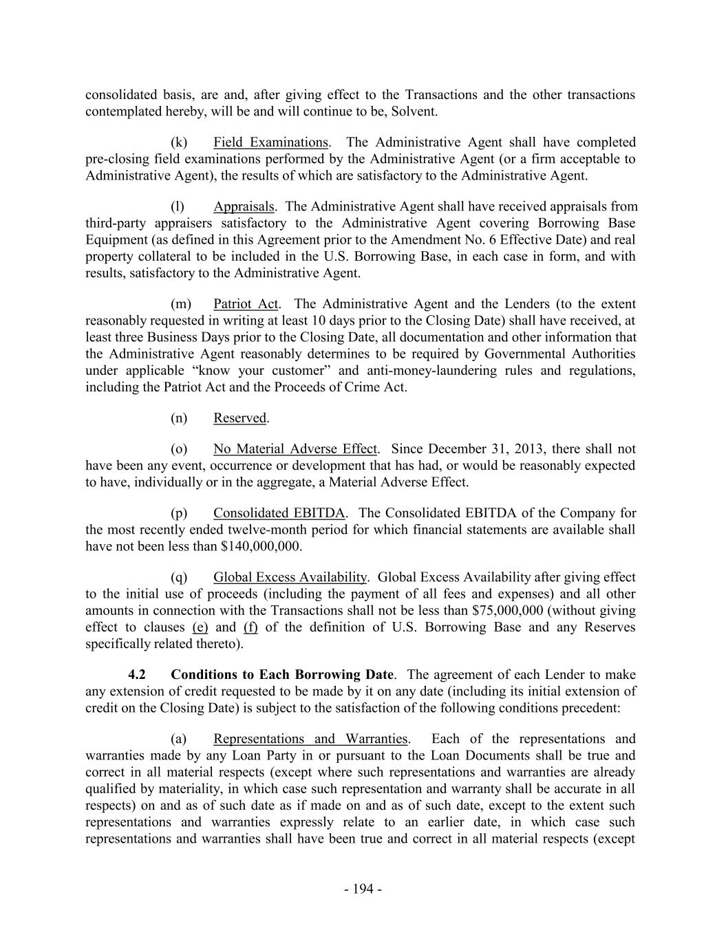 consolidated basis, are and, after giving effect to the Transactions and the other transactions contemplated hereby, will be and will continue to be, Solvent. (k) Field Examinations. The Administrative Agent shall have completed pre-closing field examinations performed by the Administrative Agent (or a firm acceptable to Administrative Agent), the results of which are satisfactory to the Administrative Agent. (l) Appraisals. The Administrative Agent shall have received appraisals from third-party appraisers satisfactory to the Administrative Agent covering Borrowing Base Equipment (as defined in this Agreement prior to the Amendment No. 6 Effective Date) and real property collateral to be included in the U.S. Borrowing Base, in each case in form, and with results, satisfactory to the Administrative Agent. (m) Patriot Act. The Administrative Agent and the Lenders (to the extent reasonably requested in writing at least 10 days prior to the Closing Date) shall have received, at least three Business Days prior to the Closing Date, all documentation and other information that the Administrative Agent reasonably determines to be required by Governmental Authorities under applicable “know your customer” and anti-money-laundering rules and regulations, including the Patriot Act and the Proceeds of Crime Act. (n) Reserved. (o) No Material Adverse Effect. Since December 31, 2013, there shall not have been any event, occurrence or development that has had, or would be reasonably expected to have, individually or in the aggregate, a Material Adverse Effect. (p) Consolidated EBITDA. The Consolidated EBITDA of the Company for the most recently ended twelve-month period for which financial statements are available shall have not been less than $140,000,000. (q) Global Excess Availability. Global Excess Availability after giving effect to the initial use of proceeds (including the payment of all fees and expenses) and all other amounts in connection with the Transactions shall not be less than $75,000,000 (without giving effect to clauses (e) and (f) of the definition of U.S. Borrowing Base and any Reserves specifically related thereto). 4.2 Conditions to Each Borrowing Date. The agreement of each Lender to make any extension of credit requested to be made by it on any date (including its initial extension of credit on the Closing Date) is subject to the satisfaction of the following conditions precedent: (a) Representations and Warranties. Each of the representations and warranties made by any Loan Party in or pursuant to the Loan Documents shall be true and correct in all material respects (except where such representations and warranties are already qualified by materiality, in which case such representation and warranty shall be accurate in all respects) on and as of such date as if made on and as of such date, except to the extent such representations and warranties expressly relate to an earlier date, in which case such representations and warranties shall have been true and correct in all material respects (except - 194 -