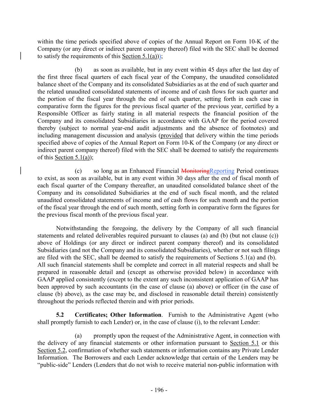 within the time periods specified above of copies of the Annual Report on Form 10-K of the Company (or any direct or indirect parent company thereof) filed with the SEC shall be deemed to satisfy the requirements of this Section 5.1(a))); (b) as soon as available, but in any event within 45 days after the last day of the first three fiscal quarters of each fiscal year of the Company, the unaudited consolidated balance sheet of the Company and its consolidated Subsidiaries as at the end of such quarter and the related unaudited consolidated statements of income and of cash flows for such quarter and the portion of the fiscal year through the end of such quarter, setting forth in each case in comparative form the figures for the previous fiscal quarter of the previous year, certified by a Responsible Officer as fairly stating in all material respects the financial position of the Company and its consolidated Subsidiaries in accordance with GAAP for the period covered thereby (subject to normal year-end audit adjustments and the absence of footnotes) and including management discussion and analysis (provided that delivery within the time periods specified above of copies of the Annual Report on Form 10-K of the Company (or any direct or indirect parent company thereof) filed with the SEC shall be deemed to satisfy the requirements of this Section 5.1(a)); (c) so long as an Enhanced Financial MonitoringReporting Period continues to exist, as soon as available, but in any event within 30 days after the end of fiscal month of each fiscal quarter of the Company thereafter, an unaudited consolidated balance sheet of the Company and its consolidated Subsidiaries at the end of such fiscal month, and the related unaudited consolidated statements of income and of cash flows for such month and the portion of the fiscal year through the end of such month, setting forth in comparative form the figures for the previous fiscal month of the previous fiscal year. Notwithstanding the foregoing, the delivery by the Company of all such financial statements and related deliverables required pursuant to clauses (a) and (b) (but not clause (c)) above of Holdings (or any direct or indirect parent company thereof) and its consolidated Subsidiaries (and not the Company and its consolidated Subsidiaries), whether or not such filings are filed with the SEC, shall be deemed to satisfy the requirements of Sections 5.1(a) and (b). All such financial statements shall be complete and correct in all material respects and shall be prepared in reasonable detail and (except as otherwise provided below) in accordance with GAAP applied consistently (except to the extent any such inconsistent application of GAAP has been approved by such accountants (in the case of clause (a) above) or officer (in the case of clause (b) above), as the case may be, and disclosed in reasonable detail therein) consistently throughout the periods reflected therein and with prior periods. 5.2 Certificates; Other Information. Furnish to the Administrative Agent (who shall promptly furnish to each Lender) or, in the case of clause (i), to the relevant Lender: (a) promptly upon the request of the Administrative Agent, in connection with the delivery of any financial statements or other information pursuant to Section 5.1 or this Section 5.2, confirmation of whether such statements or information contains any Private Lender Information. The Borrowers and each Lender acknowledge that certain of the Lenders may be “public-side” Lenders (Lenders that do not wish to receive material non-public information with - 196 -