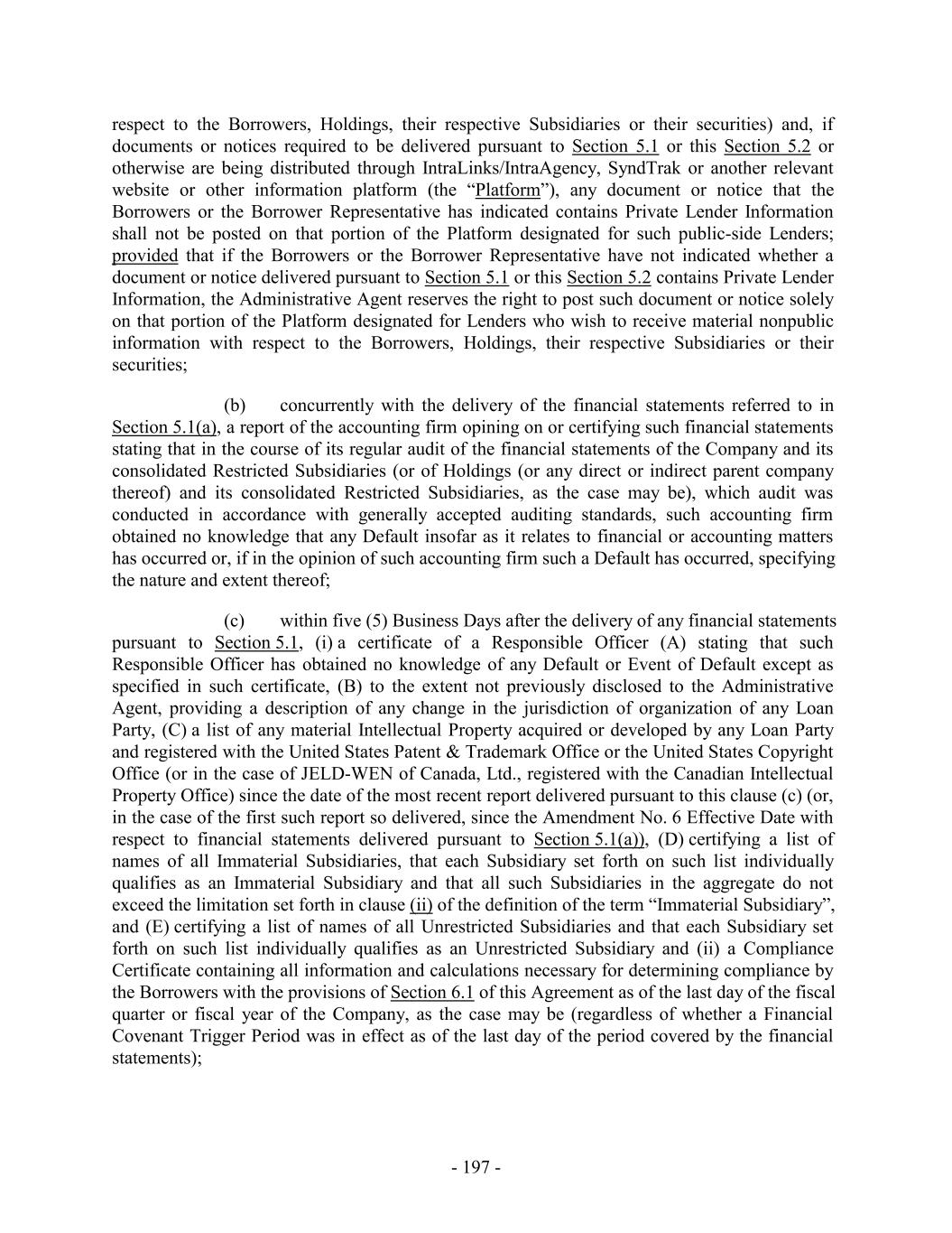 respect to the Borrowers, Holdings, their respective Subsidiaries or their securities) and, if documents or notices required to be delivered pursuant to Section 5.1 or this Section 5.2 or otherwise are being distributed through IntraLinks/IntraAgency, SyndTrak or another relevant website or other information platform (the “Platform”), any document or notice that the Borrowers or the Borrower Representative has indicated contains Private Lender Information shall not be posted on that portion of the Platform designated for such public-side Lenders; provided that if the Borrowers or the Borrower Representative have not indicated whether a document or notice delivered pursuant to Section 5.1 or this Section 5.2 contains Private Lender Information, the Administrative Agent reserves the right to post such document or notice solely on that portion of the Platform designated for Lenders who wish to receive material nonpublic information with respect to the Borrowers, Holdings, their respective Subsidiaries or their securities; (b) concurrently with the delivery of the financial statements referred to in Section 5.1(a), a report of the accounting firm opining on or certifying such financial statements stating that in the course of its regular audit of the financial statements of the Company and its consolidated Restricted Subsidiaries (or of Holdings (or any direct or indirect parent company thereof) and its consolidated Restricted Subsidiaries, as the case may be), which audit was conducted in accordance with generally accepted auditing standards, such accounting firm obtained no knowledge that any Default insofar as it relates to financial or accounting matters has occurred or, if in the opinion of such accounting firm such a Default has occurred, specifying the nature and extent thereof; (c) within five (5) Business Days after the delivery of any financial statements pursuant to Section 5.1, (i) a certificate of a Responsible Officer (A) stating that such Responsible Officer has obtained no knowledge of any Default or Event of Default except as specified in such certificate, (B) to the extent not previously disclosed to the Administrative Agent, providing a description of any change in the jurisdiction of organization of any Loan Party, (C) a list of any material Intellectual Property acquired or developed by any Loan Party and registered with the United States Patent & Trademark Office or the United States Copyright Office (or in the case of JELD-WEN of Canada, Ltd., registered with the Canadian Intellectual Property Office) since the date of the most recent report delivered pursuant to this clause (c) (or, in the case of the first such report so delivered, since the Amendment No. 6 Effective Date with respect to financial statements delivered pursuant to Section 5.1(a)), (D) certifying a list of names of all Immaterial Subsidiaries, that each Subsidiary set forth on such list individually qualifies as an Immaterial Subsidiary and that all such Subsidiaries in the aggregate do not exceed the limitation set forth in clause (ii) of the definition of the term “Immaterial Subsidiary”, and (E) certifying a list of names of all Unrestricted Subsidiaries and that each Subsidiary set forth on such list individually qualifies as an Unrestricted Subsidiary and (ii) a Compliance Certificate containing all information and calculations necessary for determining compliance by the Borrowers with the provisions of Section 6.1 of this Agreement as of the last day of the fiscal quarter or fiscal year of the Company, as the case may be (regardless of whether a Financial Covenant Trigger Period was in effect as of the last day of the period covered by the financial statements); - 197 -