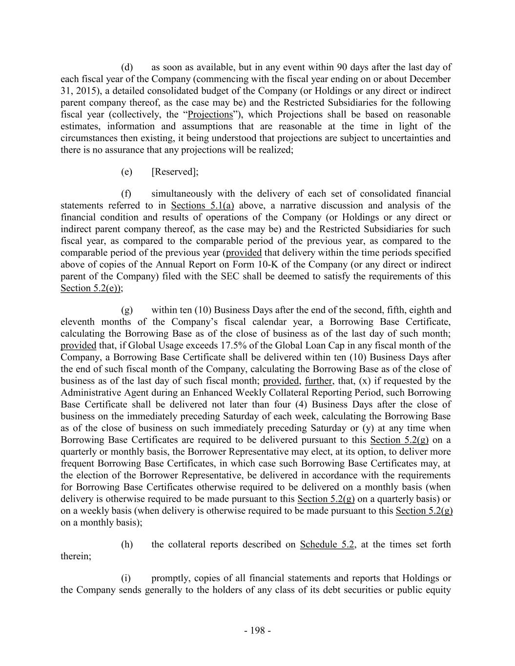 (d) as soon as available, but in any event within 90 days after the last day of each fiscal year of the Company (commencing with the fiscal year ending on or about December 31, 2015), a detailed consolidated budget of the Company (or Holdings or any direct or indirect parent company thereof, as the case may be) and the Restricted Subsidiaries for the following fiscal year (collectively, the “Projections”), which Projections shall be based on reasonable estimates, information and assumptions that are reasonable at the time in light of the circumstances then existing, it being understood that projections are subject to uncertainties and there is no assurance that any projections will be realized; (e) [Reserved]; (f) simultaneously with the delivery of each set of consolidated financial statements referred to in Sections 5.1(a) above, a narrative discussion and analysis of the financial condition and results of operations of the Company (or Holdings or any direct or indirect parent company thereof, as the case may be) and the Restricted Subsidiaries for such fiscal year, as compared to the comparable period of the previous year, as compared to the comparable period of the previous year (provided that delivery within the time periods specified above of copies of the Annual Report on Form 10-K of the Company (or any direct or indirect parent of the Company) filed with the SEC shall be deemed to satisfy the requirements of this Section 5.2(e)); (g) within ten (10) Business Days after the end of the second, fifth, eighth and eleventh months of the Company’s fiscal calendar year, a Borrowing Base Certificate, calculating the Borrowing Base as of the close of business as of the last day of such month; provided that, if Global Usage exceeds 17.5% of the Global Loan Cap in any fiscal month of the Company, a Borrowing Base Certificate shall be delivered within ten (10) Business Days after the end of such fiscal month of the Company, calculating the Borrowing Base as of the close of business as of the last day of such fiscal month; provided, further, that, (x) if requested by the Administrative Agent during an Enhanced Weekly Collateral Reporting Period, such Borrowing Base Certificate shall be delivered not later than four (4) Business Days after the close of business on the immediately preceding Saturday of each week, calculating the Borrowing Base as of the close of business on such immediately preceding Saturday or (y) at any time when Borrowing Base Certificates are required to be delivered pursuant to this Section 5.2(g) on a quarterly or monthly basis, the Borrower Representative may elect, at its option, to deliver more frequent Borrowing Base Certificates, in which case such Borrowing Base Certificates may, at the election of the Borrower Representative, be delivered in accordance with the requirements for Borrowing Base Certificates otherwise required to be delivered on a monthly basis (when delivery is otherwise required to be made pursuant to this Section 5.2(g) on a quarterly basis) or on a weekly basis (when delivery is otherwise required to be made pursuant to this Section 5.2(g) on a monthly basis); (h) the collateral reports described on Schedule 5.2, at the times set forth therein; (i) promptly, copies of all financial statements and reports that Holdings or the Company sends generally to the holders of any class of its debt securities or public equity - 198 -