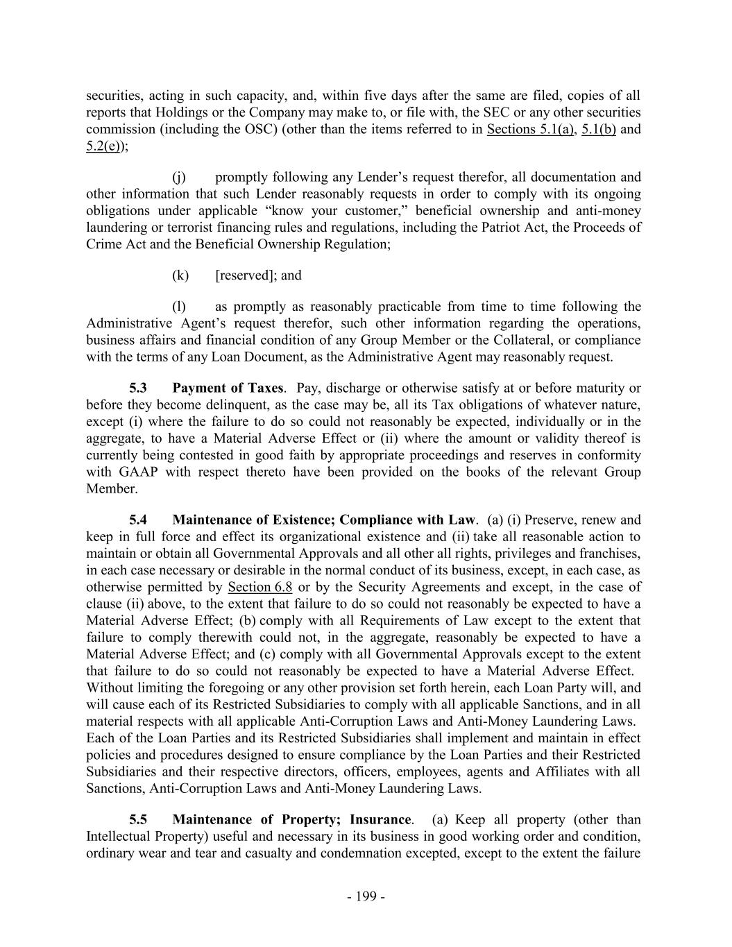 securities, acting in such capacity, and, within five days after the same are filed, copies of all reports that Holdings or the Company may make to, or file with, the SEC or any other securities commission (including the OSC) (other than the items referred to in Sections 5.1(a), 5.1(b) and 5.2(e)); (j) promptly following any Lender’s request therefor, all documentation and other information that such Lender reasonably requests in order to comply with its ongoing obligations under applicable “know your customer,” beneficial ownership and anti-money laundering or terrorist financing rules and regulations, including the Patriot Act, the Proceeds of Crime Act and the Beneficial Ownership Regulation; (k) [reserved]; and (l) as promptly as reasonably practicable from time to time following the Administrative Agent’s request therefor, such other information regarding the operations, business affairs and financial condition of any Group Member or the Collateral, or compliance with the terms of any Loan Document, as the Administrative Agent may reasonably request. 5.3 Payment of Taxes. Pay, discharge or otherwise satisfy at or before maturity or before they become delinquent, as the case may be, all its Tax obligations of whatever nature, except (i) where the failure to do so could not reasonably be expected, individually or in the aggregate, to have a Material Adverse Effect or (ii) where the amount or validity thereof is currently being contested in good faith by appropriate proceedings and reserves in conformity with GAAP with respect thereto have been provided on the books of the relevant Group Member. 5.4 Maintenance of Existence; Compliance with Law. (a) (i) Preserve, renew and keep in full force and effect its organizational existence and (ii) take all reasonable action to maintain or obtain all Governmental Approvals and all other all rights, privileges and franchises, in each case necessary or desirable in the normal conduct of its business, except, in each case, as otherwise permitted by Section 6.8 or by the Security Agreements and except, in the case of clause (ii) above, to the extent that failure to do so could not reasonably be expected to have a Material Adverse Effect; (b) comply with all Requirements of Law except to the extent that failure to comply therewith could not, in the aggregate, reasonably be expected to have a Material Adverse Effect; and (c) comply with all Governmental Approvals except to the extent that failure to do so could not reasonably be expected to have a Material Adverse Effect. Without limiting the foregoing or any other provision set forth herein, each Loan Party will, and will cause each of its Restricted Subsidiaries to comply with all applicable Sanctions, and in all material respects with all applicable Anti-Corruption Laws and Anti-Money Laundering Laws. Each of the Loan Parties and its Restricted Subsidiaries shall implement and maintain in effect policies and procedures designed to ensure compliance by the Loan Parties and their Restricted Subsidiaries and their respective directors, officers, employees, agents and Affiliates with all Sanctions, Anti-Corruption Laws and Anti-Money Laundering Laws. 5.5 Maintenance of Property; Insurance. (a) Keep all property (other than Intellectual Property) useful and necessary in its business in good working order and condition, ordinary wear and tear and casualty and condemnation excepted, except to the extent the failure - 199 -